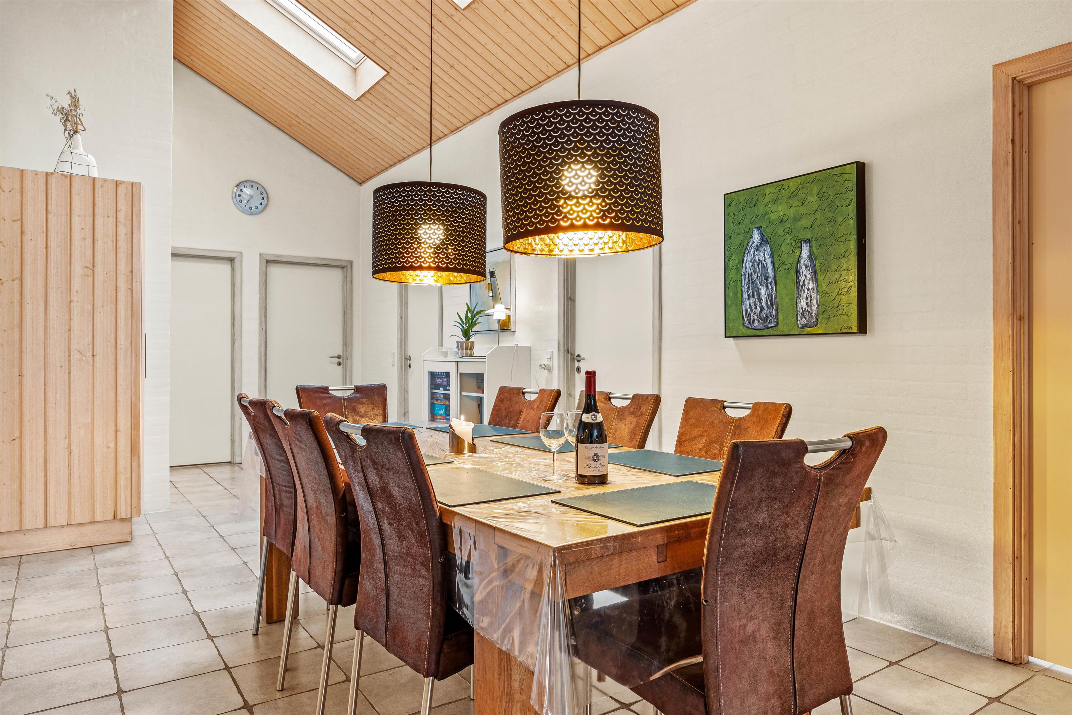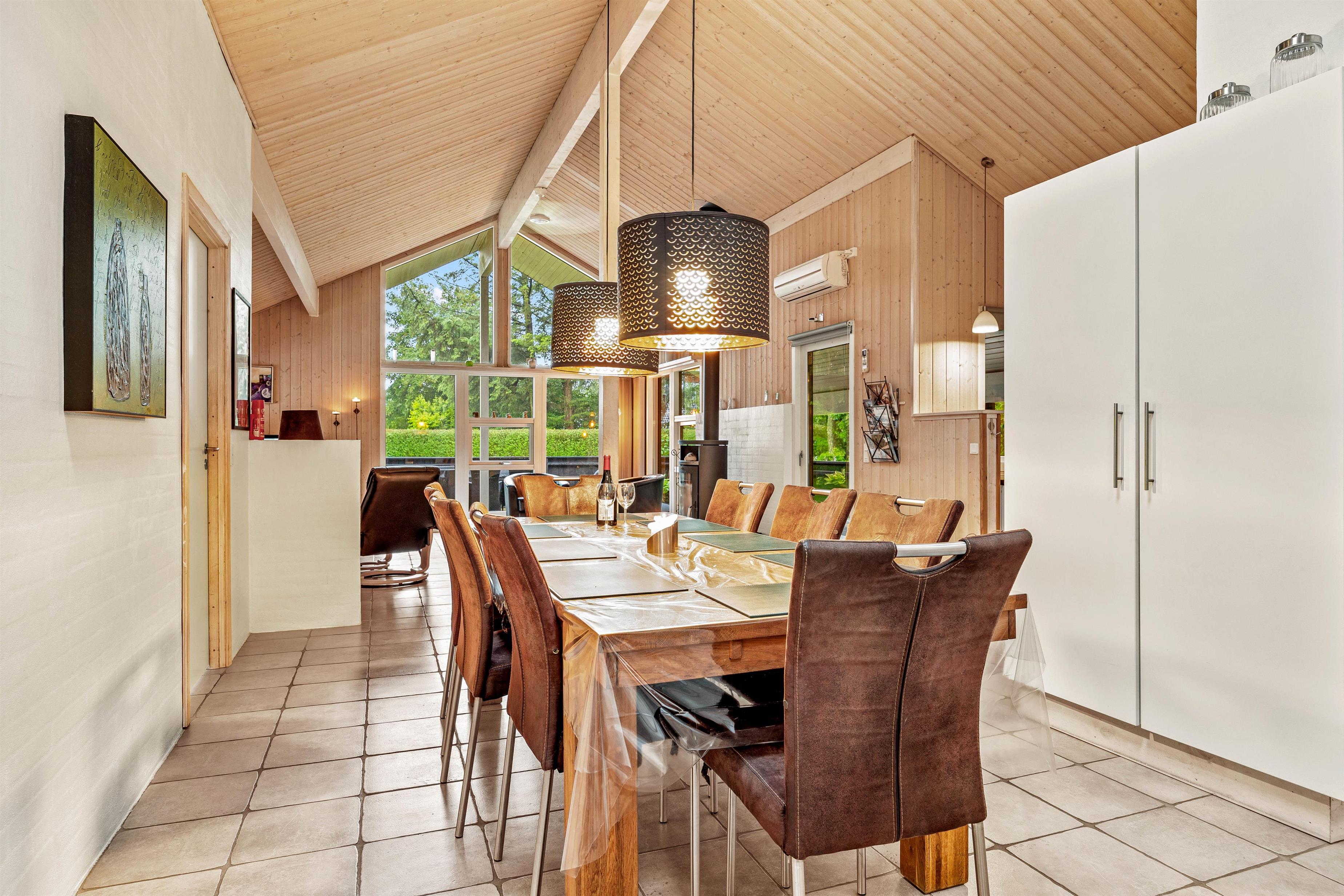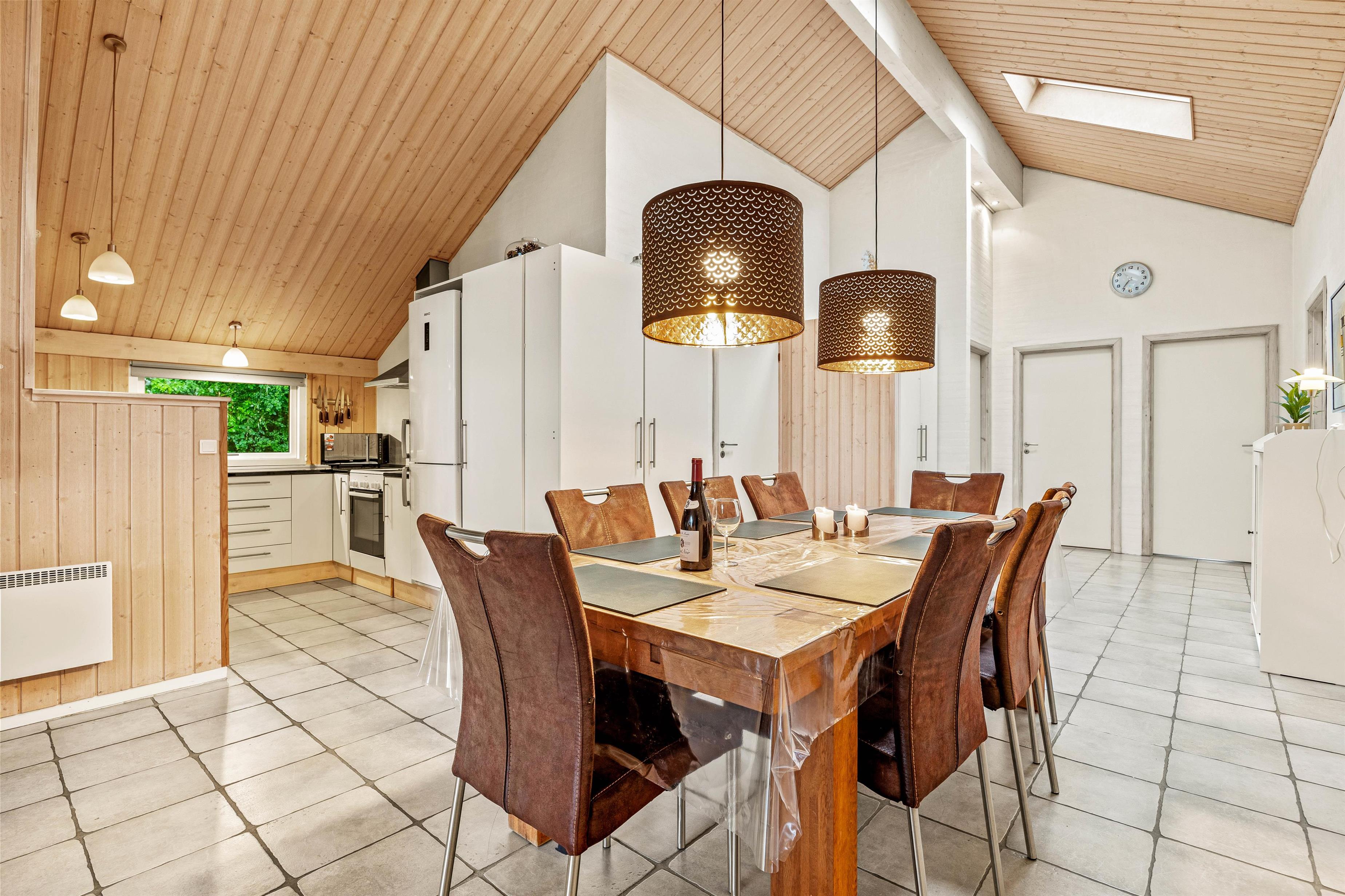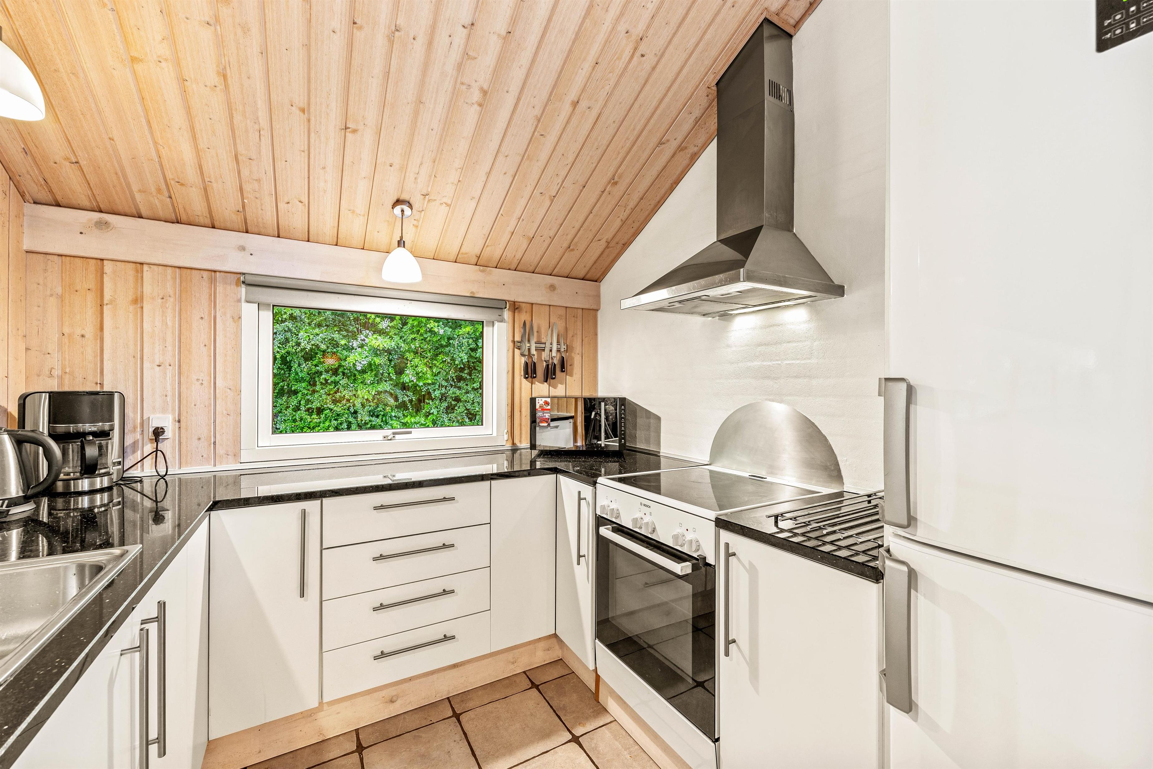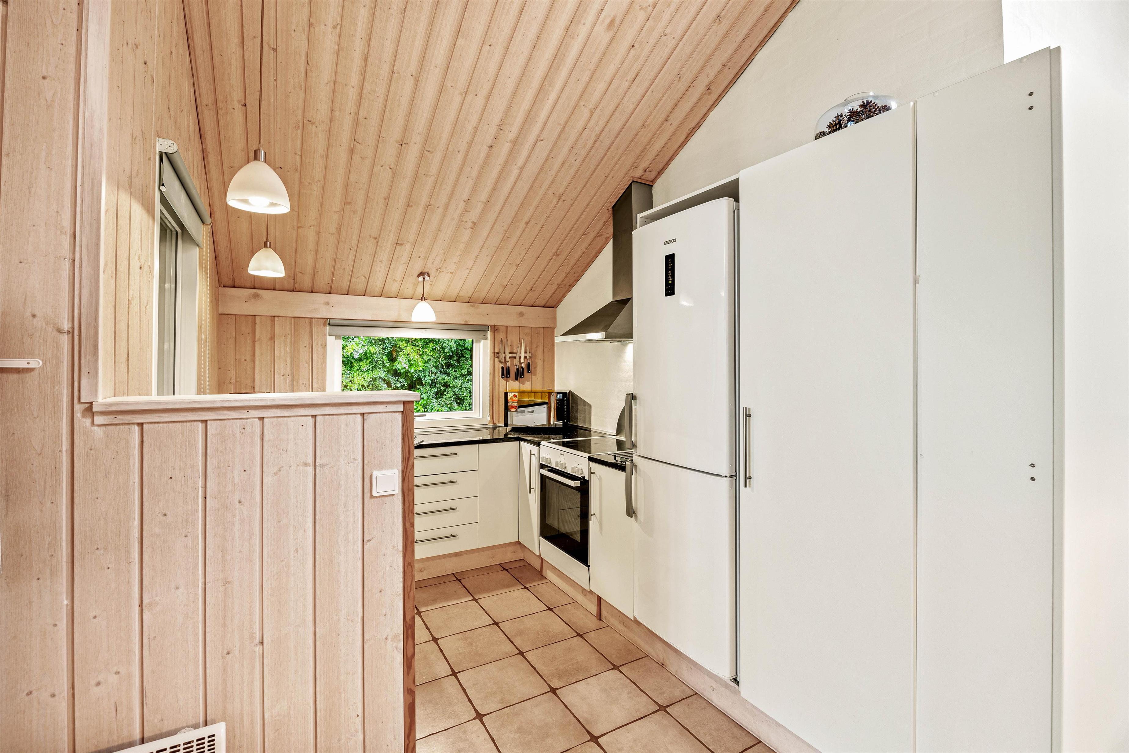 Dette klassisk moderne sommerhus byder på en lys og rummelig indretning med plads til hele familien. Der er højt til loftet og store vinduer, som sikrer masser af naturligt lys i alle rum. Køkkenet fungerer som samlingspunktet i sommerhuset og er perfekt til fælles madlavning. Herfra kan samtalen let fortsætte hen til spisebordet, hvor nogle måske er i fuld gang med dagens brætspil. Køkkenet er praktisk udstyret med en opvaskemaskine, der gør oprydningen nem.