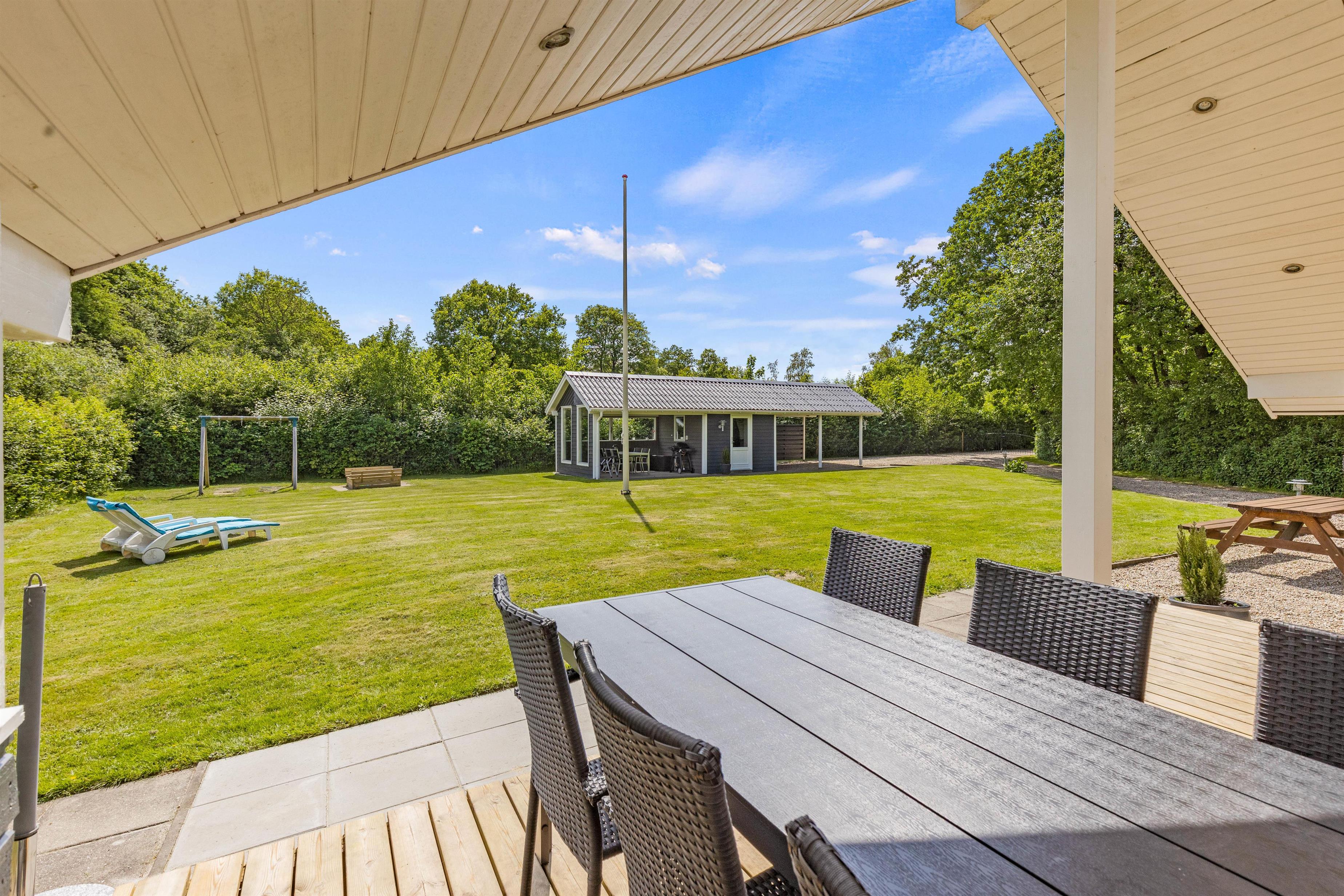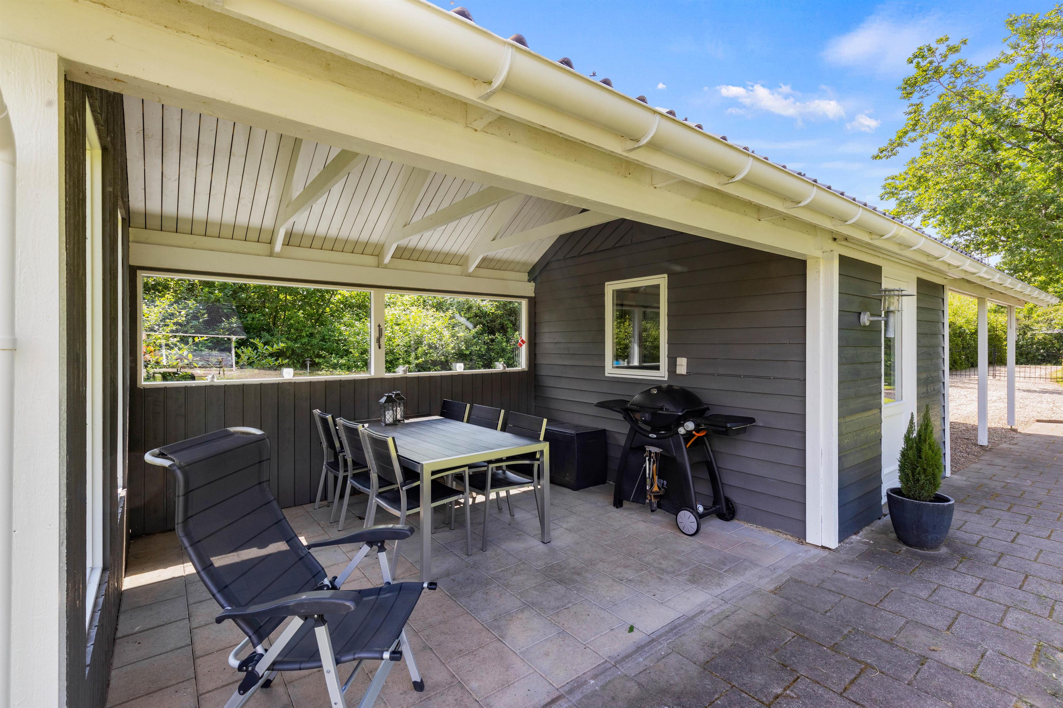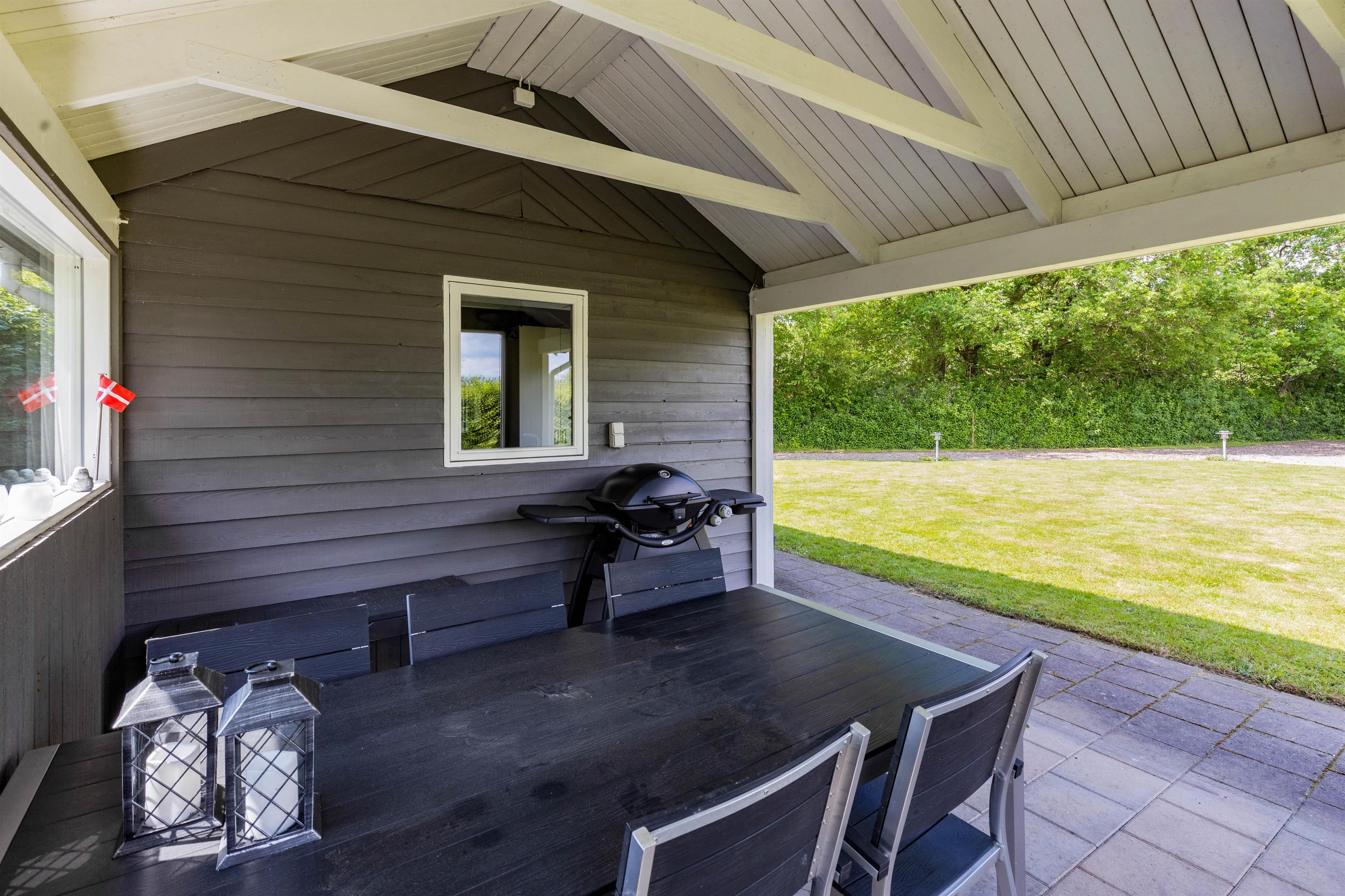 Terrassen er overdækket, så I kan nyde skyggen på de solrige dage og være i tørvejr, hvis det skulle dryppe. Her kan I nyde havemøblerne og tilberede en masse lækre måltider på gasgrillen, der hurtigt bliver varm.