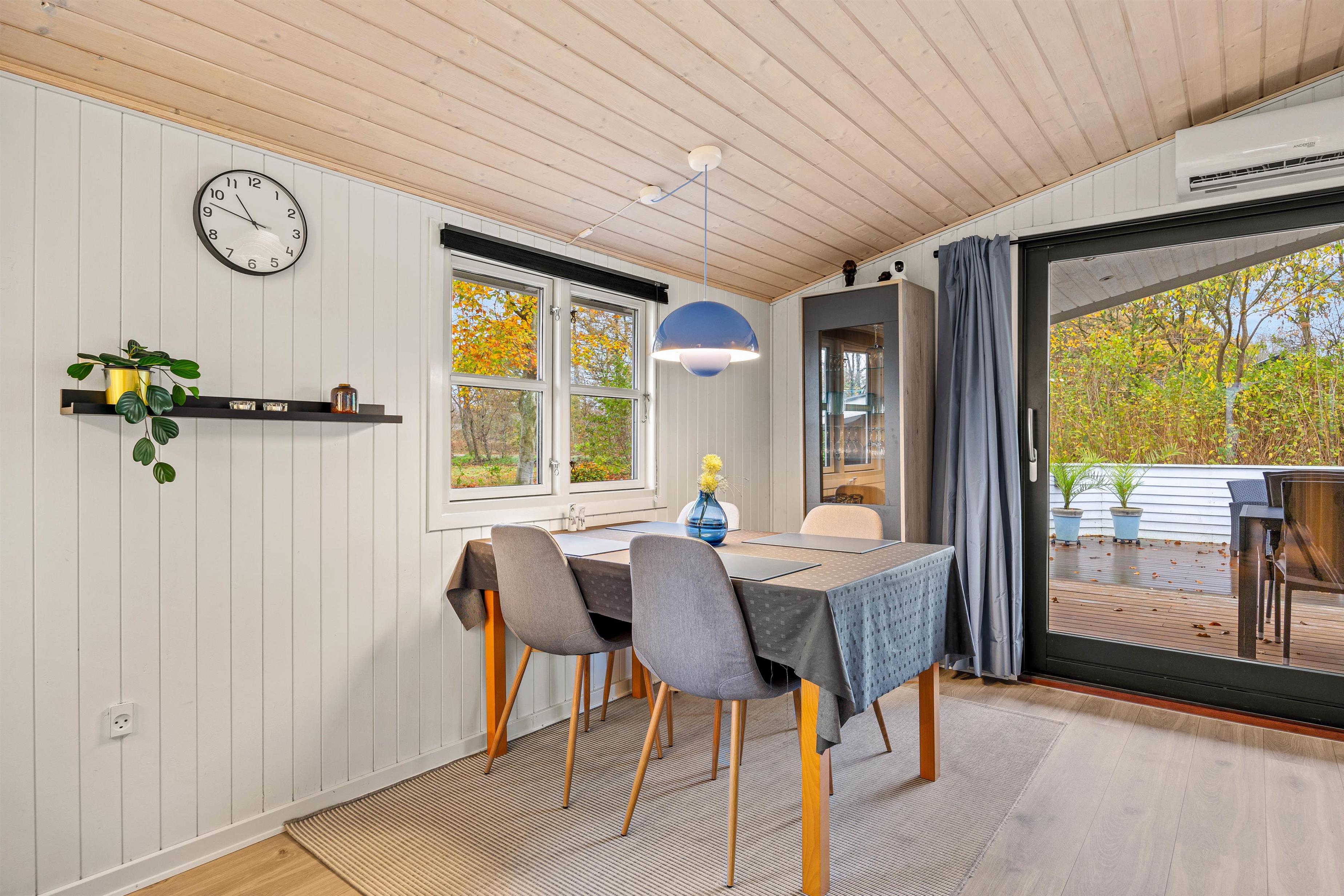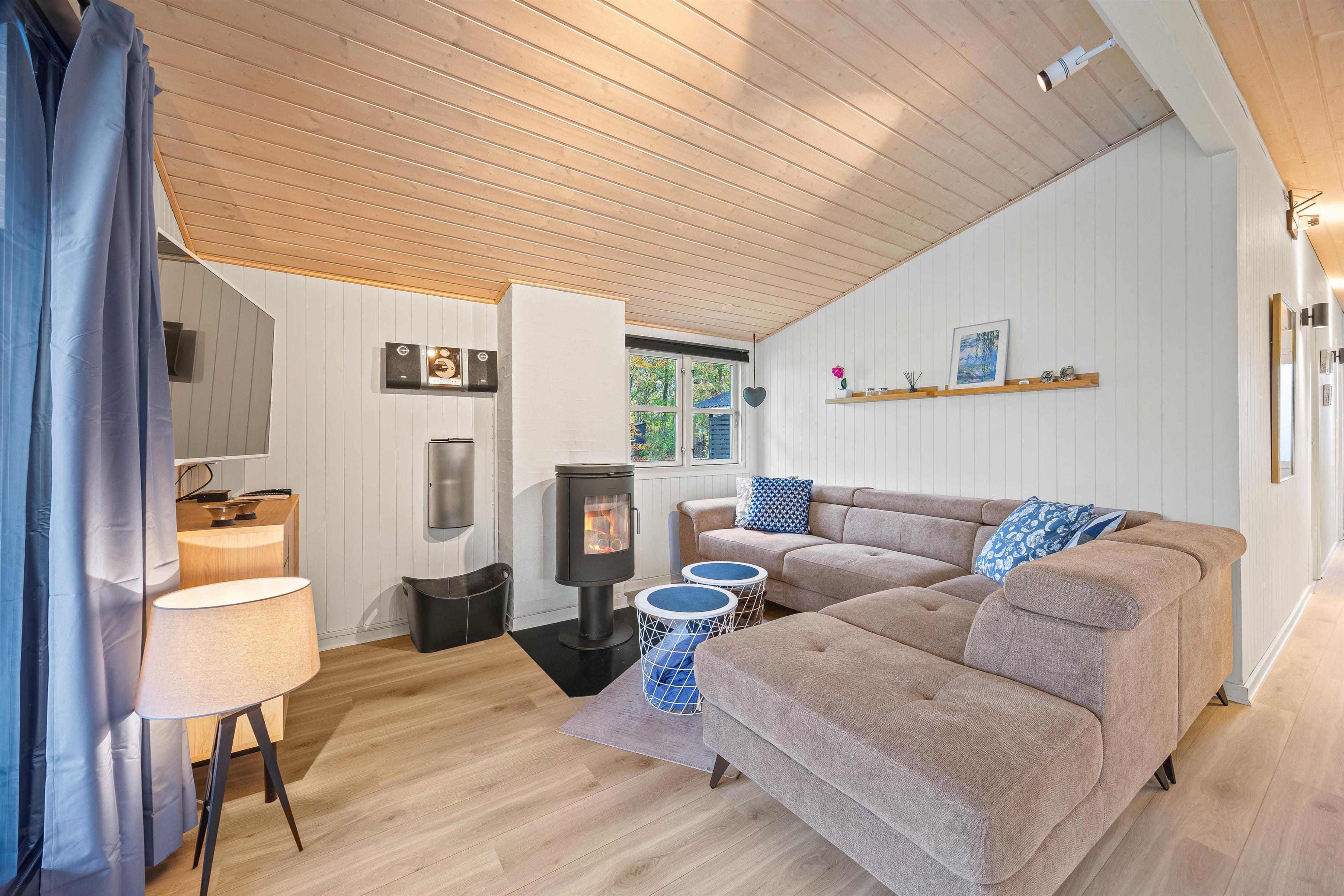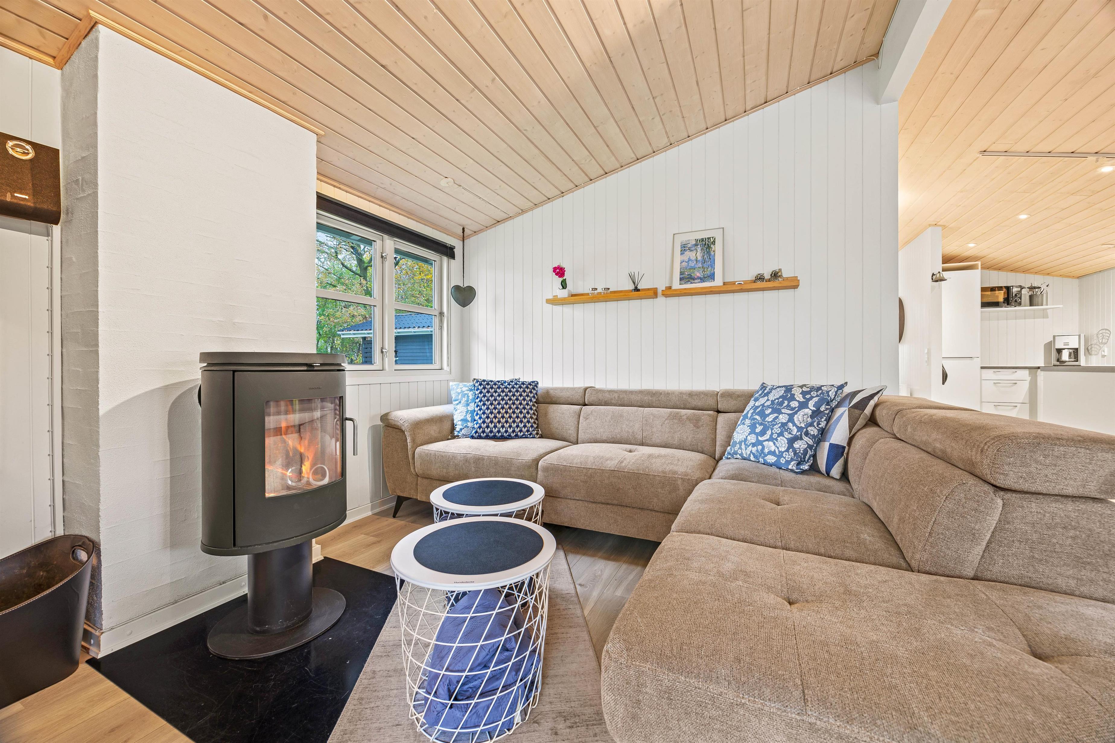 Sommerhusets åbne planløsning skaber en rummelig og indbydende atmosfære, der gør det let at lade samtaler flyde fra madlavningen i køkkenet til hyggelige brætspil ved spisebordet. En stor og blød sofa inviterer til afslapning og hyggestunder foran den dejlige brændeovn, som tilføjer ægte sommerhusstemning med sin varme atmosfære.