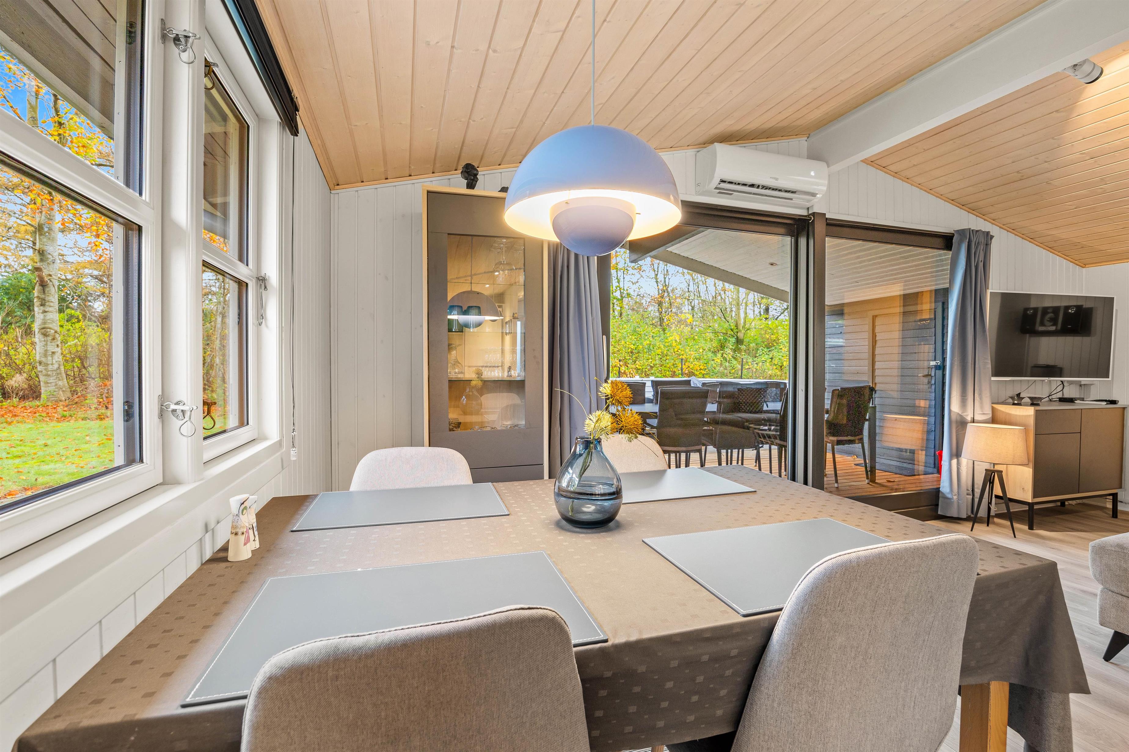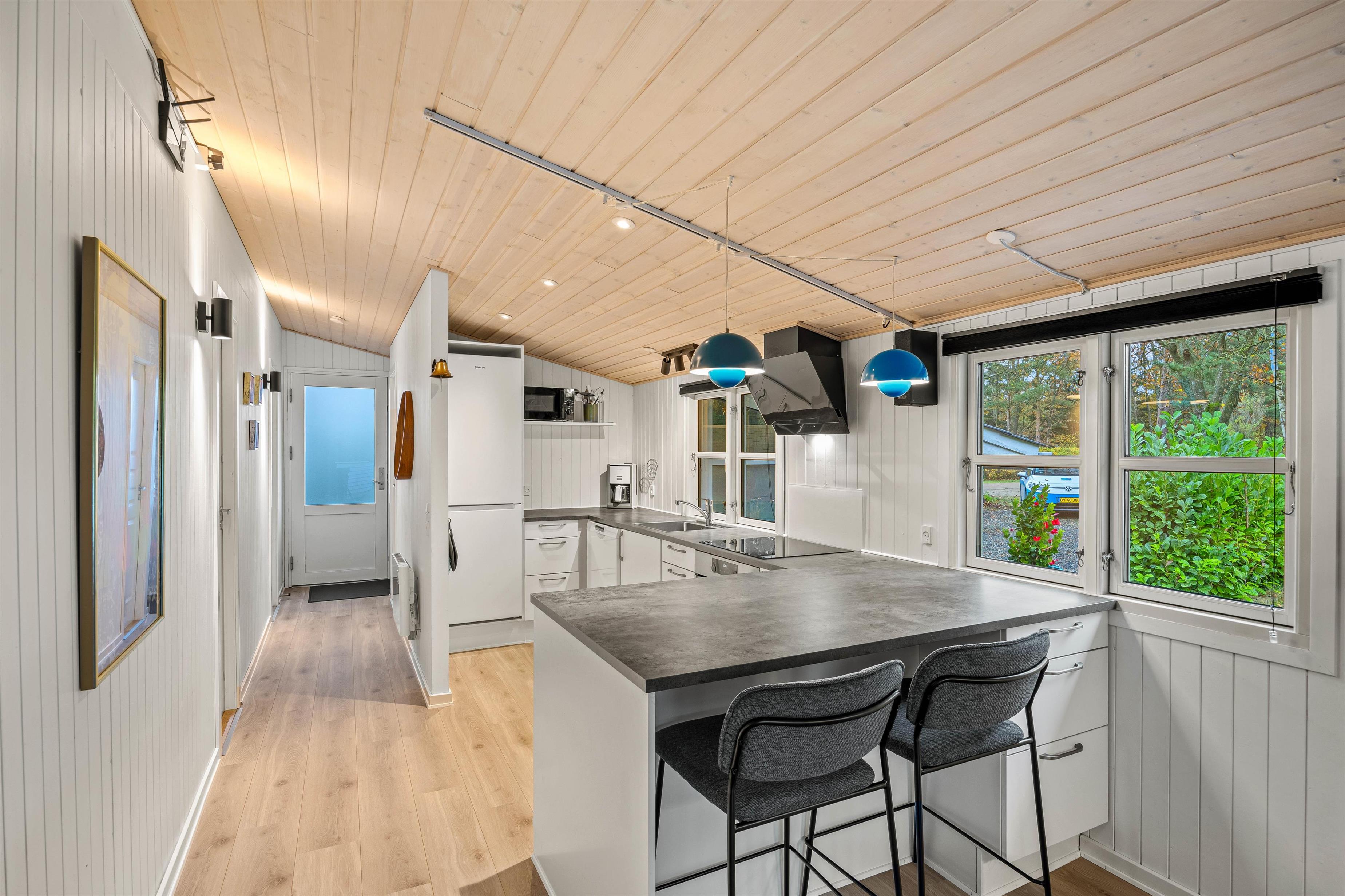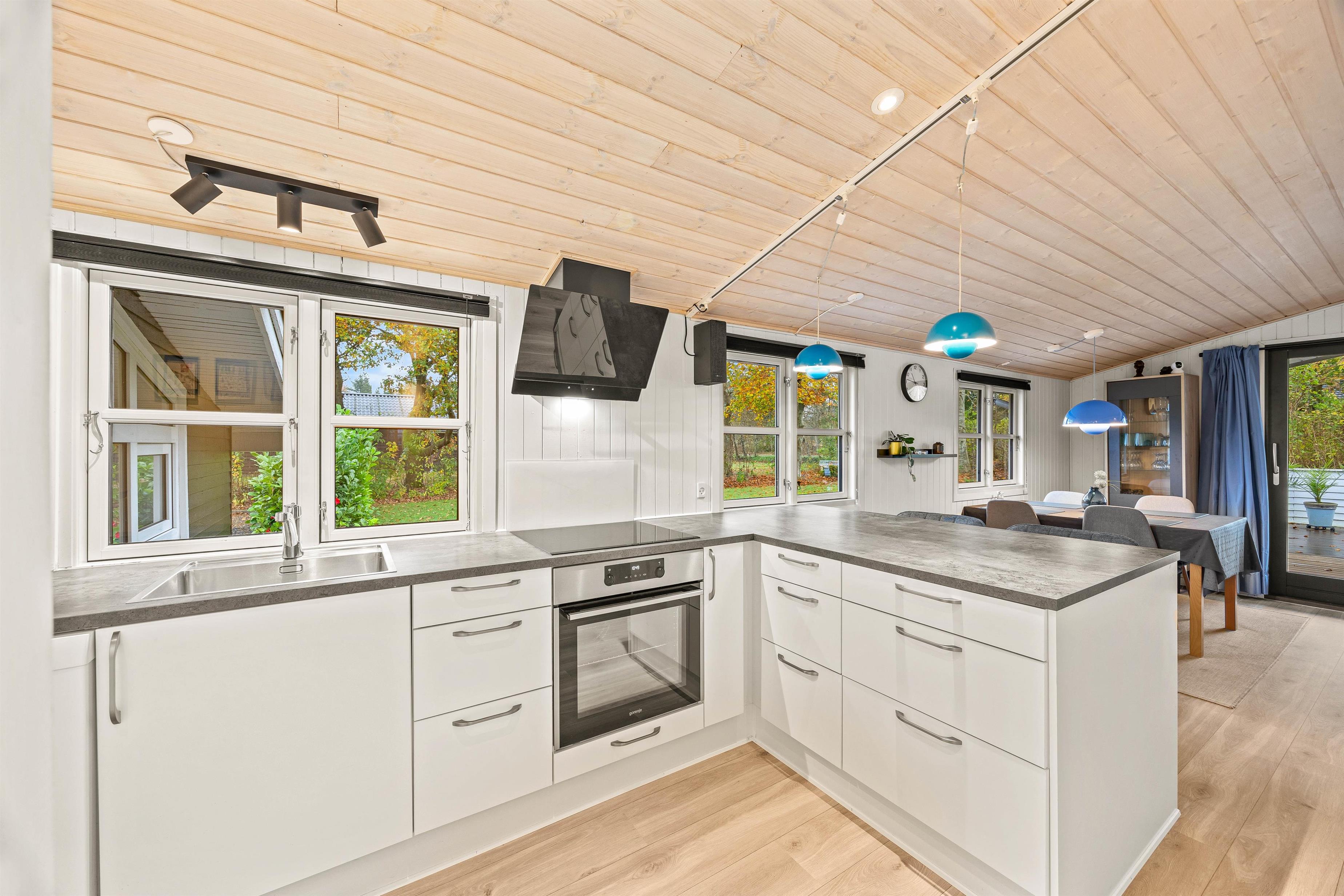 Sommerhusets åbne planløsning skaber en rummelig og indbydende atmosfære, der gør det let at lade samtaler flyde fra madlavningen i køkkenet til hyggelige brætspil ved spisebordet. En stor og blød sofa inviterer til afslapning og hyggestunder foran den dejlige brændeovn, som tilføjer ægte sommerhusstemning med sin varme atmosfære.