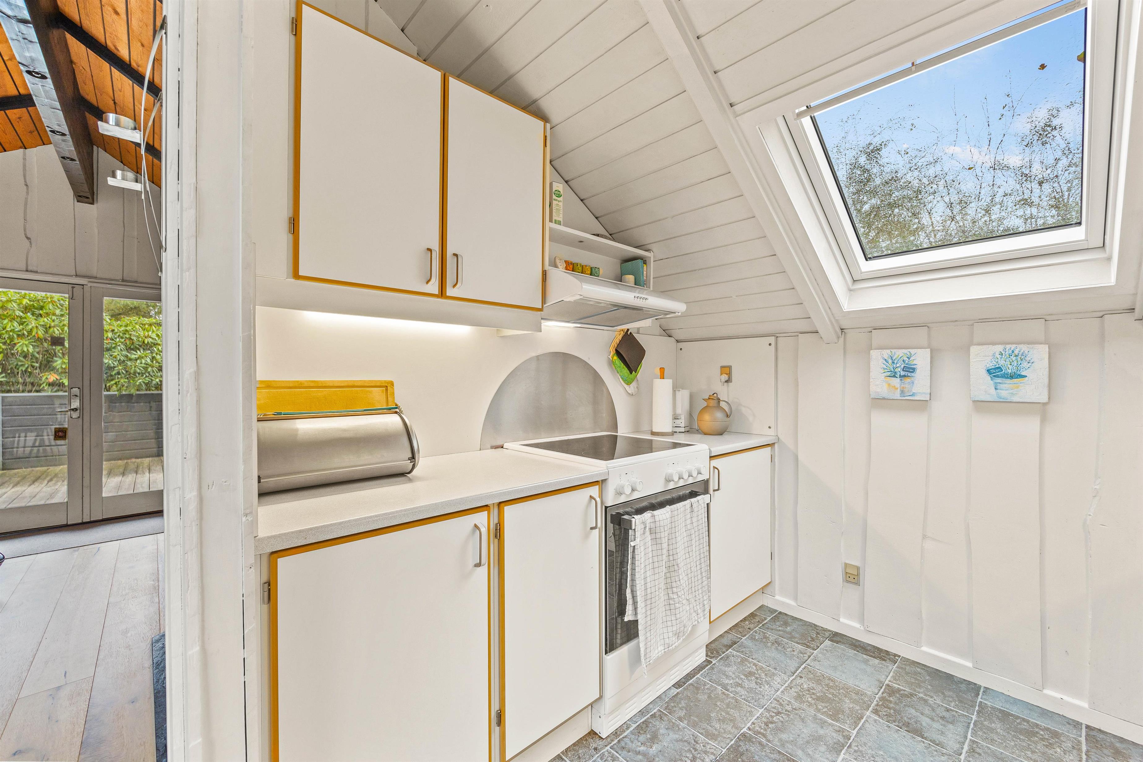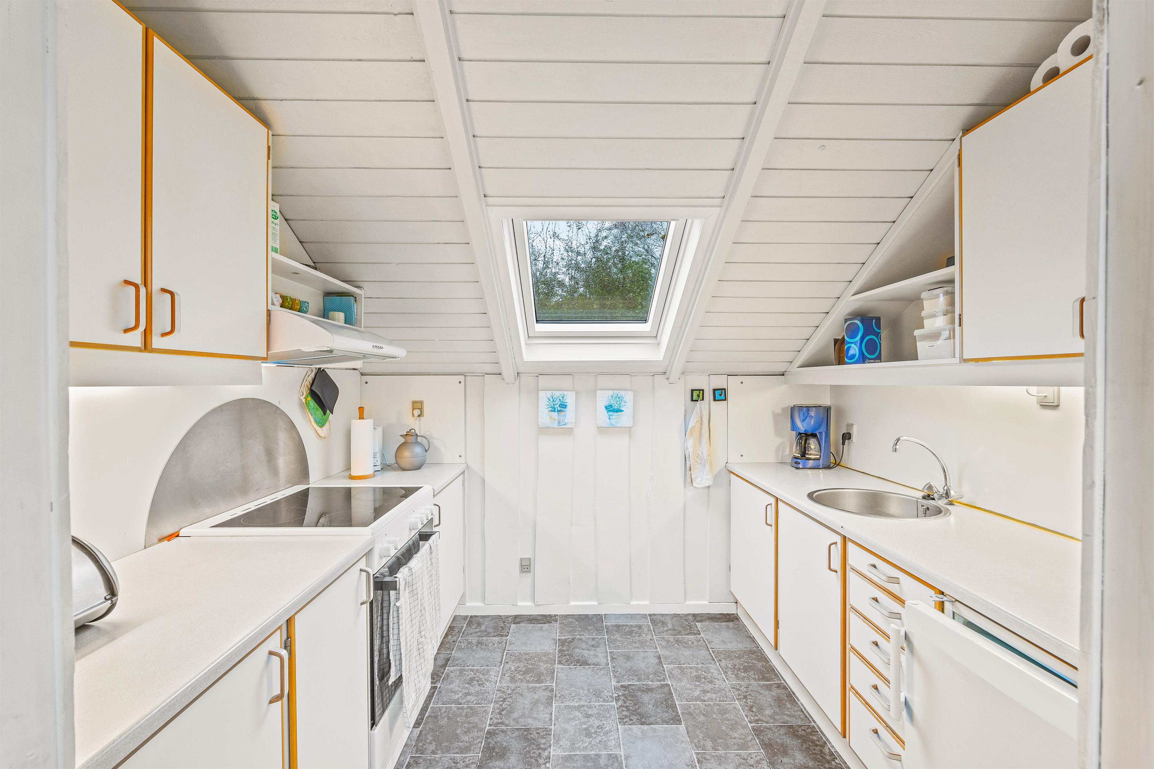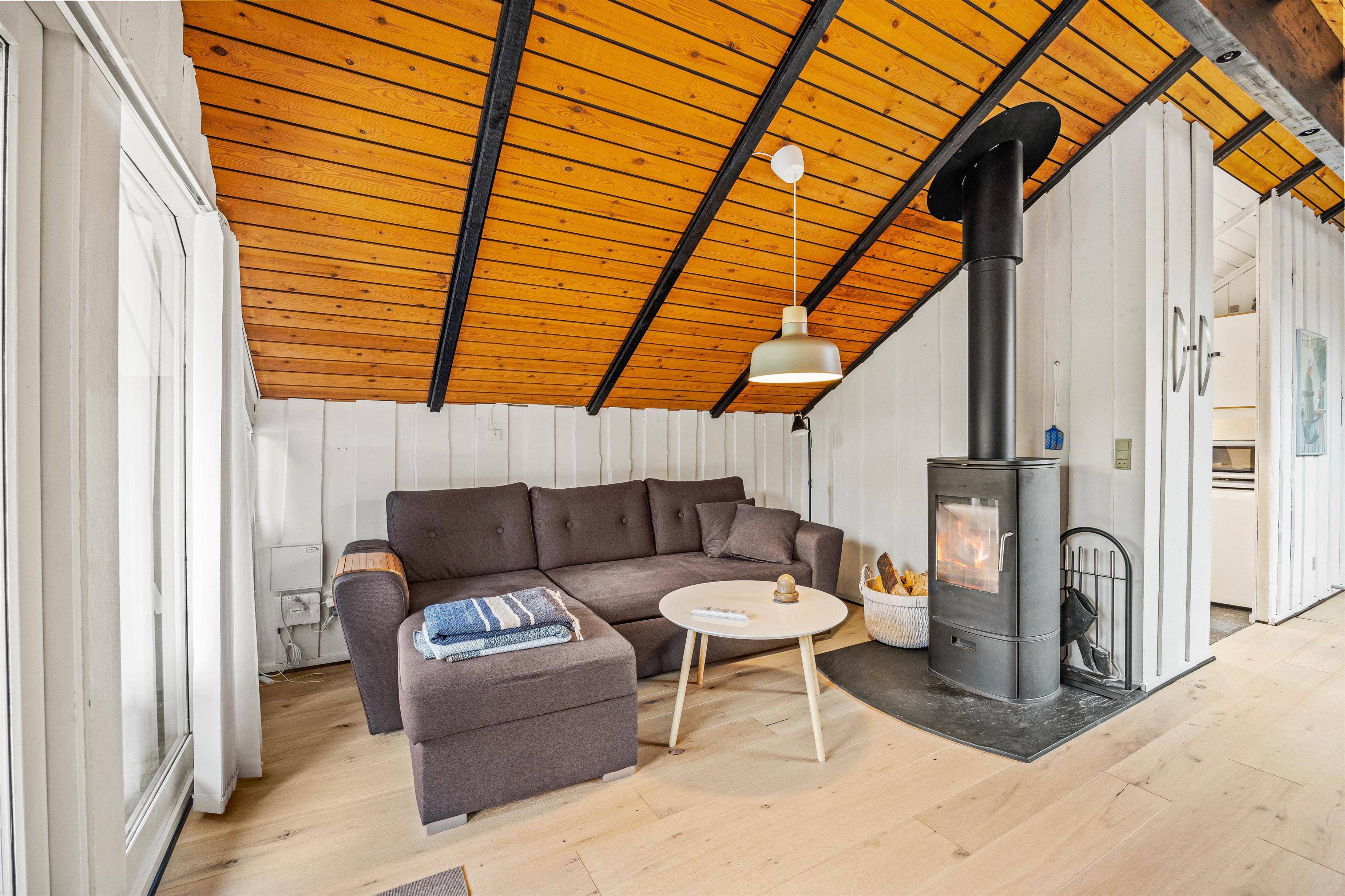 Feriehuset er klassisk indrettet med komfortable møbler, og et godt lysindfald fra de mange ovenlysvinduer. I stuen søger brændeovnen for en hyggelig atmosfære og en god varme. I det veludstyrede køkken har I god plads til at tilberede delikate måltider, som I kan nyde omkring spisebordet, opvaskemaskinen sørger for resten.