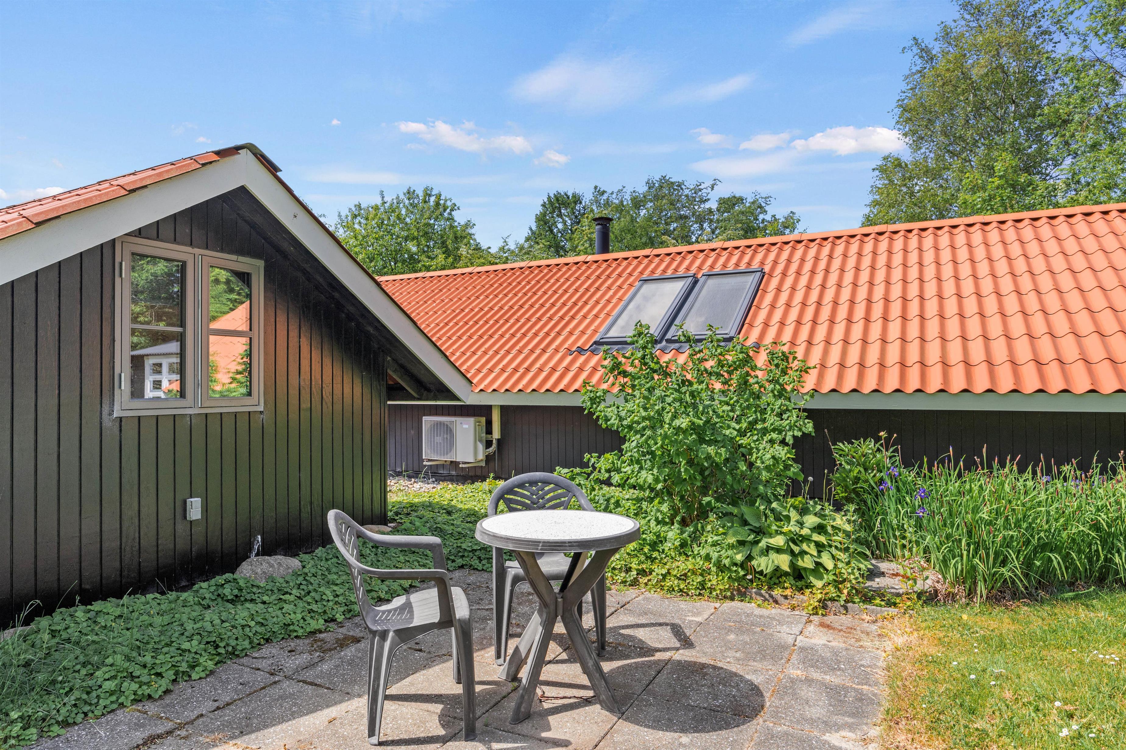 Sommerhusets udemiljø er designet til at maksimere udendørslivet og skabe en afslappende atmosfære. Den store afskærmede terrasse er perfekt til hyggelige middage under åben himmel, mens den overdækkede del sikrer, at I kan nyde jeres måltider uanset vejret.