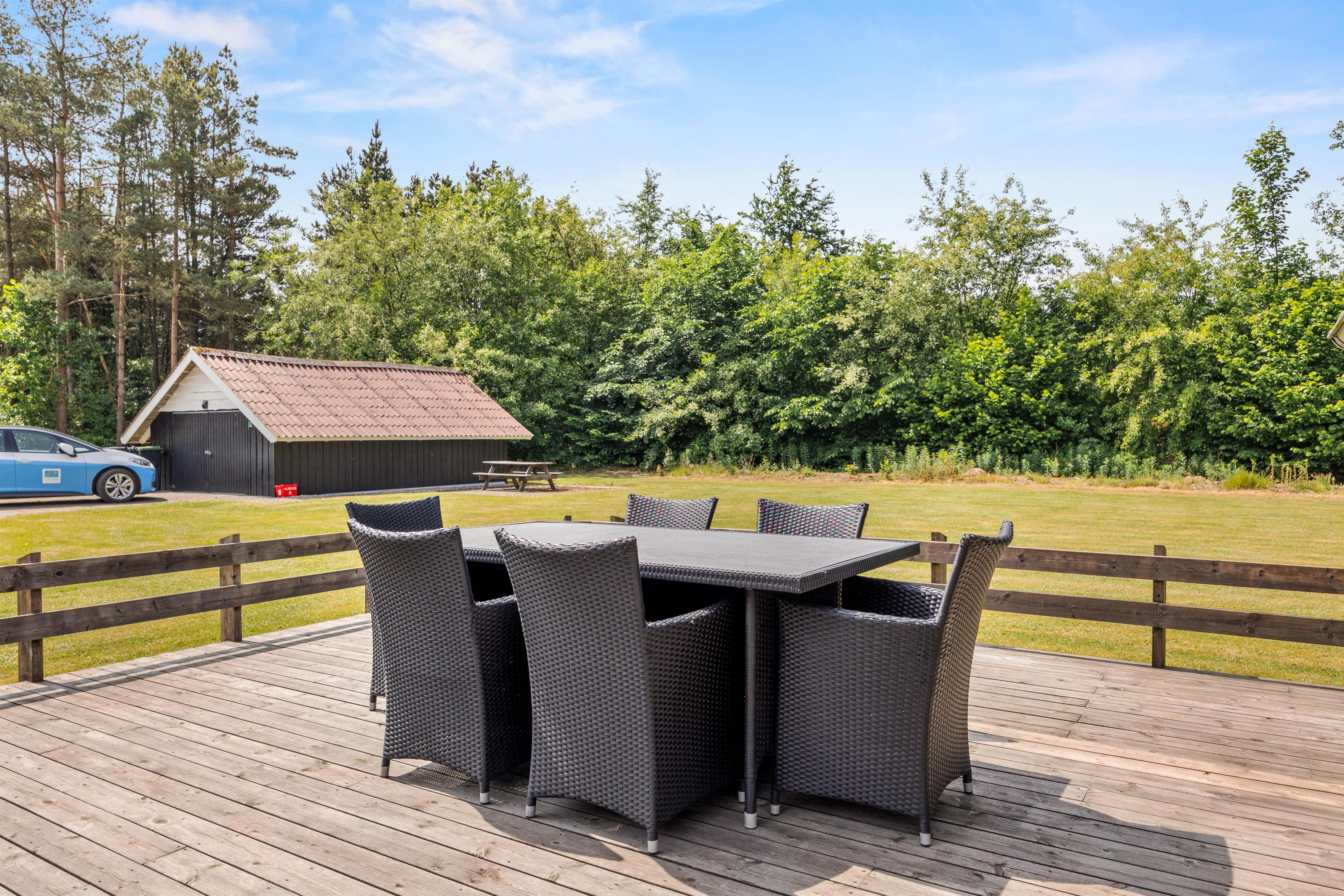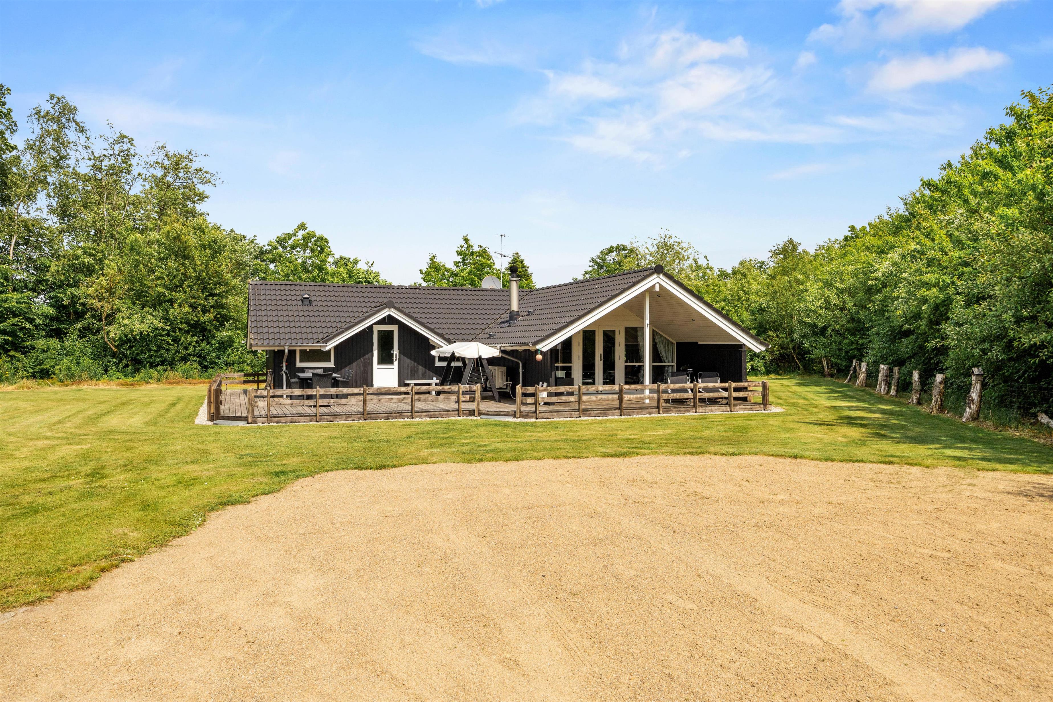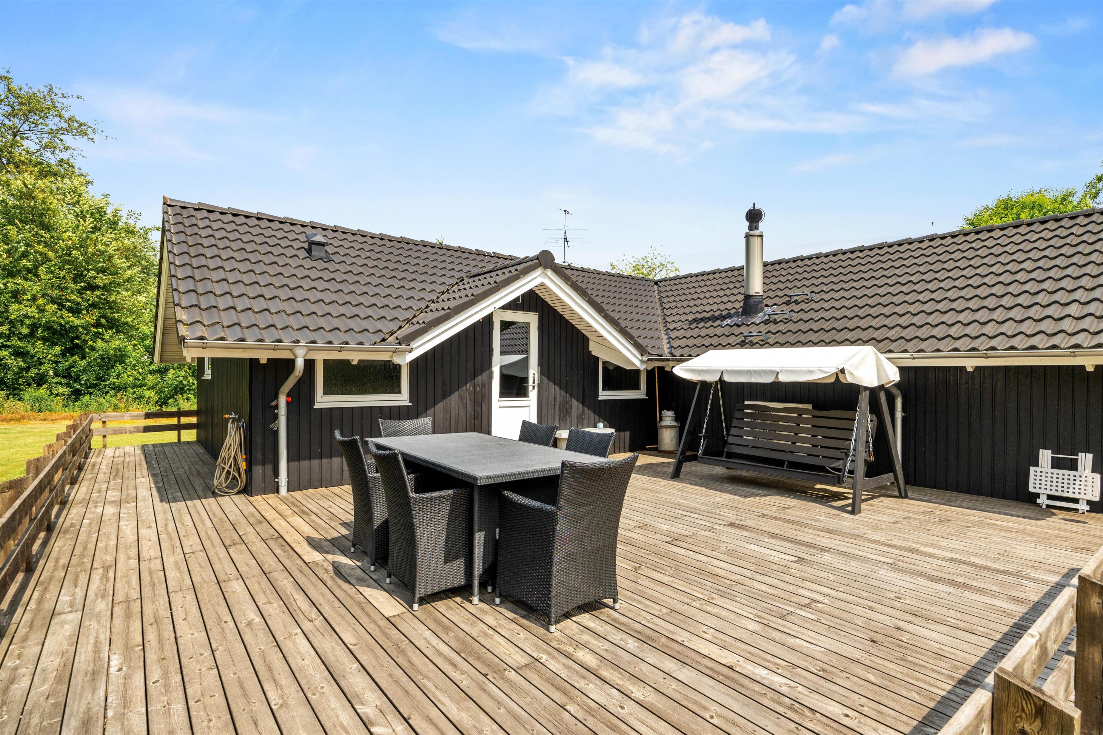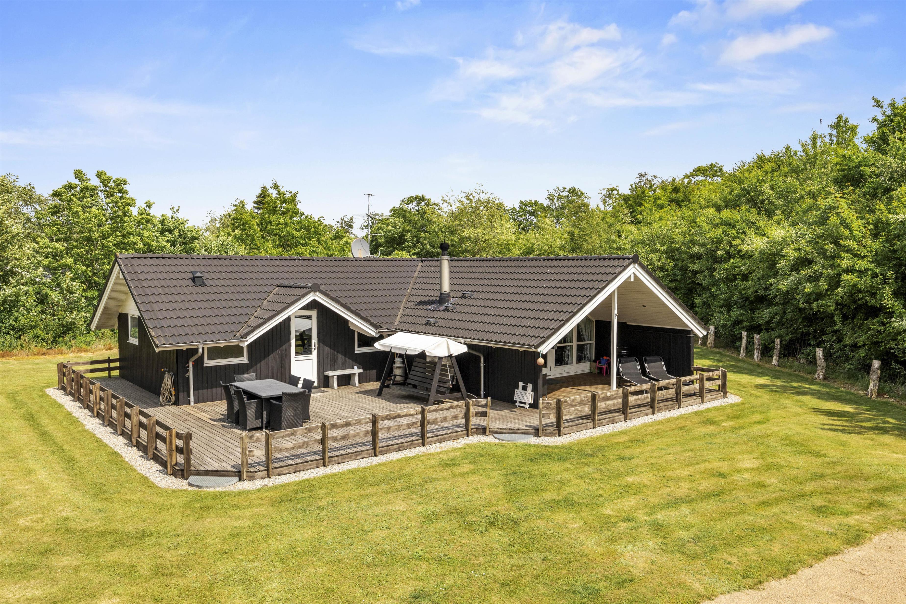 Når solen står højt på himlen, inviterer sommerhuset til udendørs liv og oplevelser i skønne omgivelser. Med både en overdækket og en afskærmet terrasse kan I nyde det danske sommervejr uanset vind og vejr. Terrasserne er udstyret med skønne havemøbler, så I kan slå jer ned med en god bog eller nyde en vidunderlig grillmiddag, som kan tilberedes på sommerhusets grillfaciliteter. Den rummelige plænegrund er perfekt for udendørs spil og aktiviteter for både børn og voksne, hvor I samtidig kan nyde synet af den smukke naturgrund, der omgiver sommerhuset.