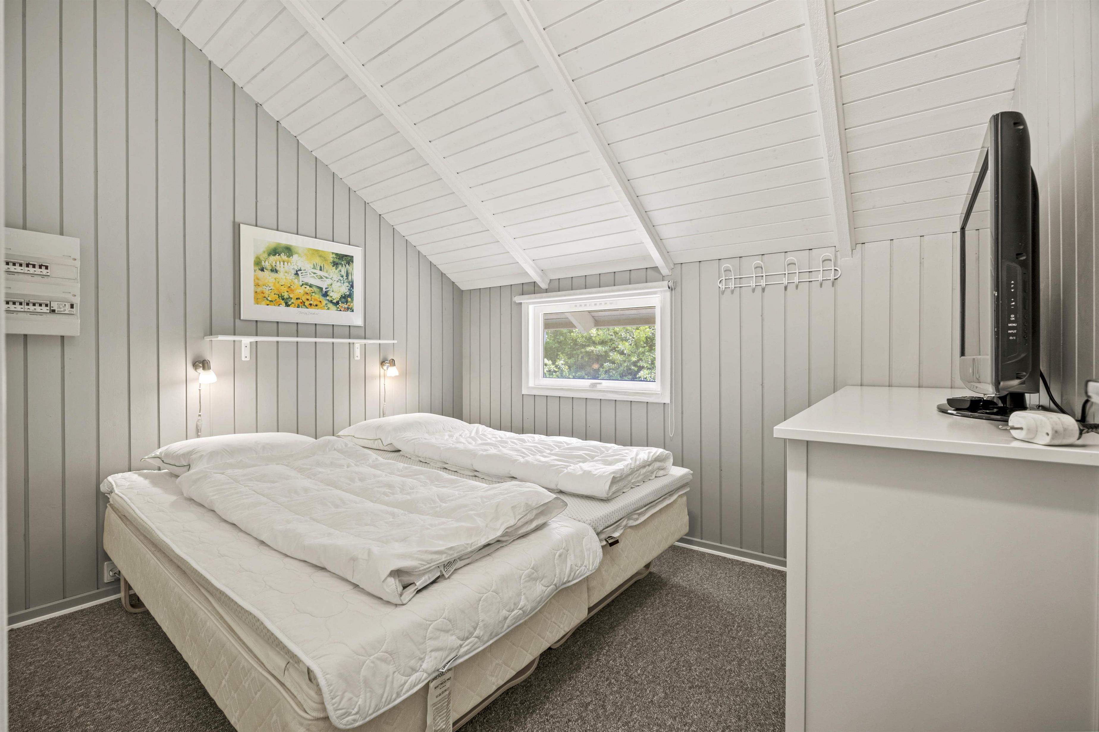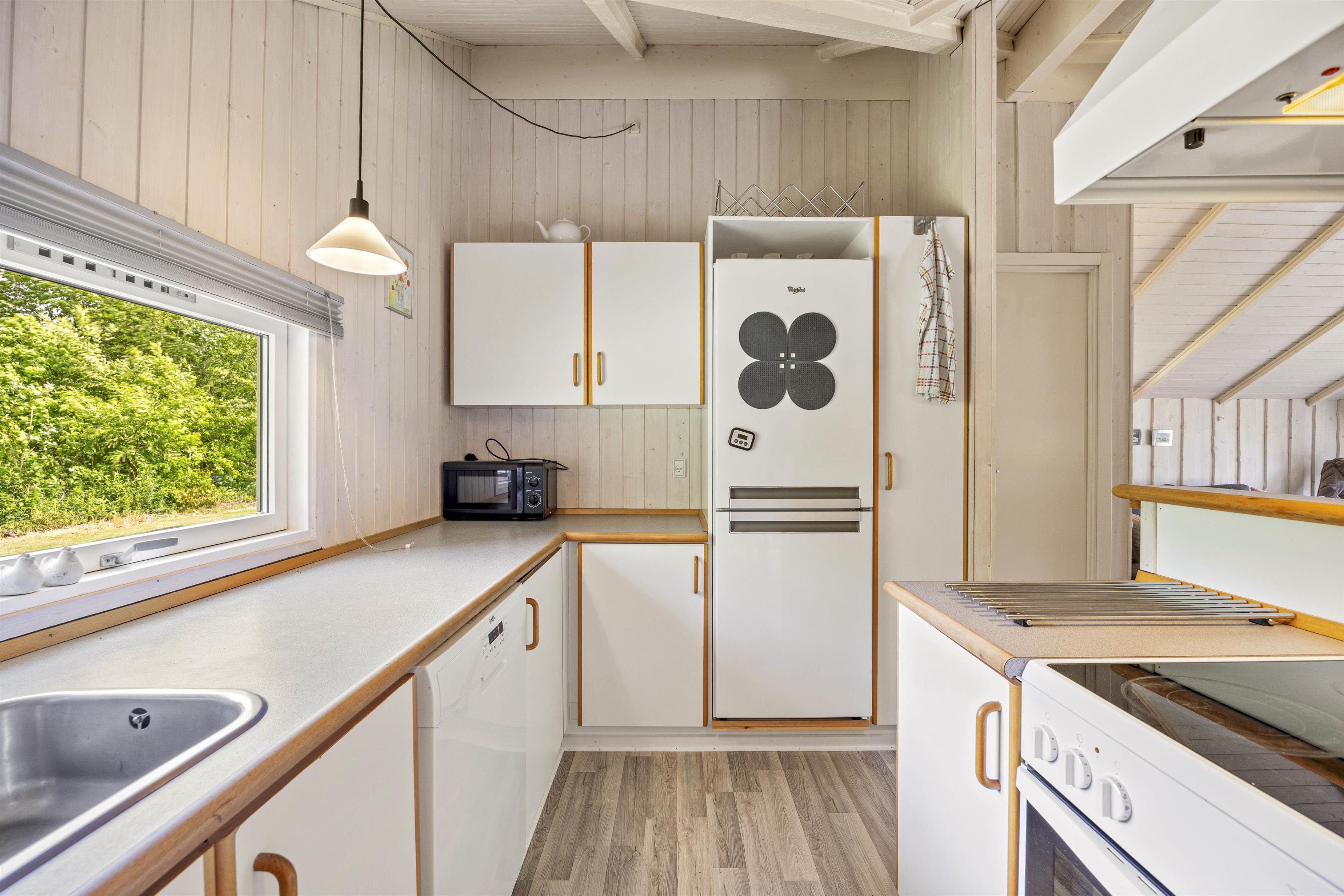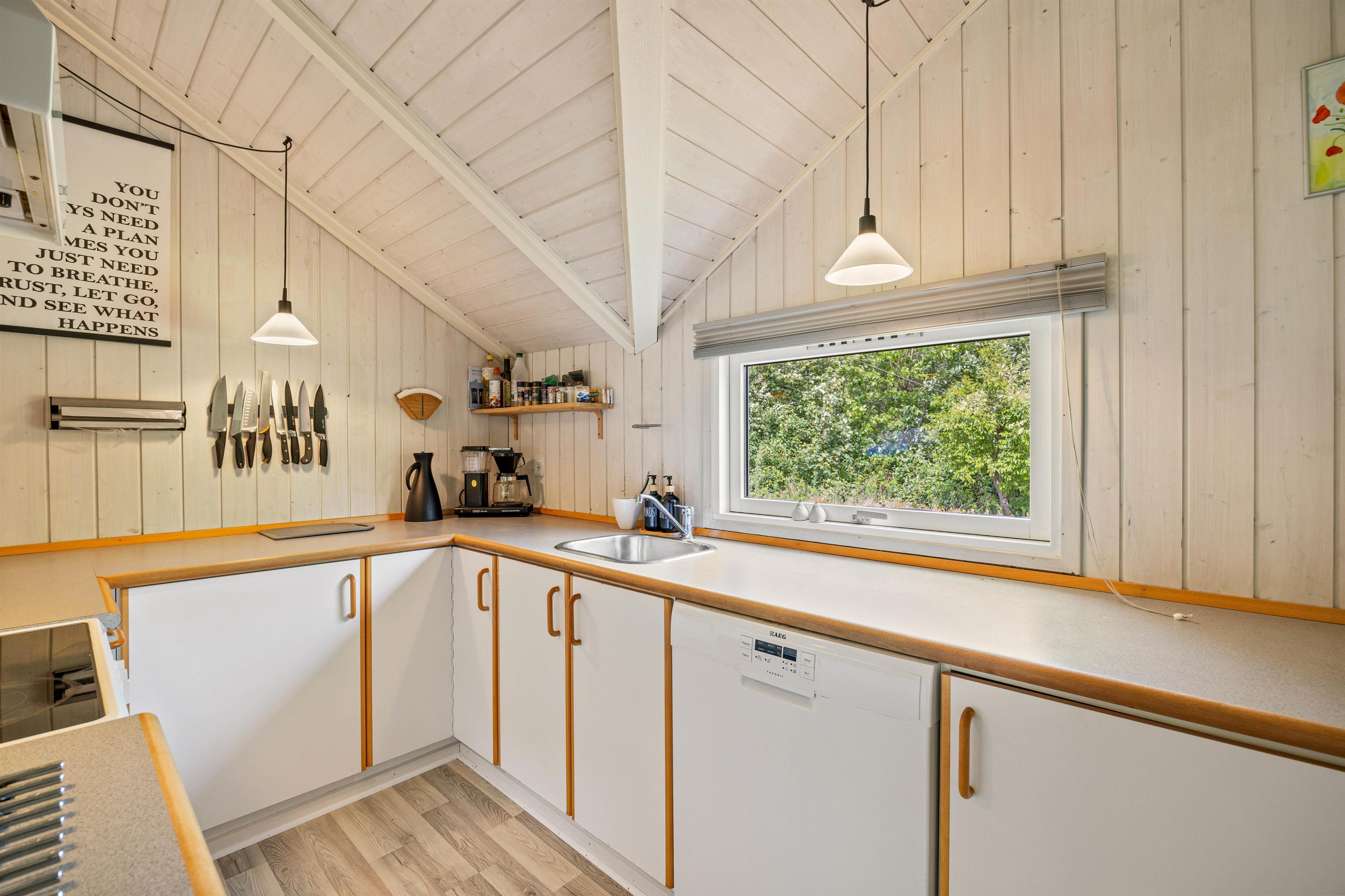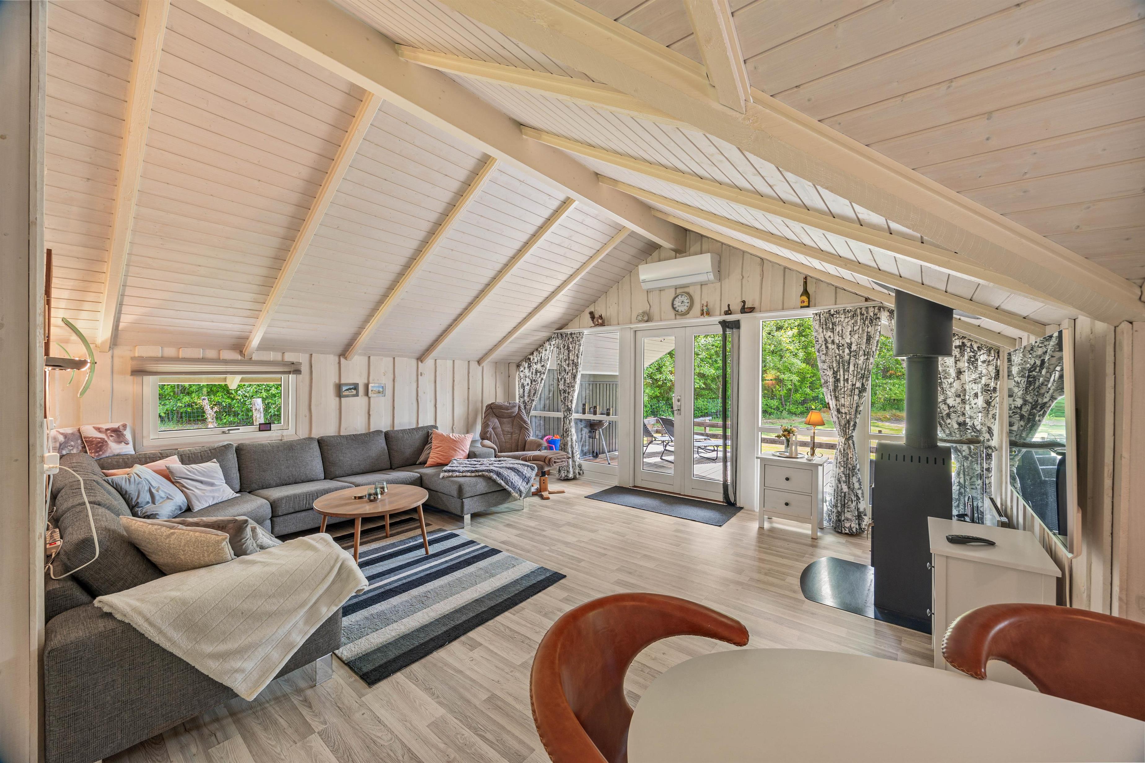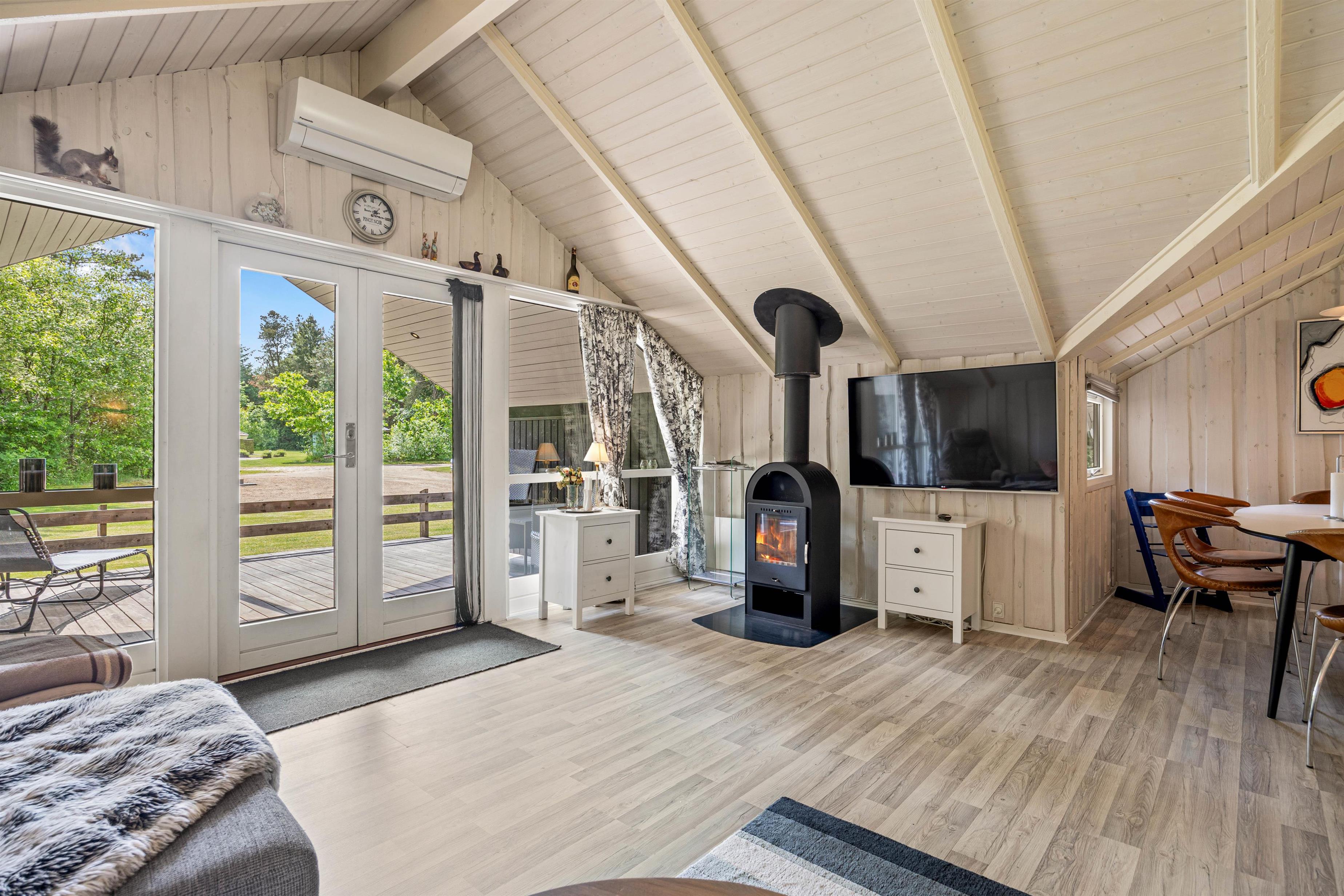 Sommerhuset byder på alt, hvad I har brug for, for at føle jer hjemme, selv mens I er på ferie. I stuen kan I nyde den varme og hyggelige atmosfære fra brændeovnen, der er perfekt til kølige aftener. Sommerhuset er også udstyret med en moderne og energibesparende luft-til-luft varmepumpe, som sikrer en jævn og behagelig temperatur uanset årstiden. Det veludstyrede køkken indeholder blandt andet en opvaskemaskine, så I kan slippe for at skulle tage opvasken efter lækre, hjemmelavede måltider. Der er 3 dejlige soveværelser til rådighed, alle smagfuldt indrettet, og sommerhuset tilbyder i alt plads til op til 6 personer.