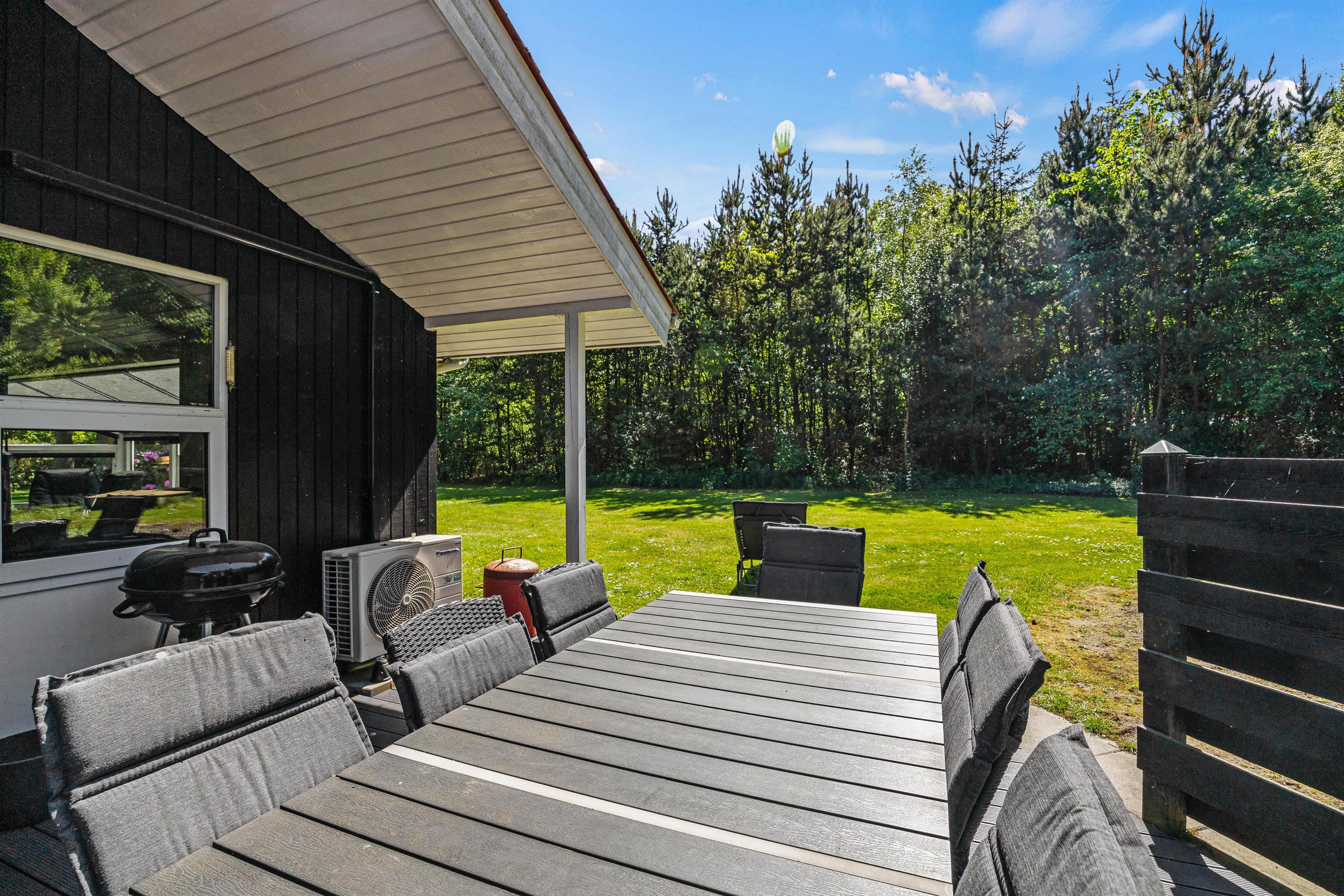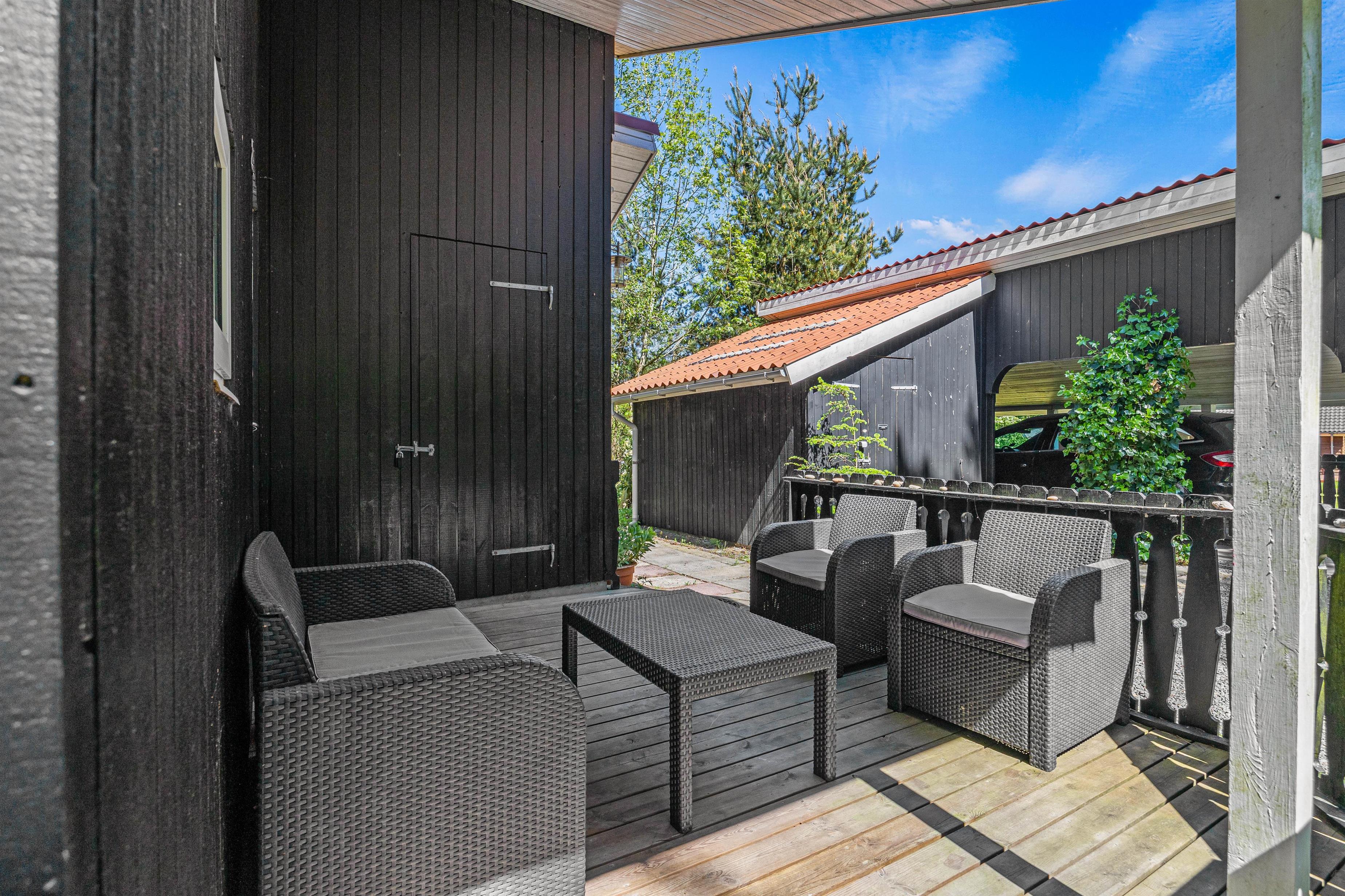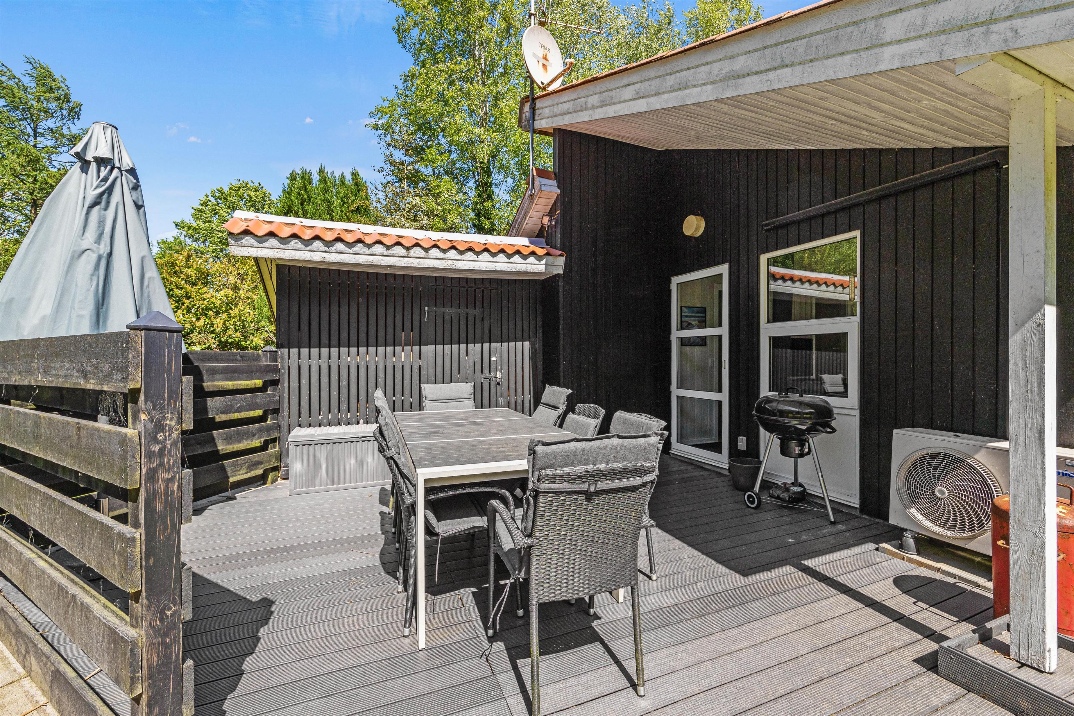Terrassen giver jer mulighed for at sidde afskærmet, overdækket eller under den åbne himmel på de mere solrige dage. I kan frit benytte jer af sommerhusets havemøbler, solvogne, parasol og grillen, der sørger for den perfekte afslutning til en varm feriedag; et grillmåltid på terrassen.