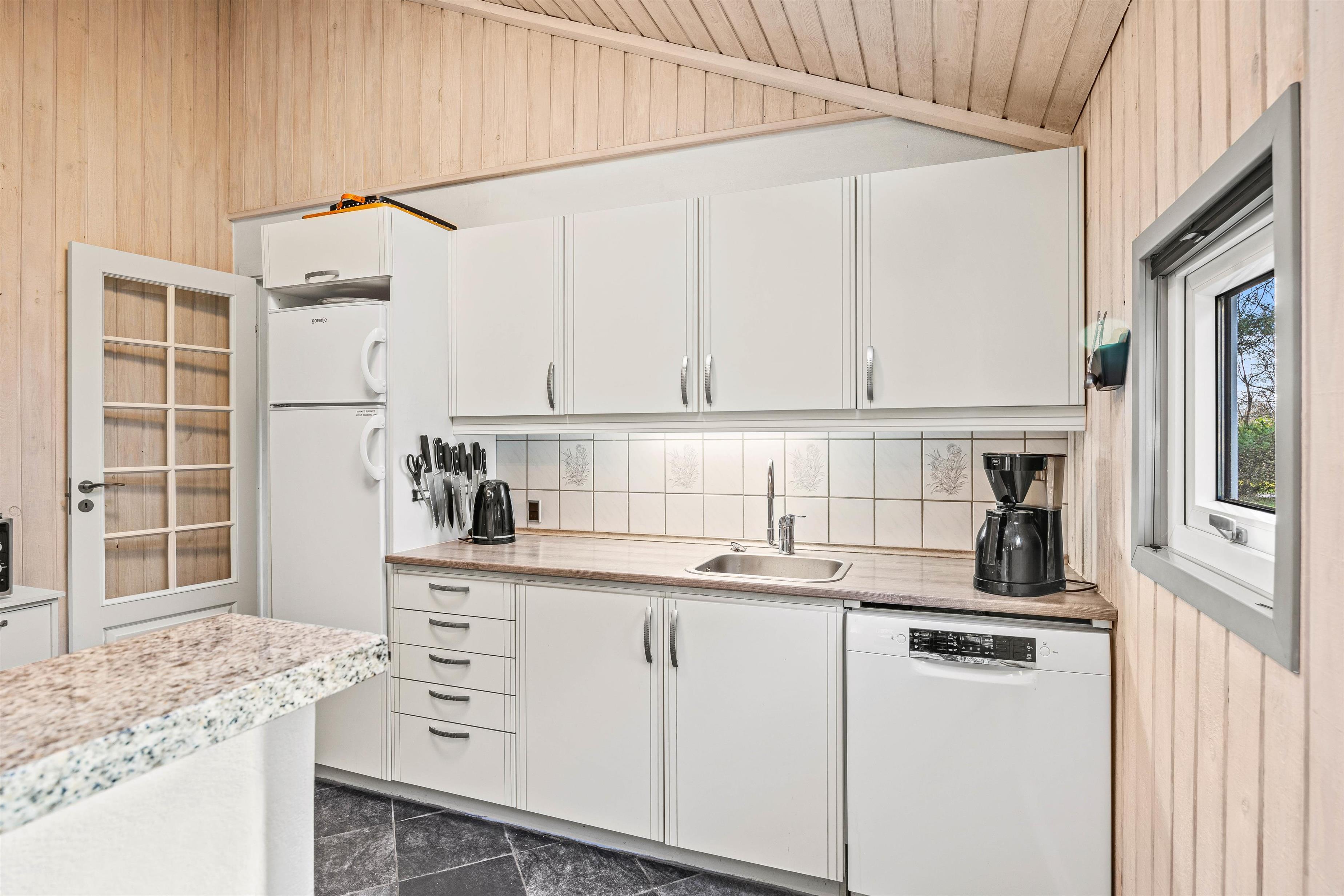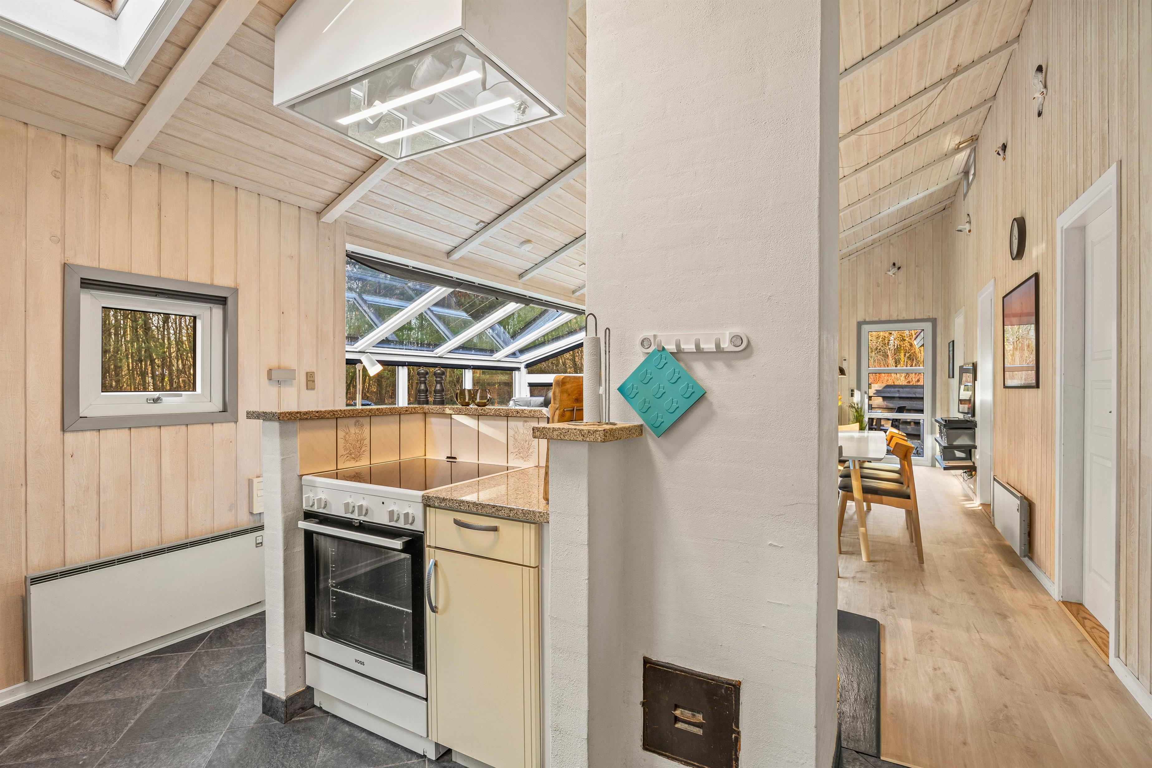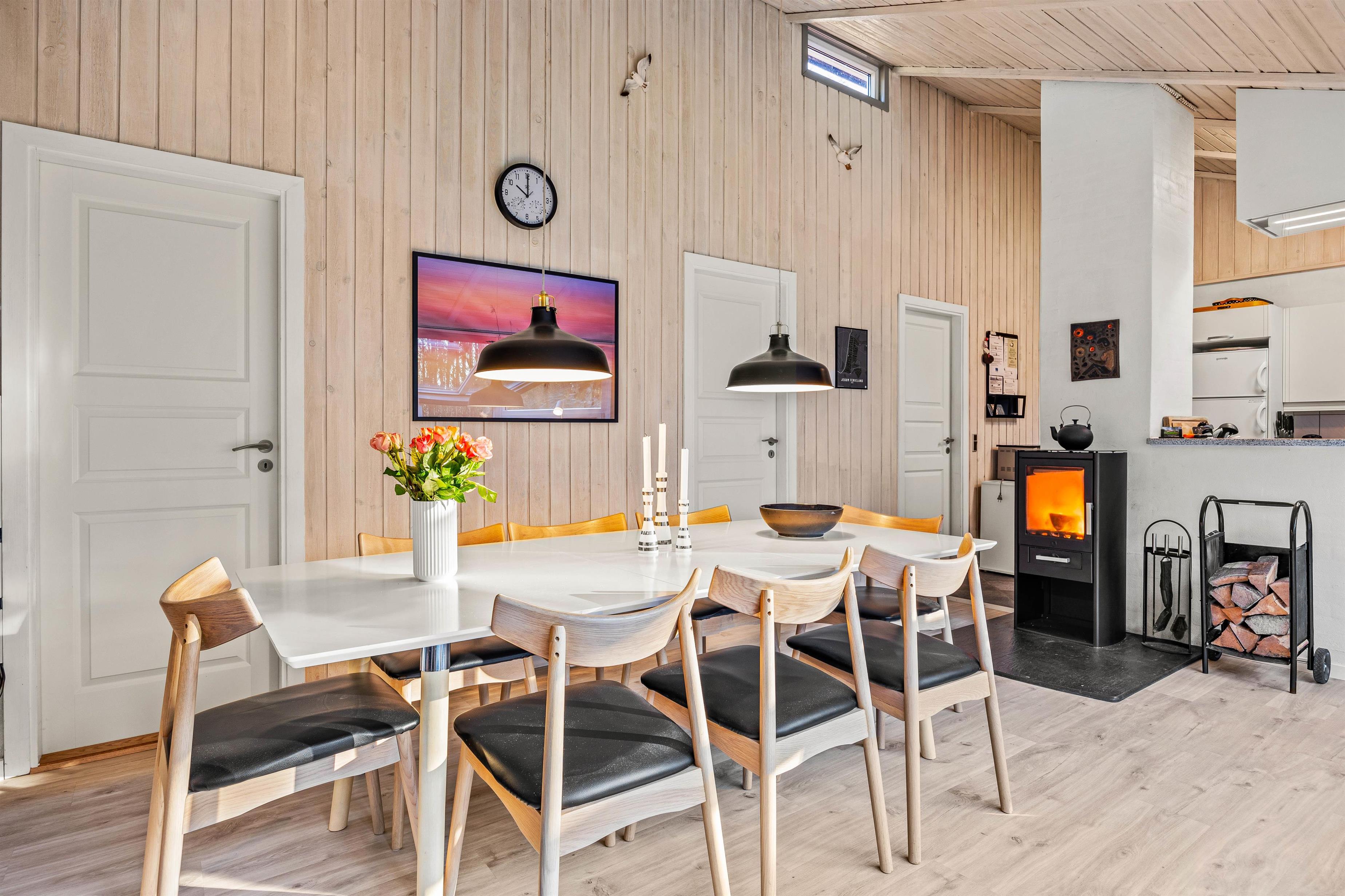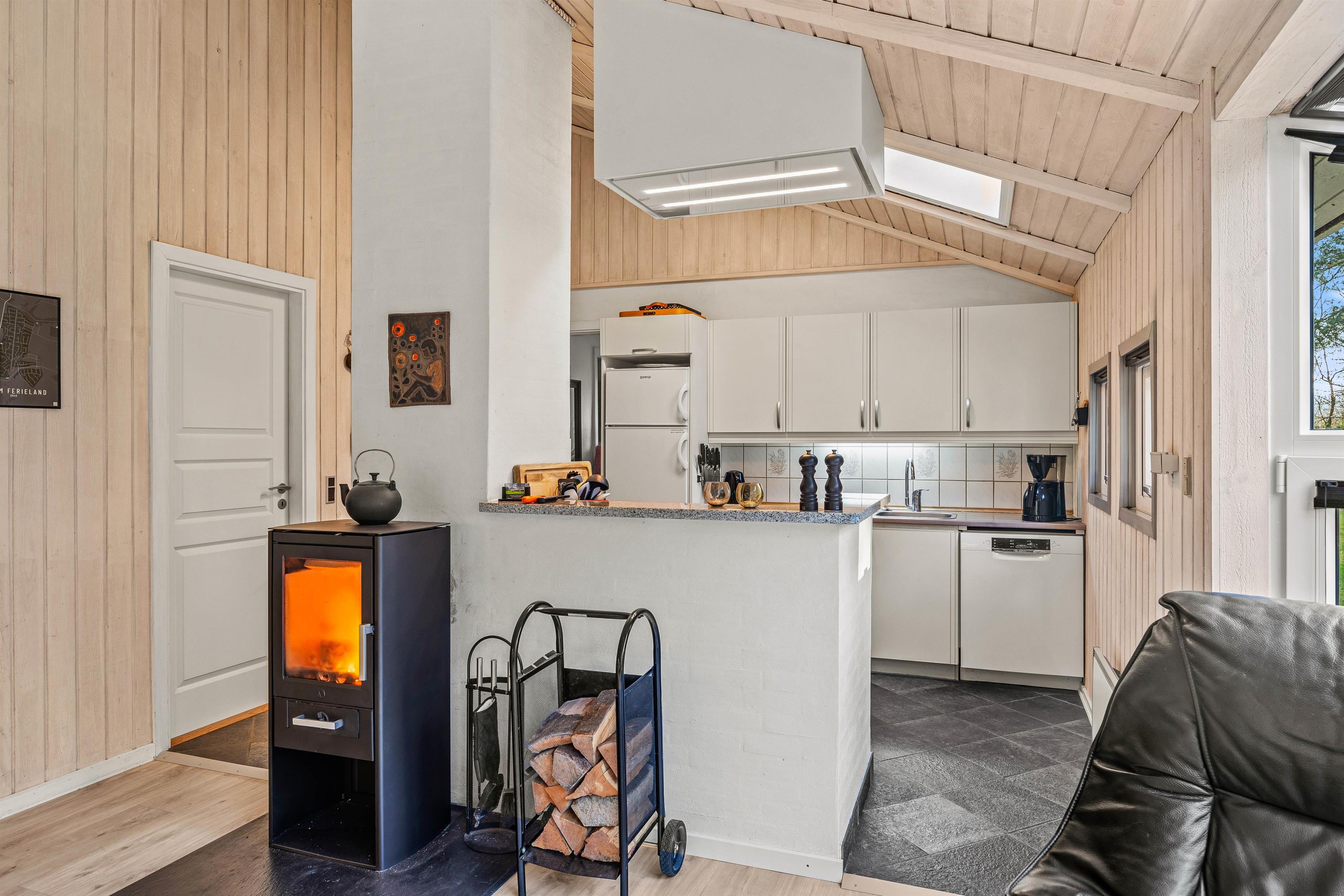 I det lyse opholdsrum, hvor stue, køkken og spisestue er samlet, kan I nyde hinandens nærvær, mens I hver især laver noget forskelligt og nyder den knitrende varme fra brændeovnen – nogle lægger måske puslespil ved spisebordet, mens andre spiller kort i lænestolene, læser en god bog i sofaen, eller står i køkkenet og tryller lækre feriemåltider frem og deltager i samtalen. Opvaskemaskinen sørger for at tage opvasken, mens vaskemaskinen og tørretumbleren får yndlingstrøjen ren igen efter aftenens spaghetti bolognese, som altid har en tendens til at sætte sig på sweateren.