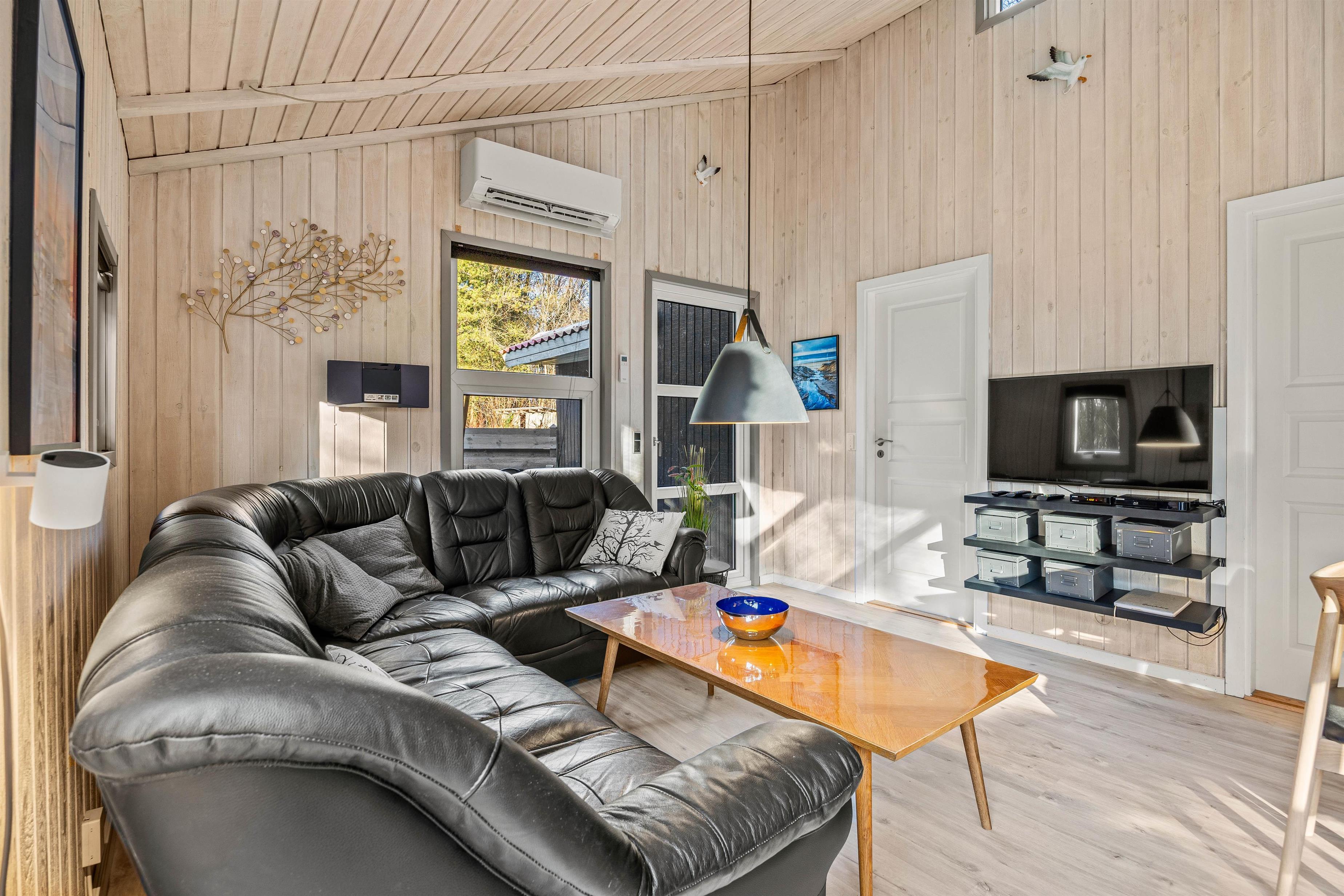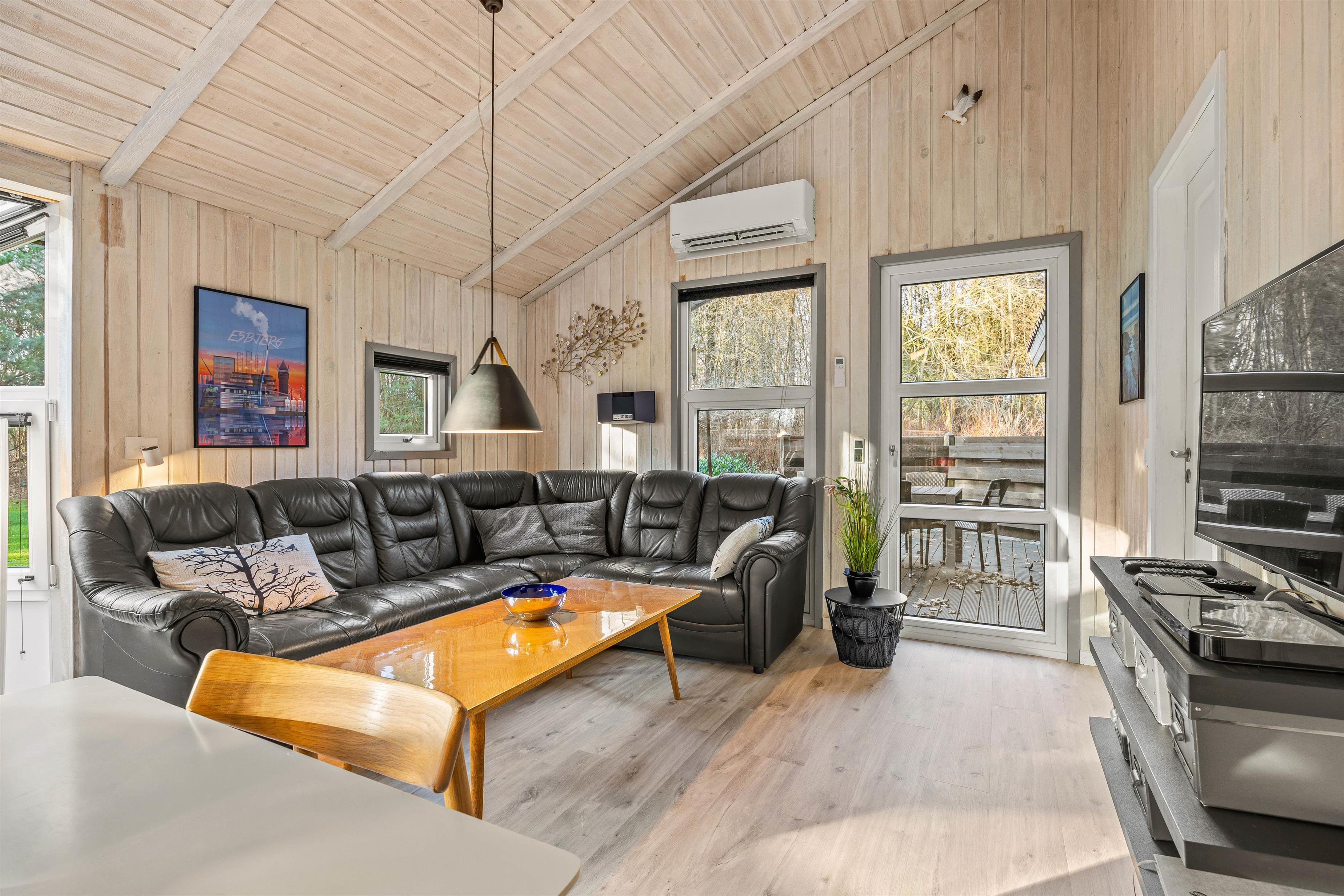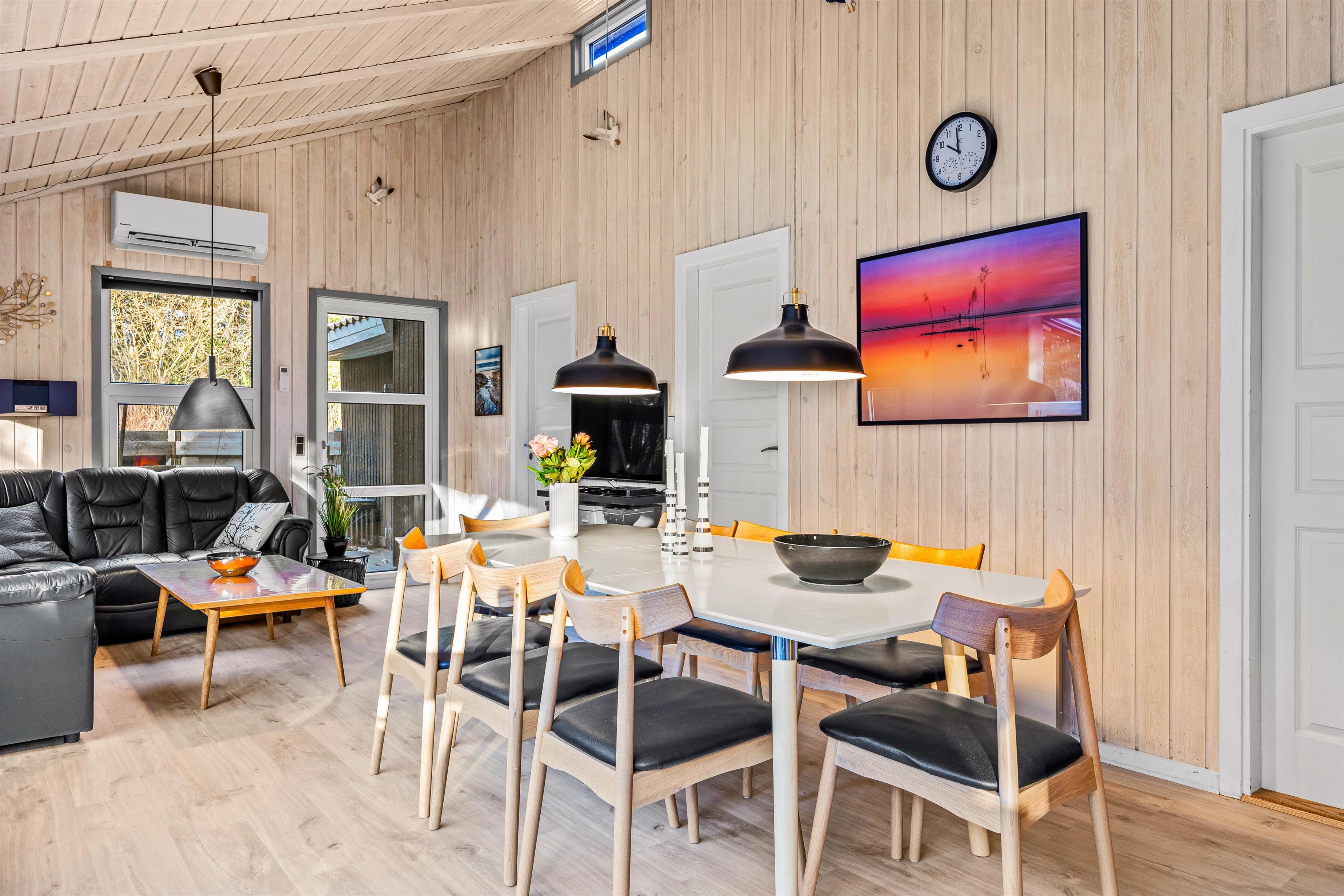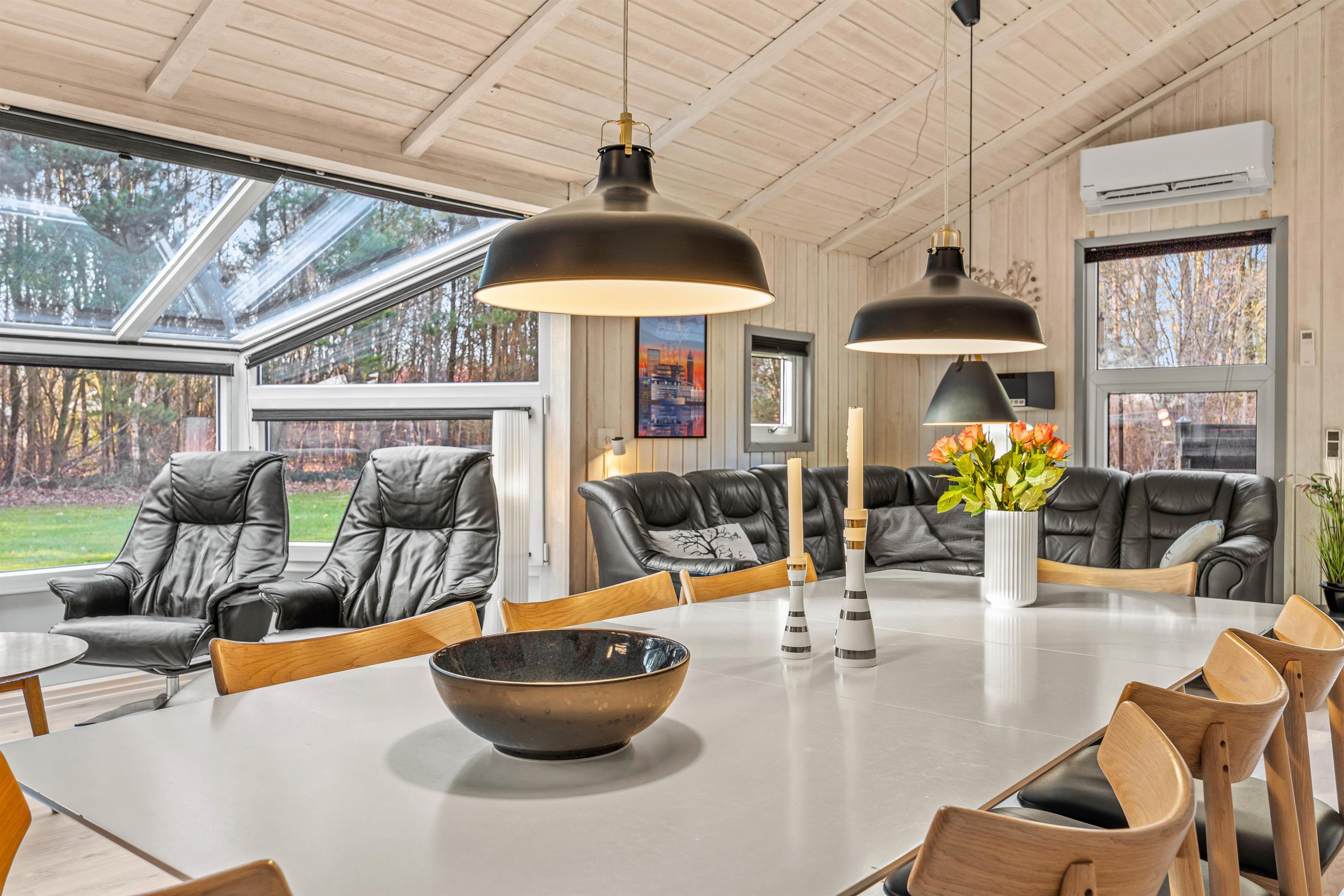 I det lyse opholdsrum, hvor stue, køkken og spisestue er samlet, kan I nyde hinandens nærvær, mens I hver især laver noget forskelligt og nyder den knitrende varme fra brændeovnen – nogle lægger måske puslespil ved spisebordet, mens andre spiller kort i lænestolene, læser en god bog i sofaen, eller står i køkkenet og tryller lækre feriemåltider frem og deltager i samtalen. Opvaskemaskinen sørger for at tage opvasken, mens vaskemaskinen og tørretumbleren får yndlingstrøjen ren igen efter aftenens spaghetti bolognese, som altid har en tendens til at sætte sig på sweateren.