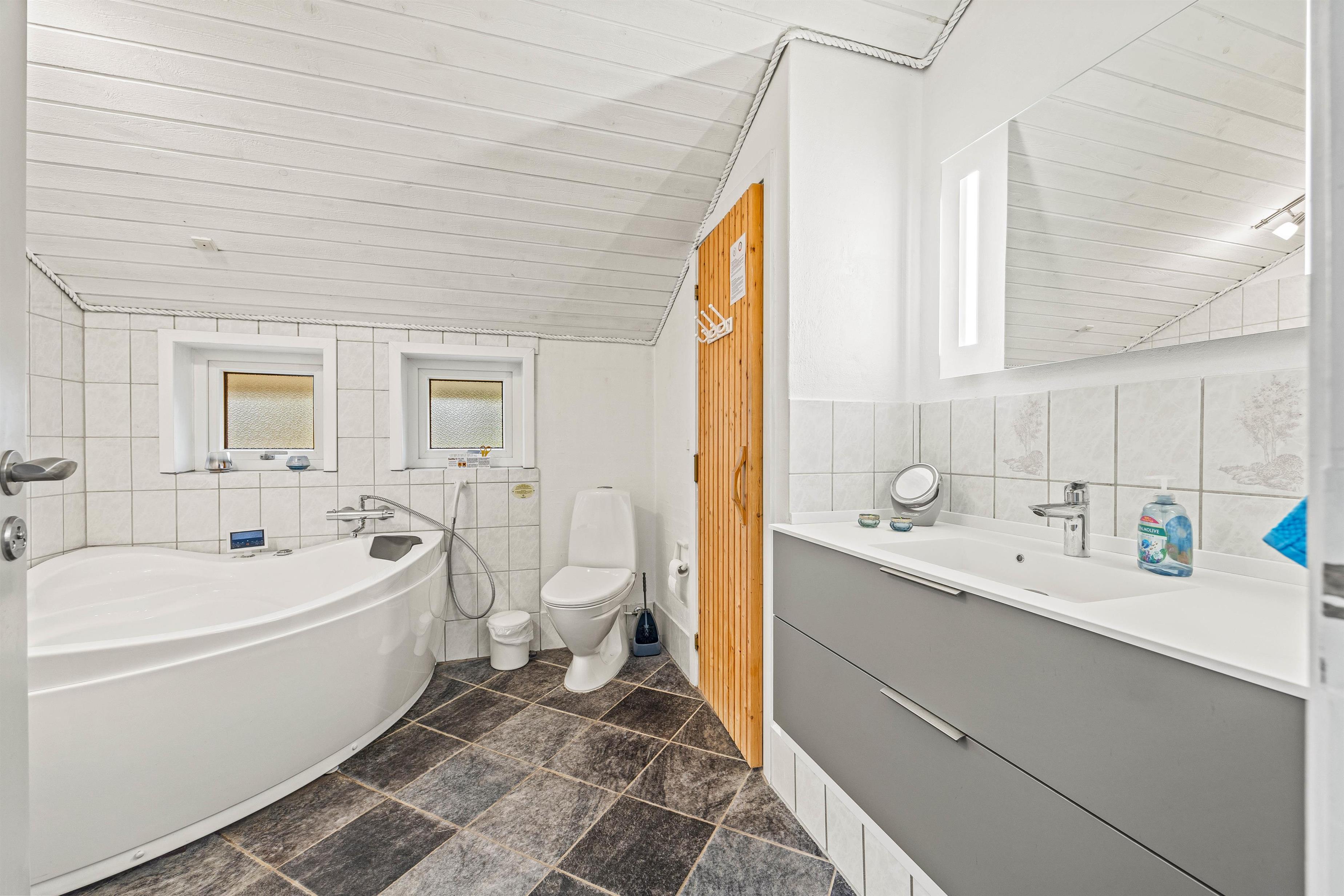Sommerhusets 108 kvadratmeter indeholder blandt andet 2 badeværelser med gulvvarme, hvoraf det ene også har både spa og tømmespa, hvilket er et af feriehusets absolut højdepunkter. Her kan I blive varmet igennem efter en lang gå- eller cykeltur i den fantastiske natur.