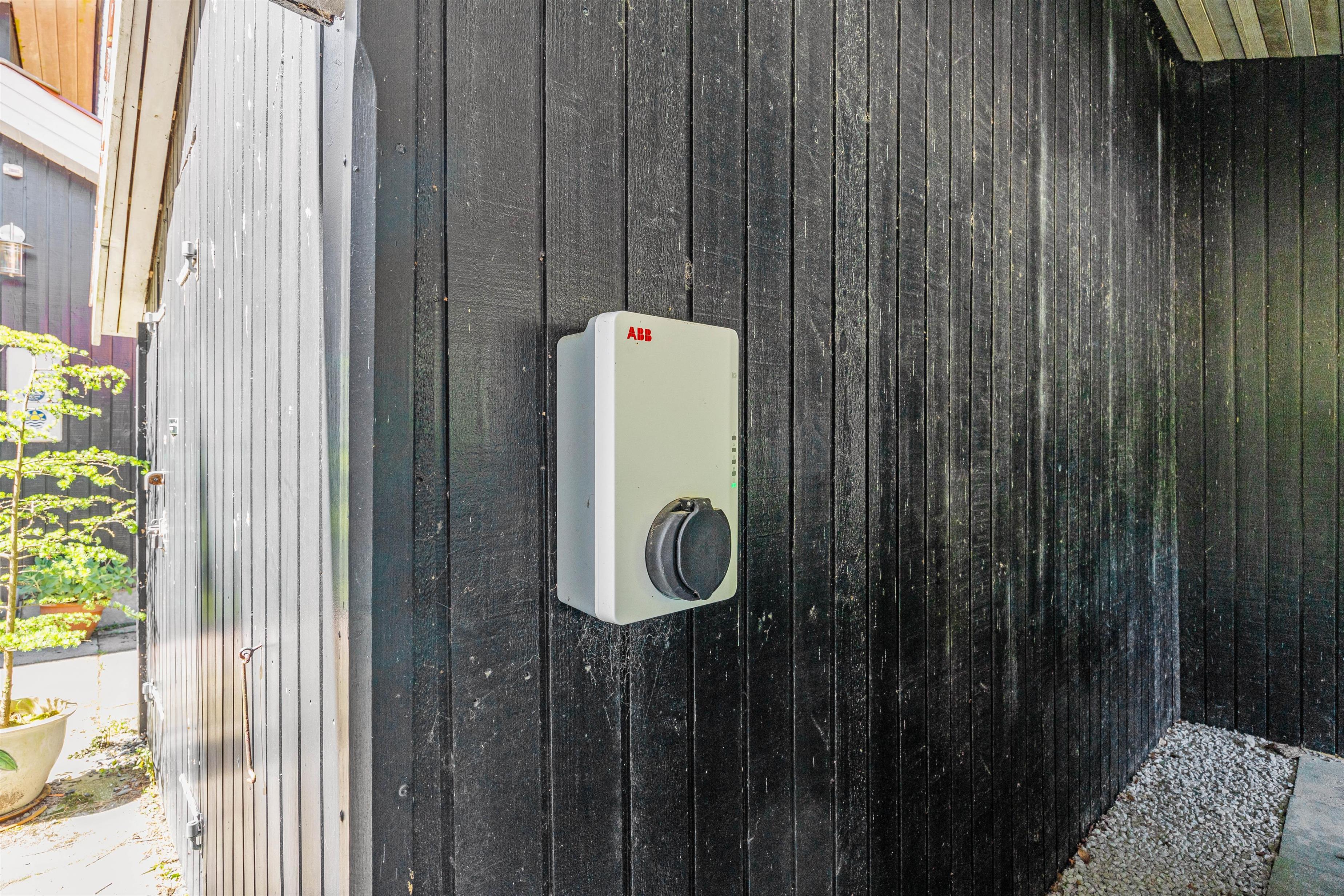 Til bilen er der en carport – her kan I også stille cyklerne og barnevognen, så disse kan stå i tørvejr. Har I en el-bil, kan I oplade den direkte på adressen, da her er en ladestander.