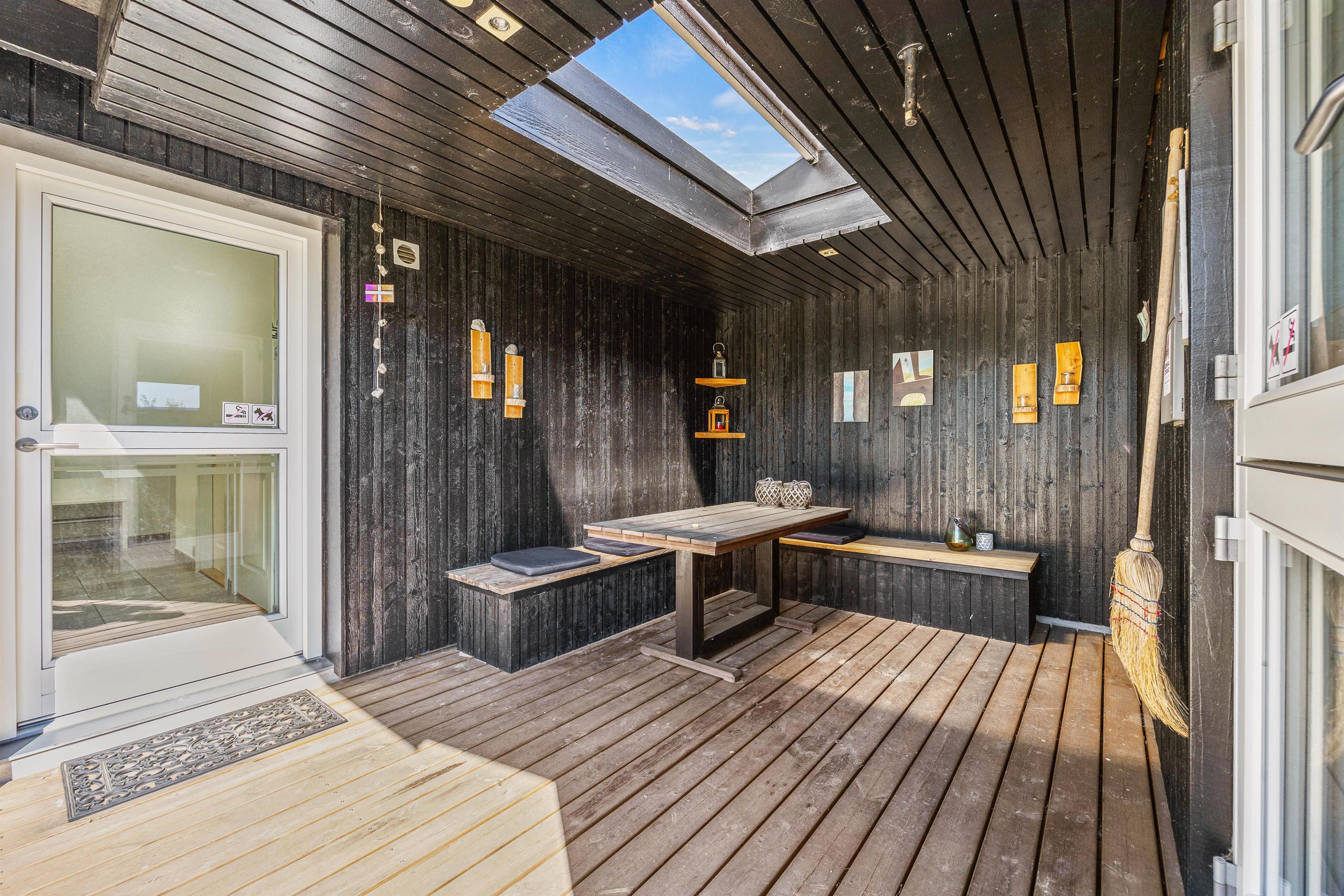Fra stuen kan I gå gennem døren og direkte ud på terrassen, hvor I har mulighed for at sidde både afskærmet og overdækket, eller nyde solens stråler under åben himmel. I har både parasol, havemøbler og solvogne til jeres rådighed her. Dertil er der selvfølgelig også en grill, så I kan tilberede lækre feriemåltider udenfor.
