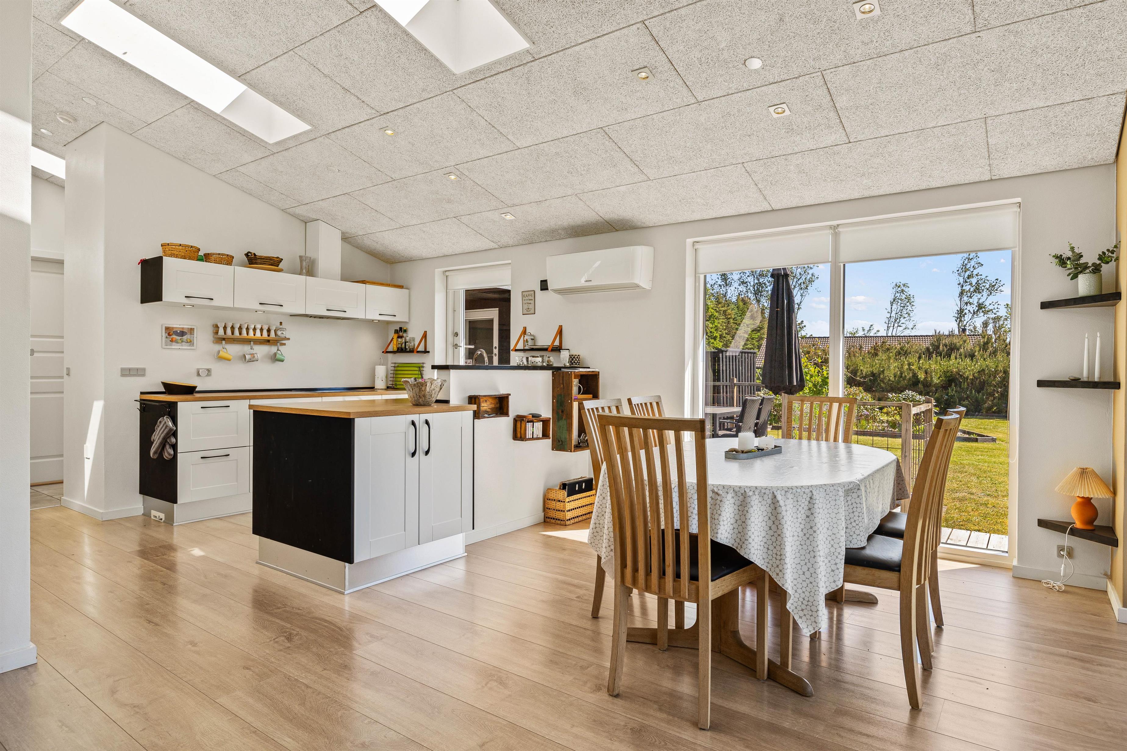 Sommerhuset er bygget i 2015 og fremstår lyst og venligt med sin topmoderne indretning. I stuen sørger ovenlysvinduerne for et dejligt og naturligt lysindfald, som skaber god atmosfære. Stuen ligger i åben forbindelse med både spisestuen og køkkenet, så der er gode betingelser for at nyde hinandens nærvær, mens I hver især fordyber jer i forskellige ting – uanset om det er madlavning, et puslespil eller en god bog.