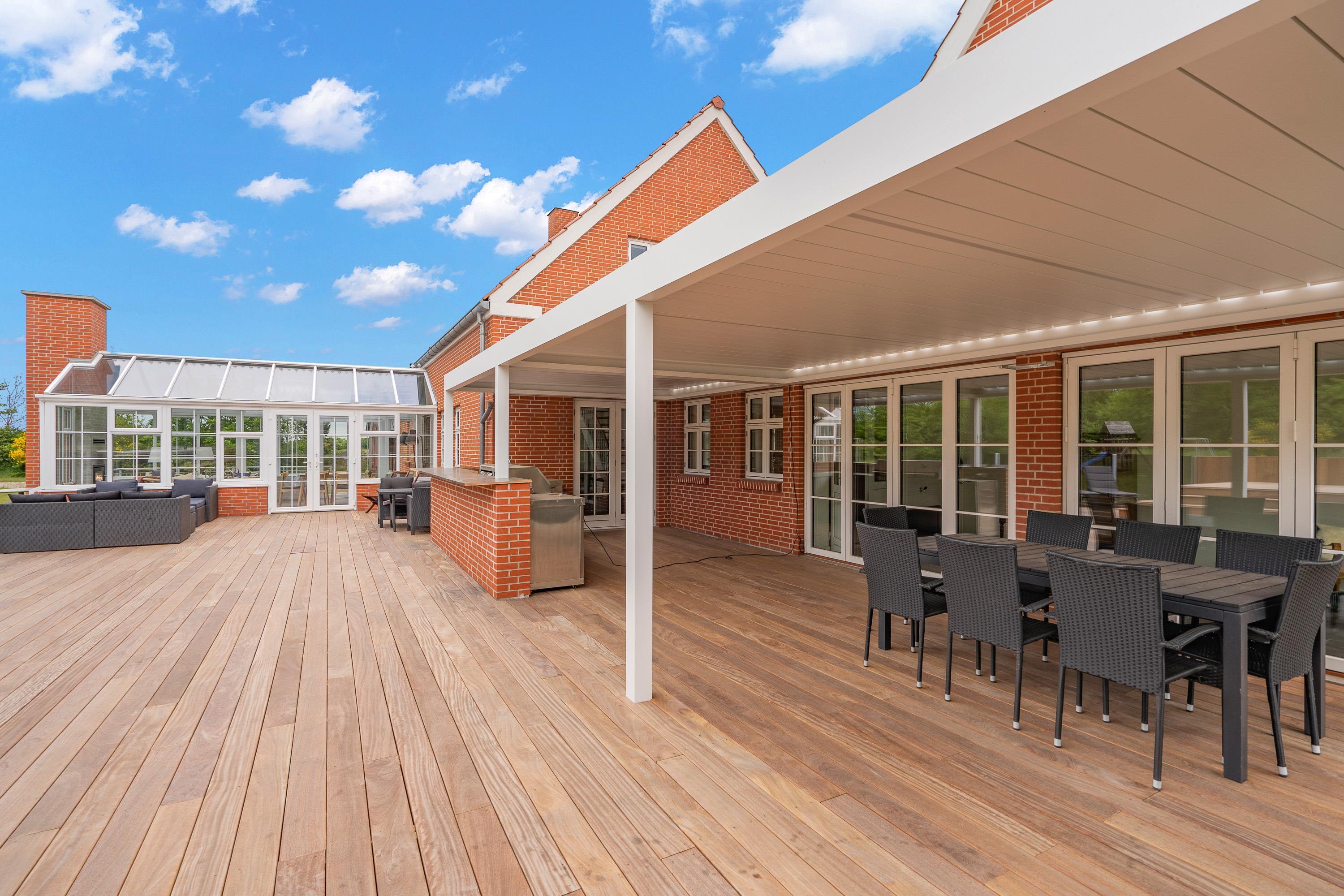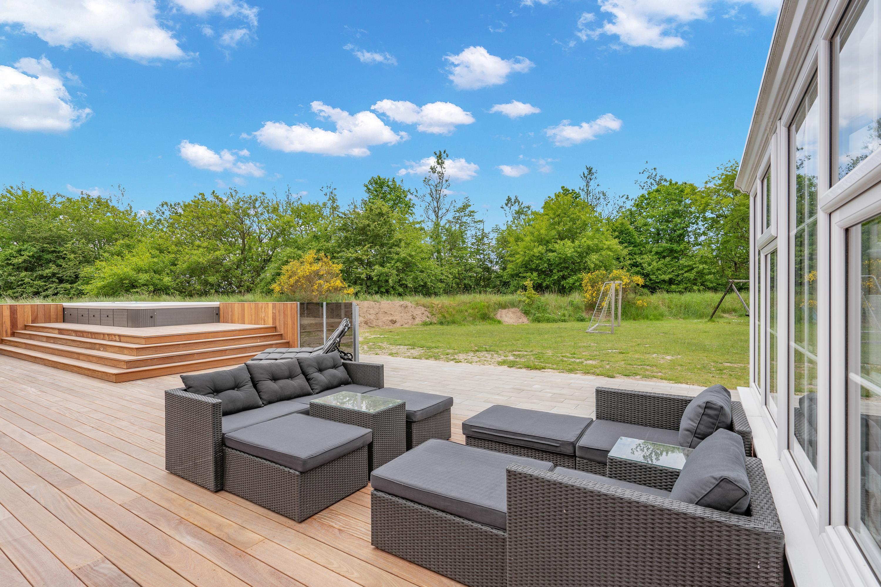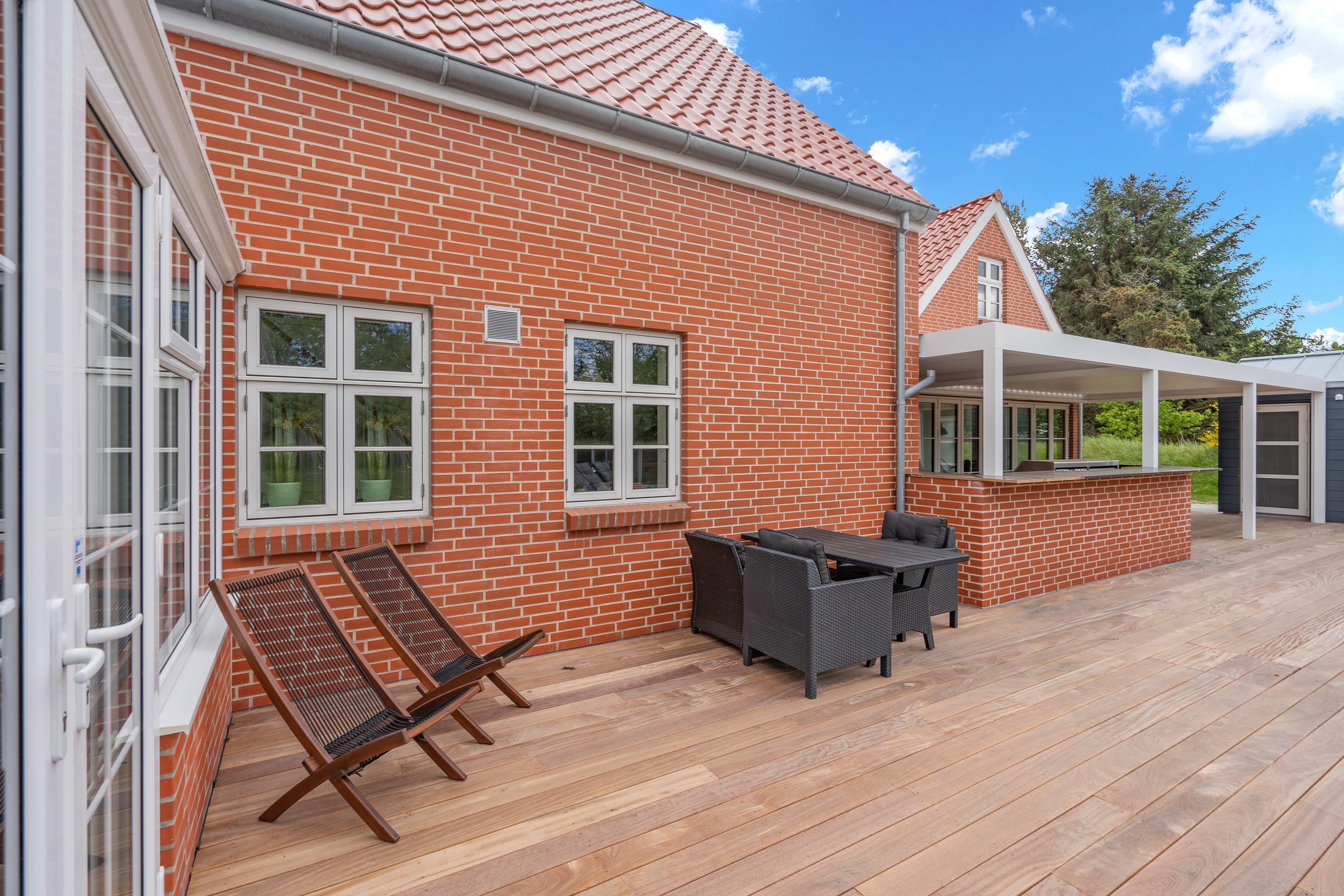 I haven er der både rutsjebane og en stor gynge til børnene, der ikke ligger langt fra sommerhusets store terrasse på hele 80 kvadratmeter, hvor en del også er overdækket. Her kan I tilberede lækre feriemåltider på gas- eller trækulgrillen og slappe af i ferieboligens havemøbler. I finder også et lækkert udekøkken, som er delvist overdækket og afskærmet. Når det bliver køligt, kan I tænde op i den udendørs pejs og nyde varmen under åben himmel.