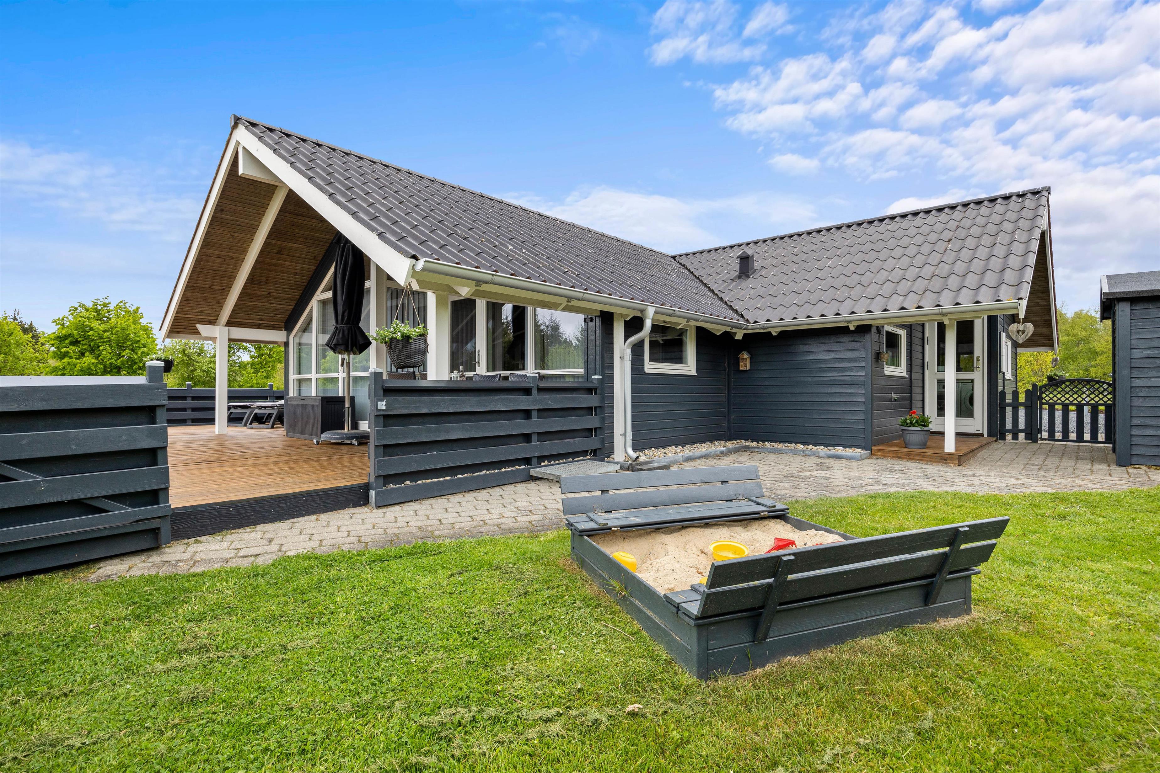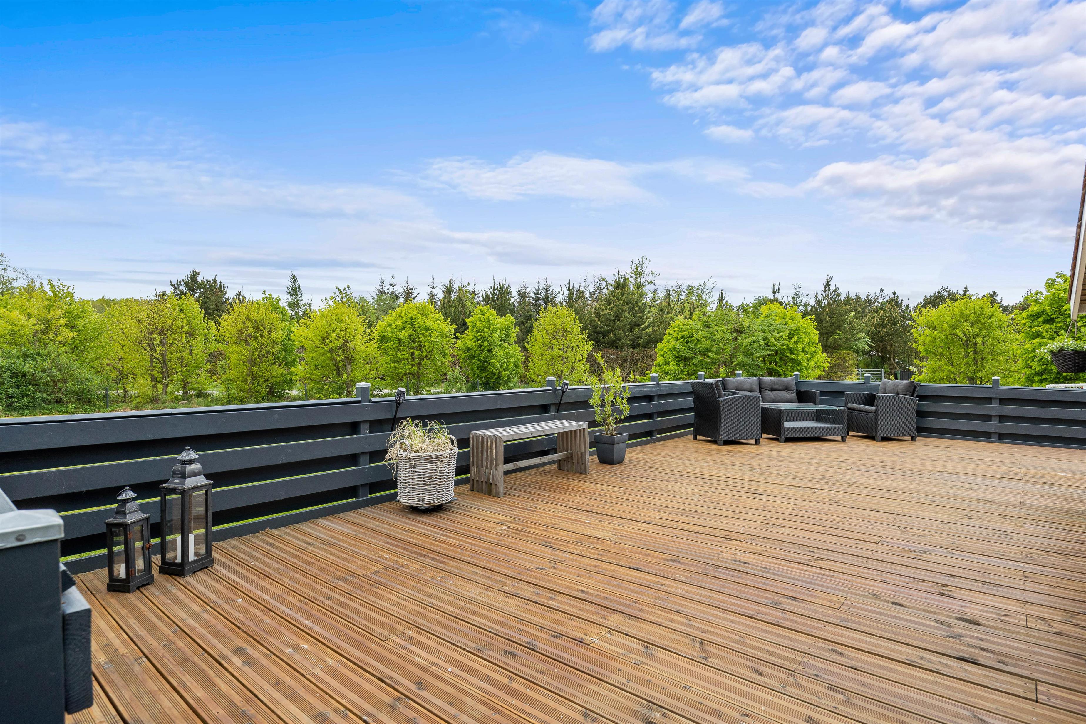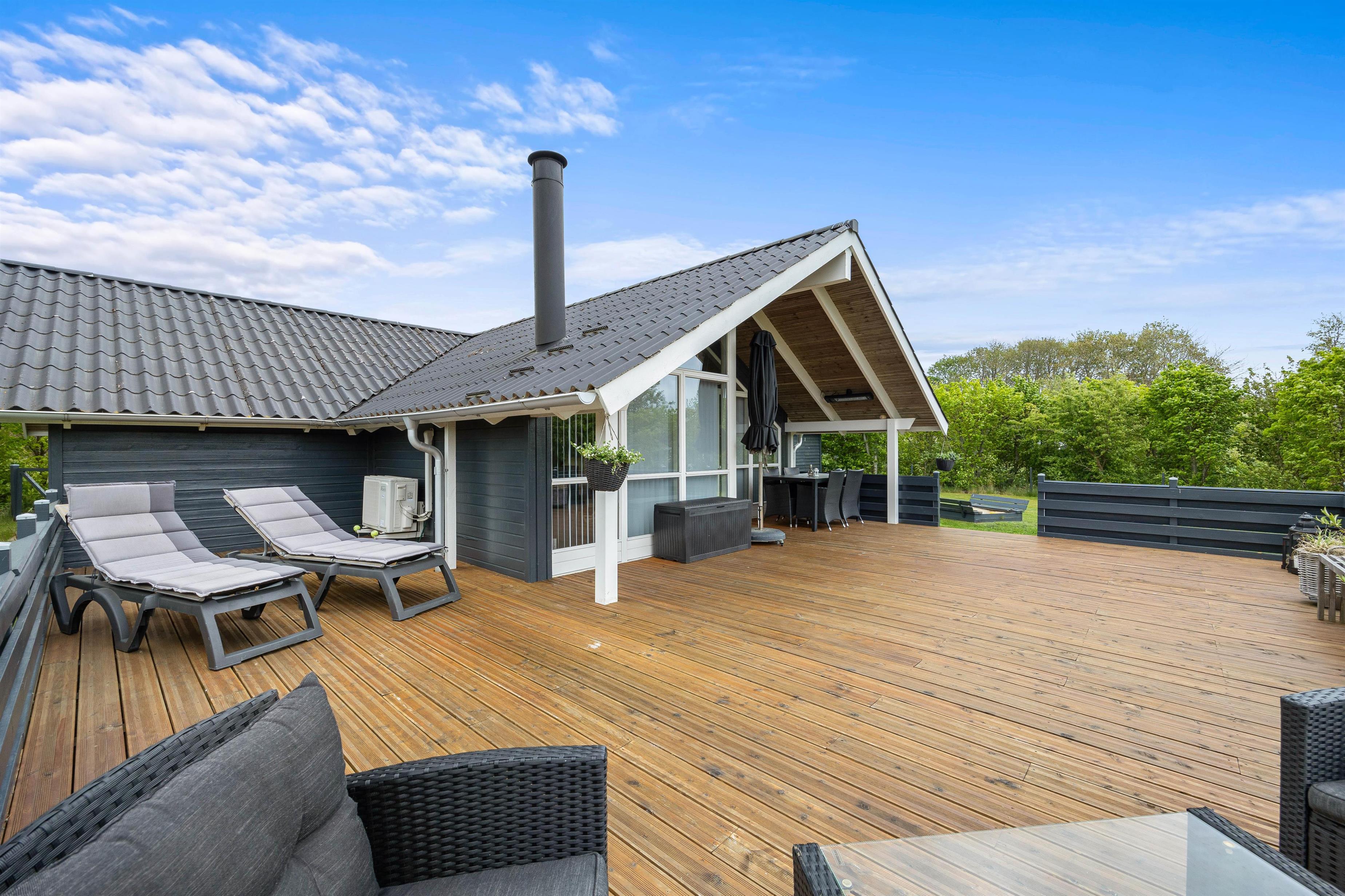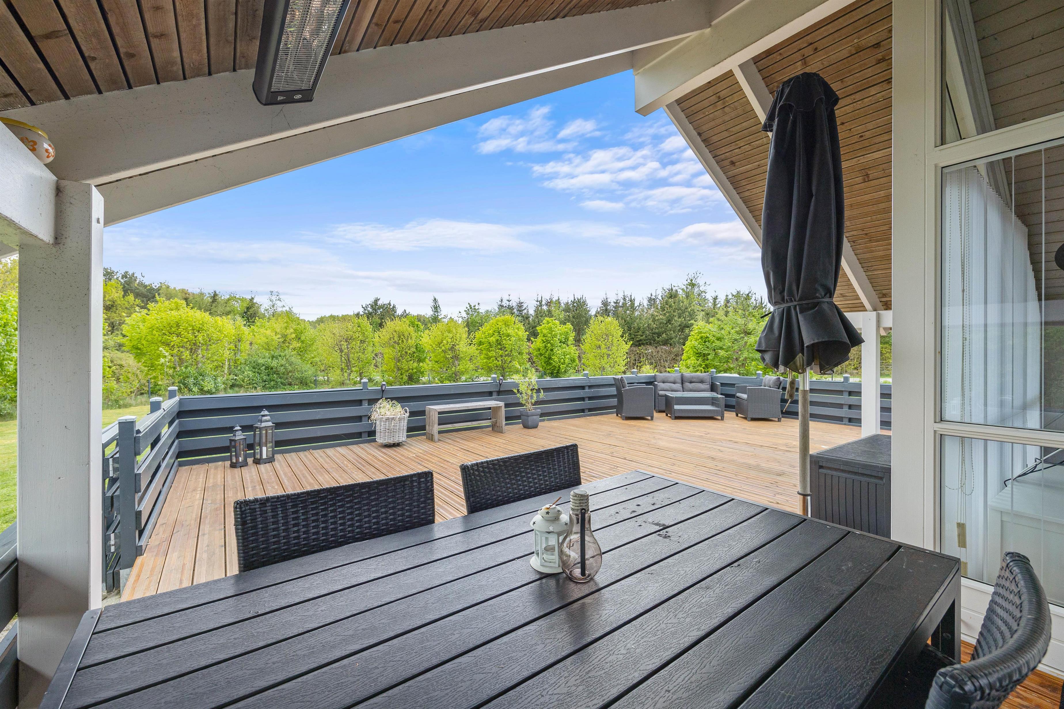 Terrassen har plankeværk hele vejen rundt, så også her kan I nemt holde jeres firbenede venner. En del af den store terrasse er overdækket, så I også kan sidde ude, selvom det skulle dryppe lidt, eller hvis I blot foretrækker skyggen på de solrige dage. På terrassen kan I afslutte enhver perfekt feriedag med at grille de lækreste måltider og nyde dem med et velsmagende glas vin til.