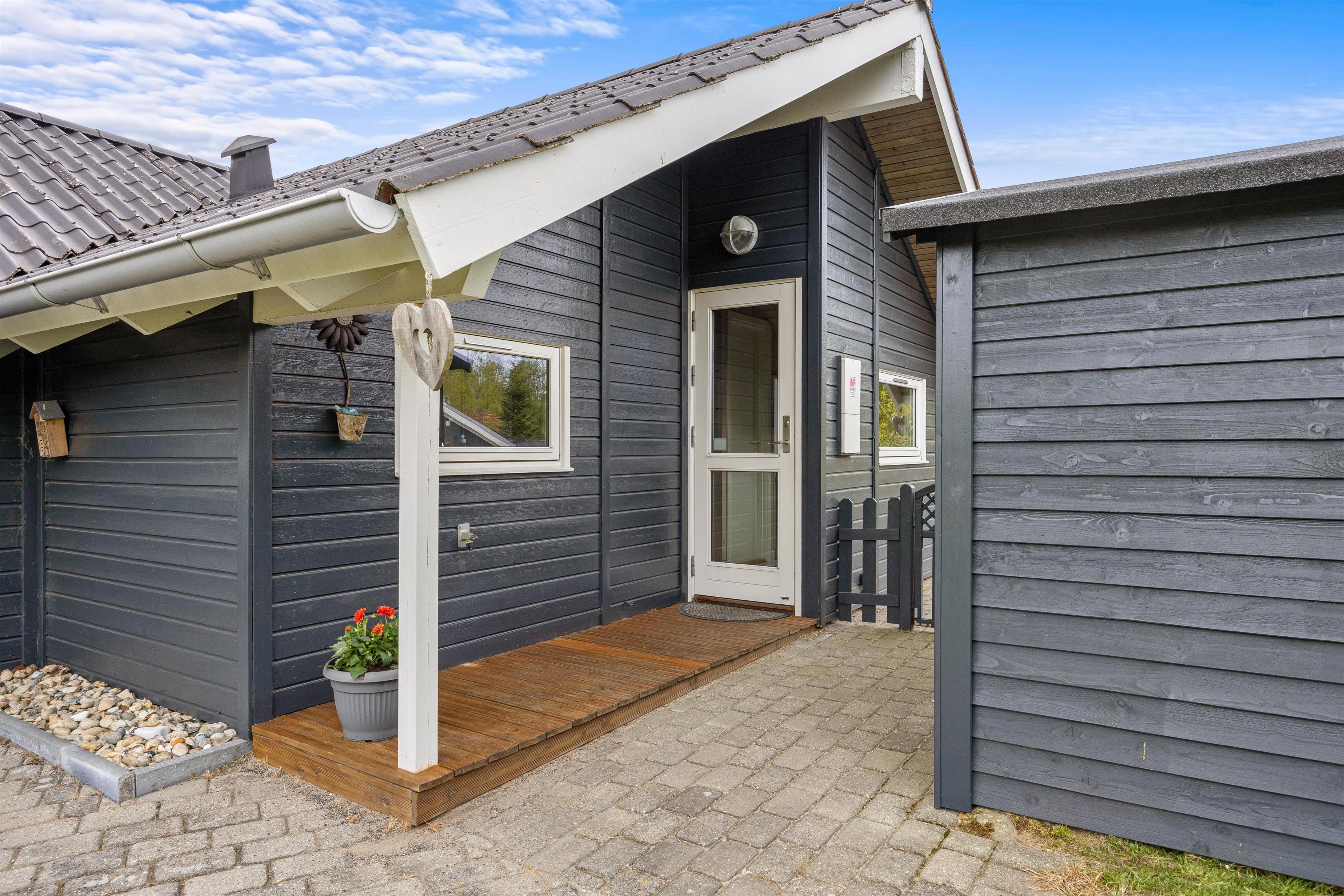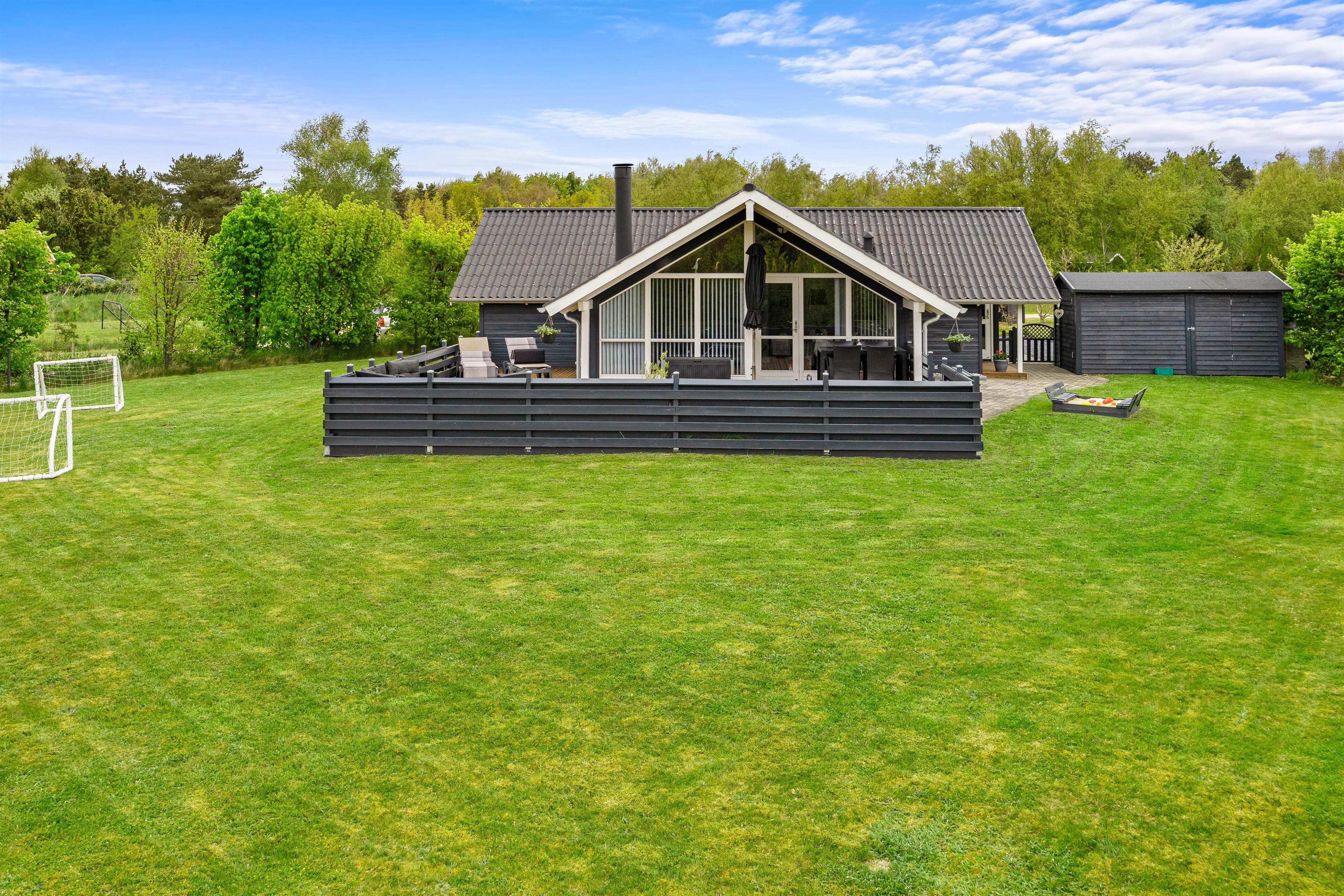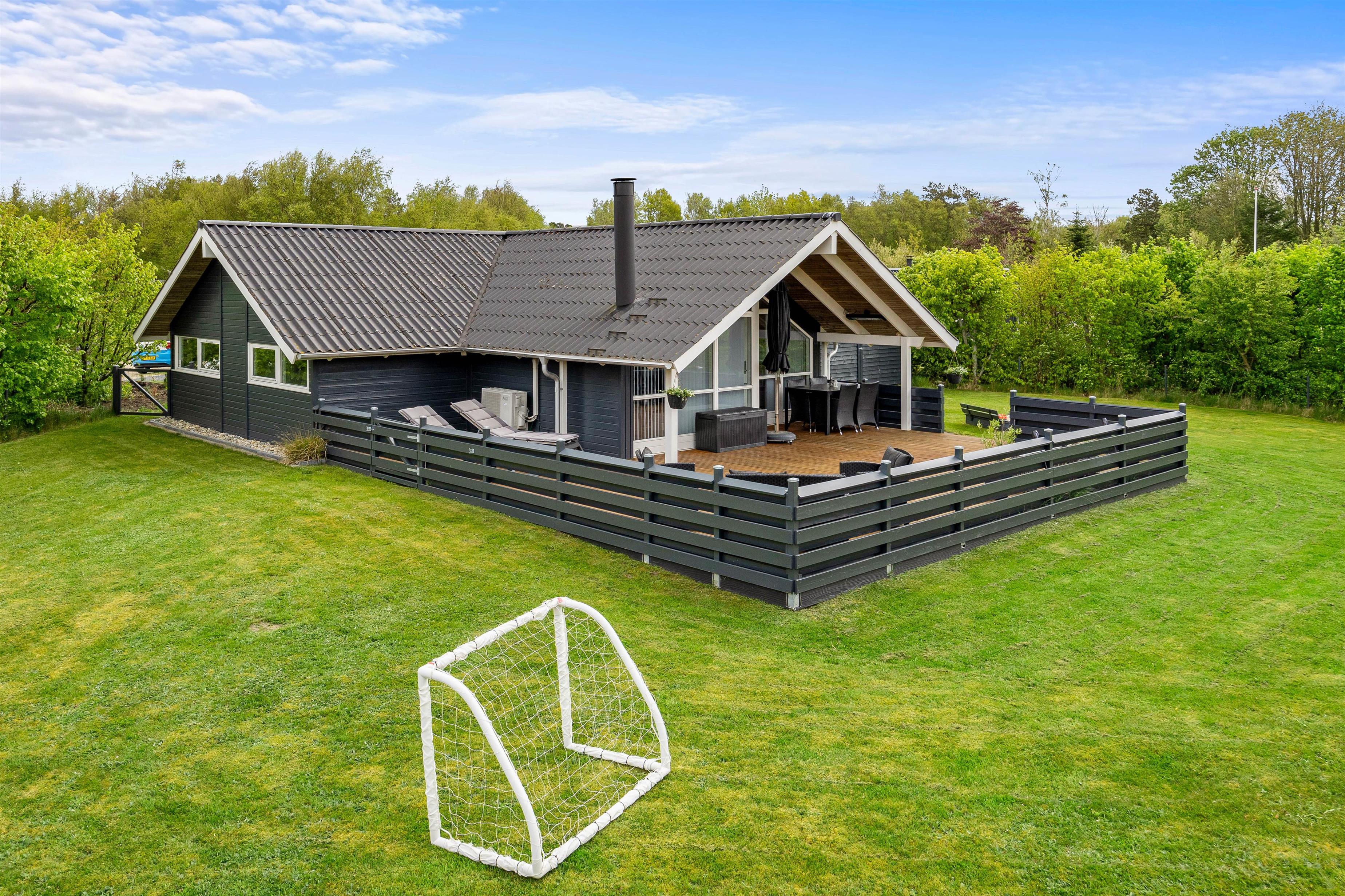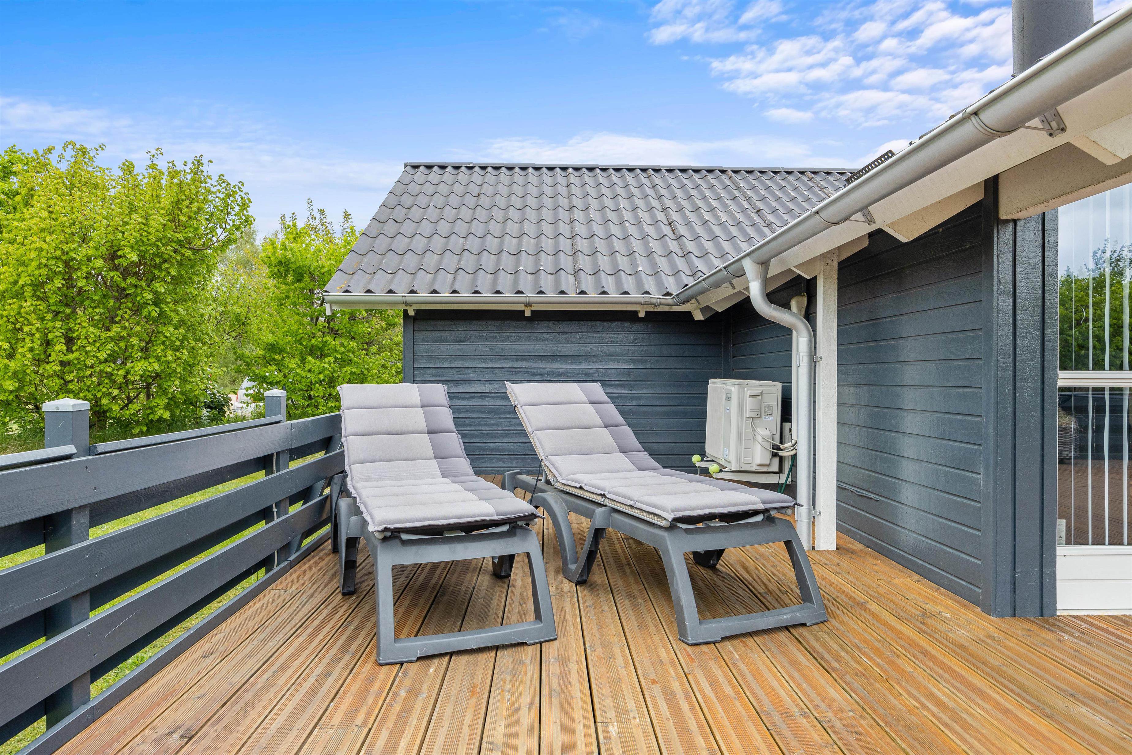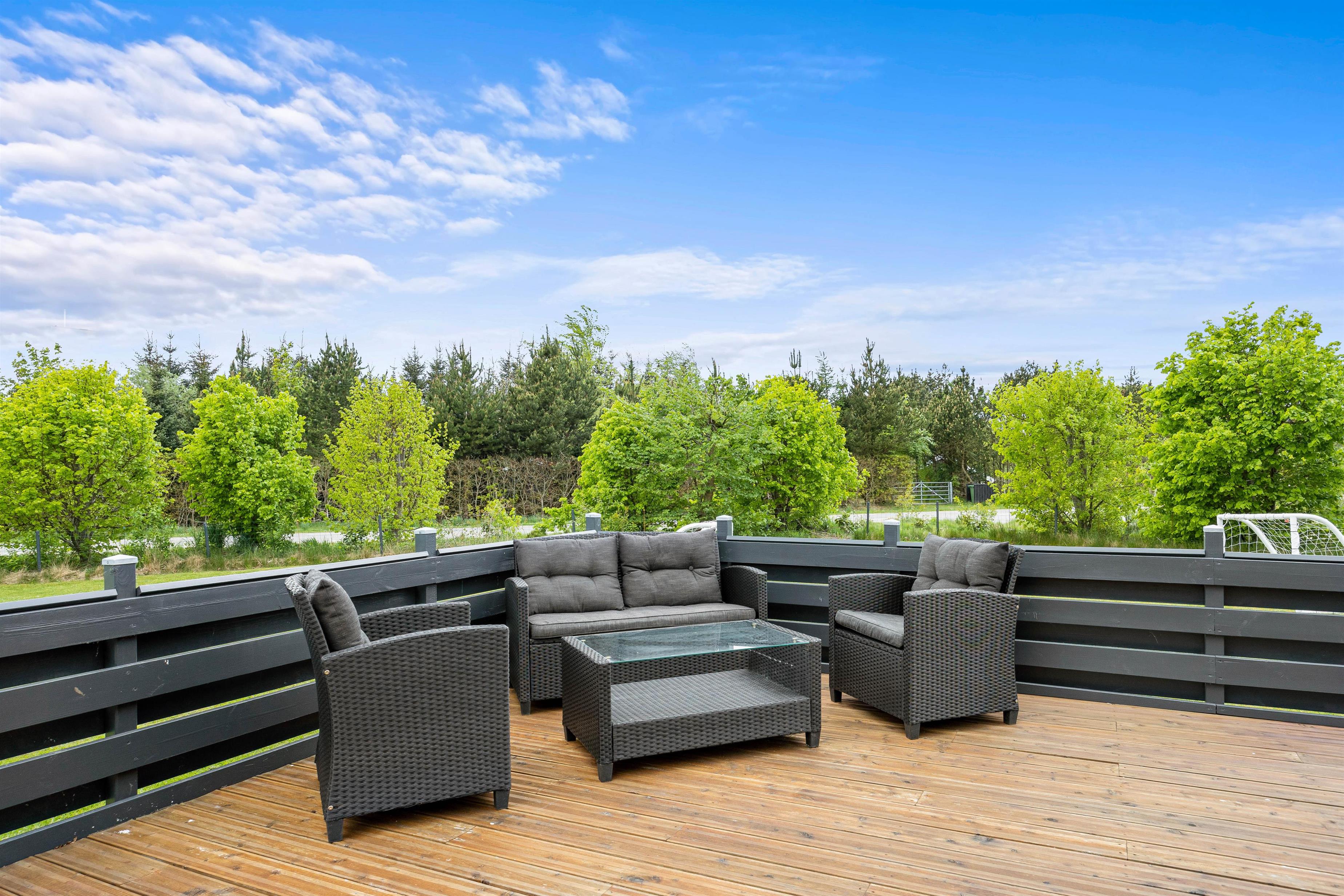 Terrassen har plankeværk hele vejen rundt, så også her kan I nemt holde jeres firbenede venner. En del af den store terrasse er overdækket, så I også kan sidde ude, selvom det skulle dryppe lidt, eller hvis I blot foretrækker skyggen på de solrige dage. På terrassen kan I afslutte enhver perfekt feriedag med at grille de lækreste måltider og nyde dem med et velsmagende glas vin til.