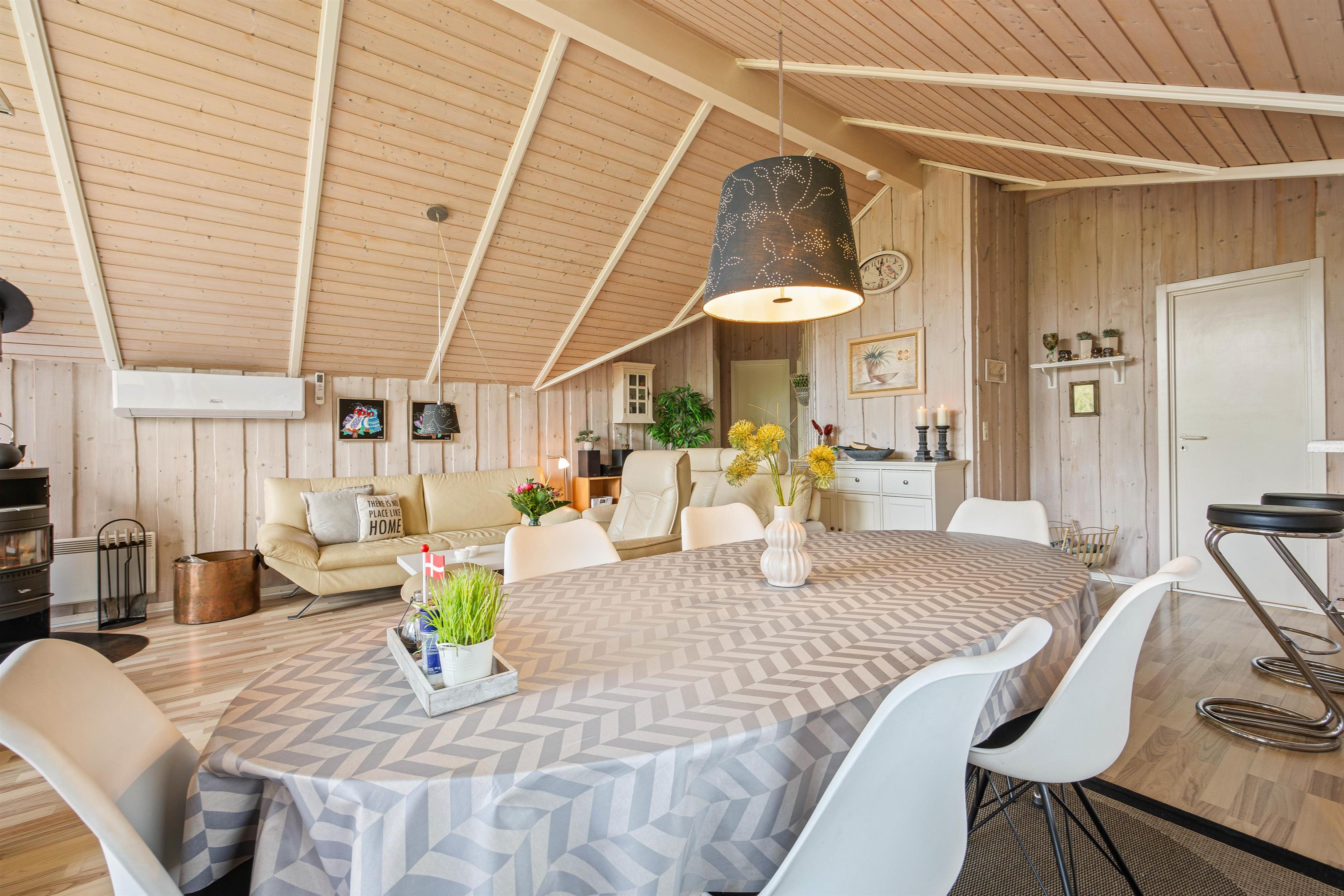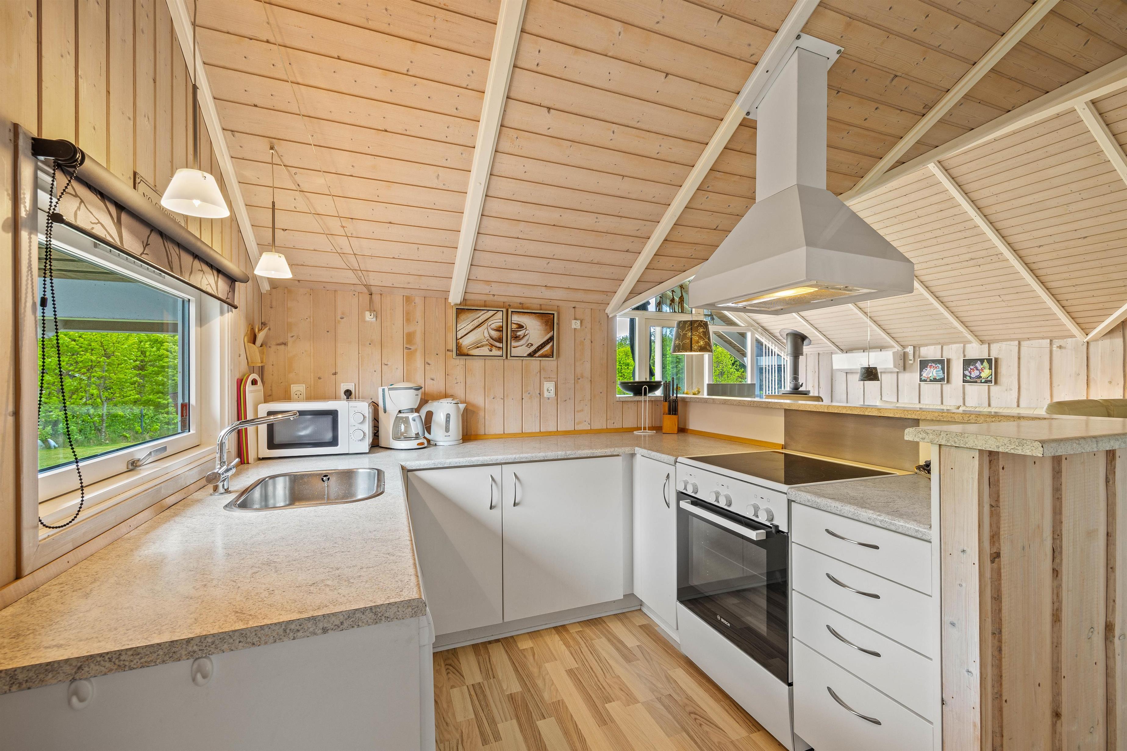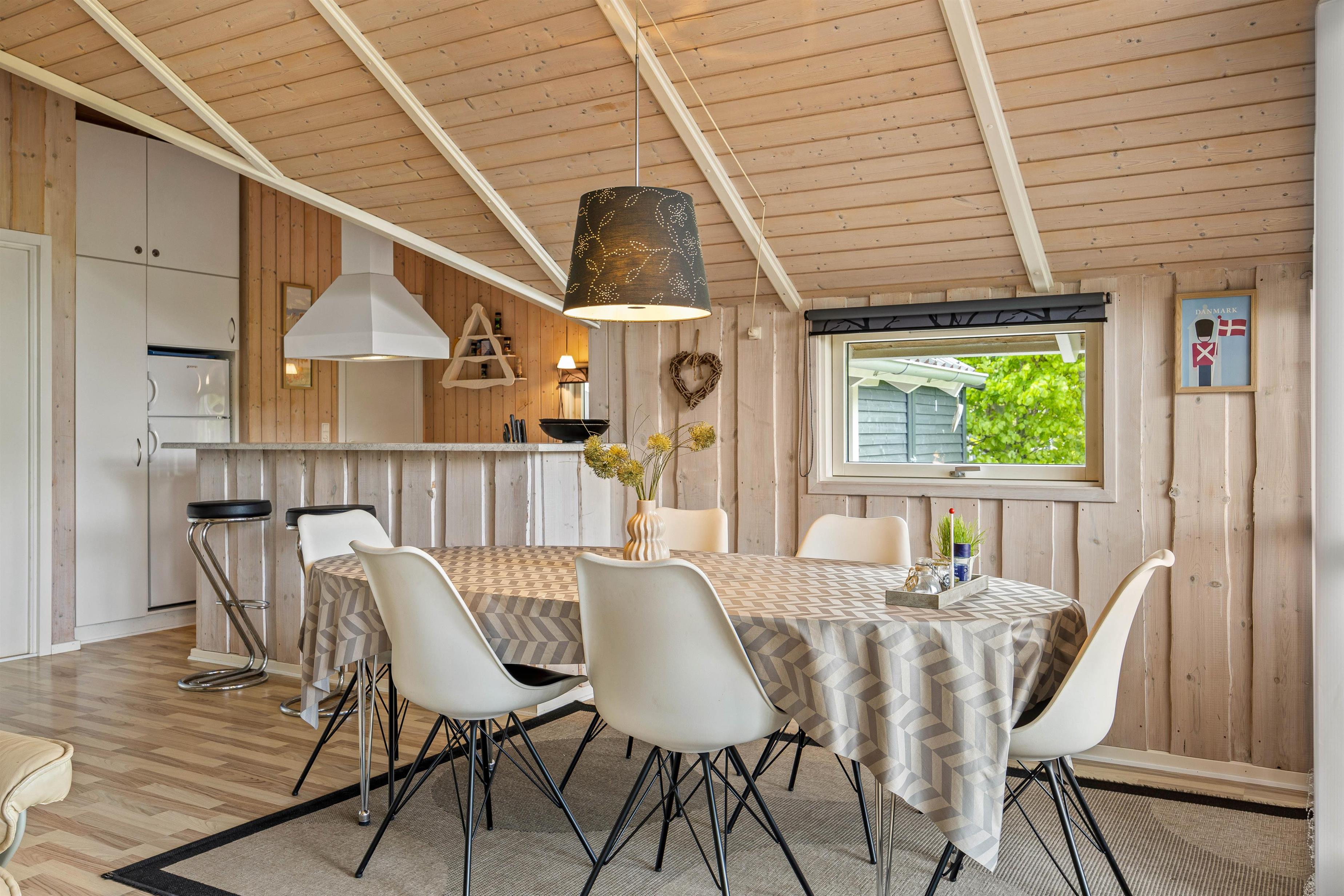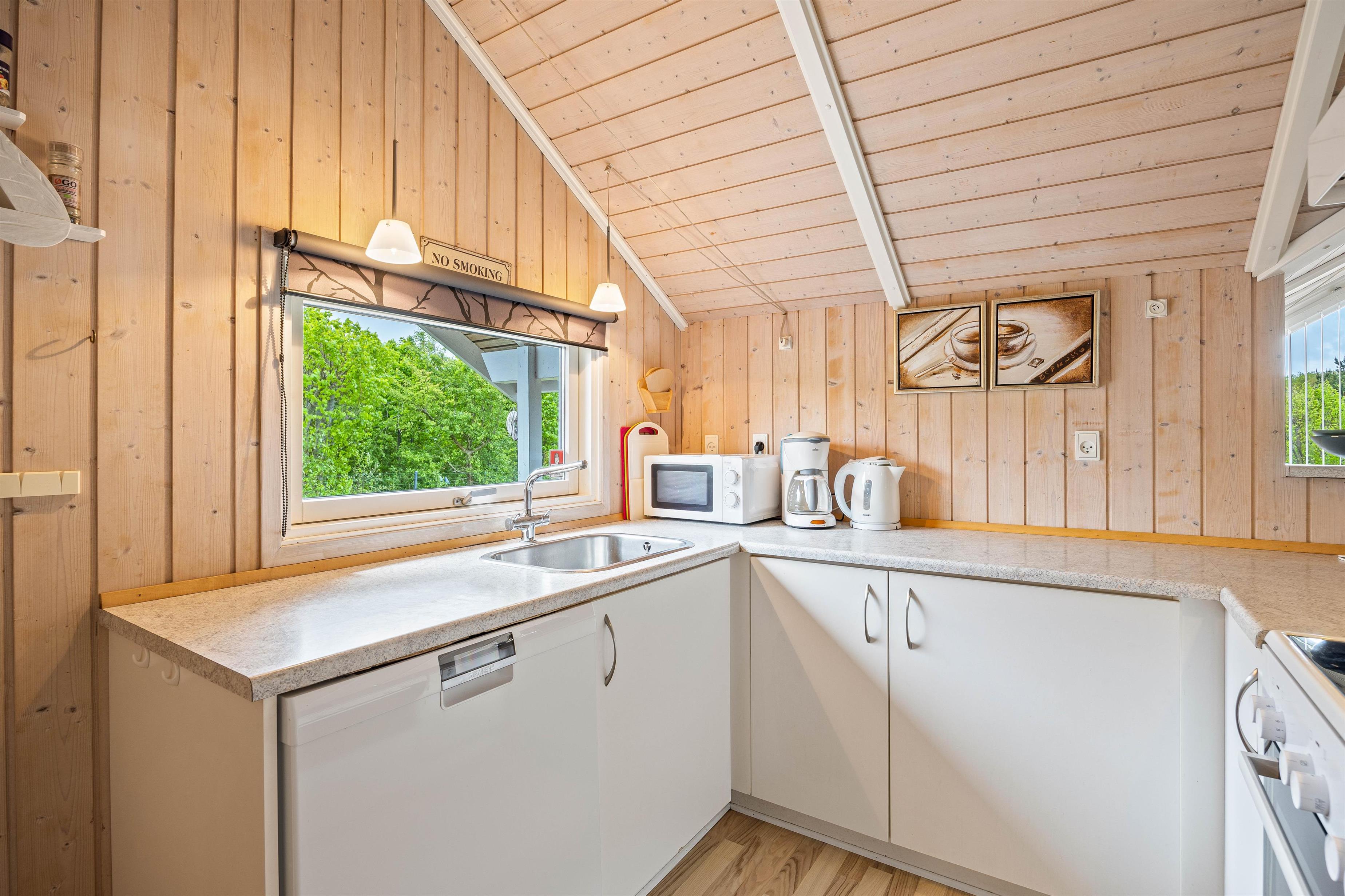 Straks når I træder ind i entreen, vil I mærke sommerhusstemningen. De lyse trævægge og store vinduer giver et dejligt, naturligt lys til hele ferieboligen. Det store opholdsrum er hjertet i sommerhuset. Her er stue, spiseplads og køkken samlet, så I kan nyde hinandens nærvær, mens nogle spiller et brætspil eller læser en god bog i sofaen og andre står i køkkenet og tryller lækkerier frem. Sommerhuset er udstyret med både opvaskemaskine, vaskemaskine og tørretumbler, som den perfekte hjælp til hverdagens pligter.