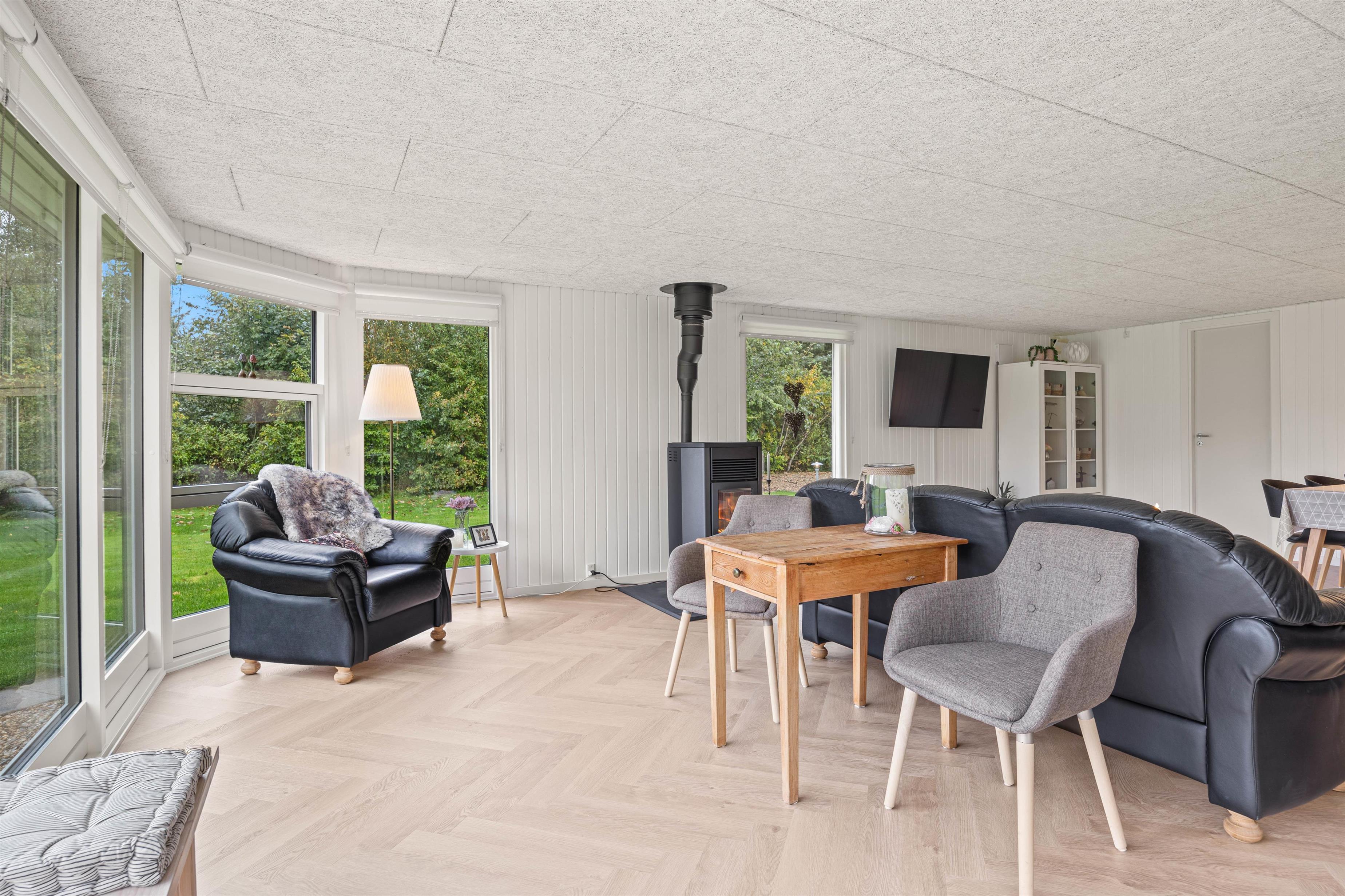 I stuen står den hyggelige brændeovn klar til at sprede varme og skaber en indbydende stemning på kølige aftener – træpillerne kan nemt købes direkte ved sommerhuset. Badeværelset med badekar indbyder til lange, afslappende bade, mens gæstetoilettet sørger for praktisk komfort, når alle skal bruge faciliteterne samtidig.