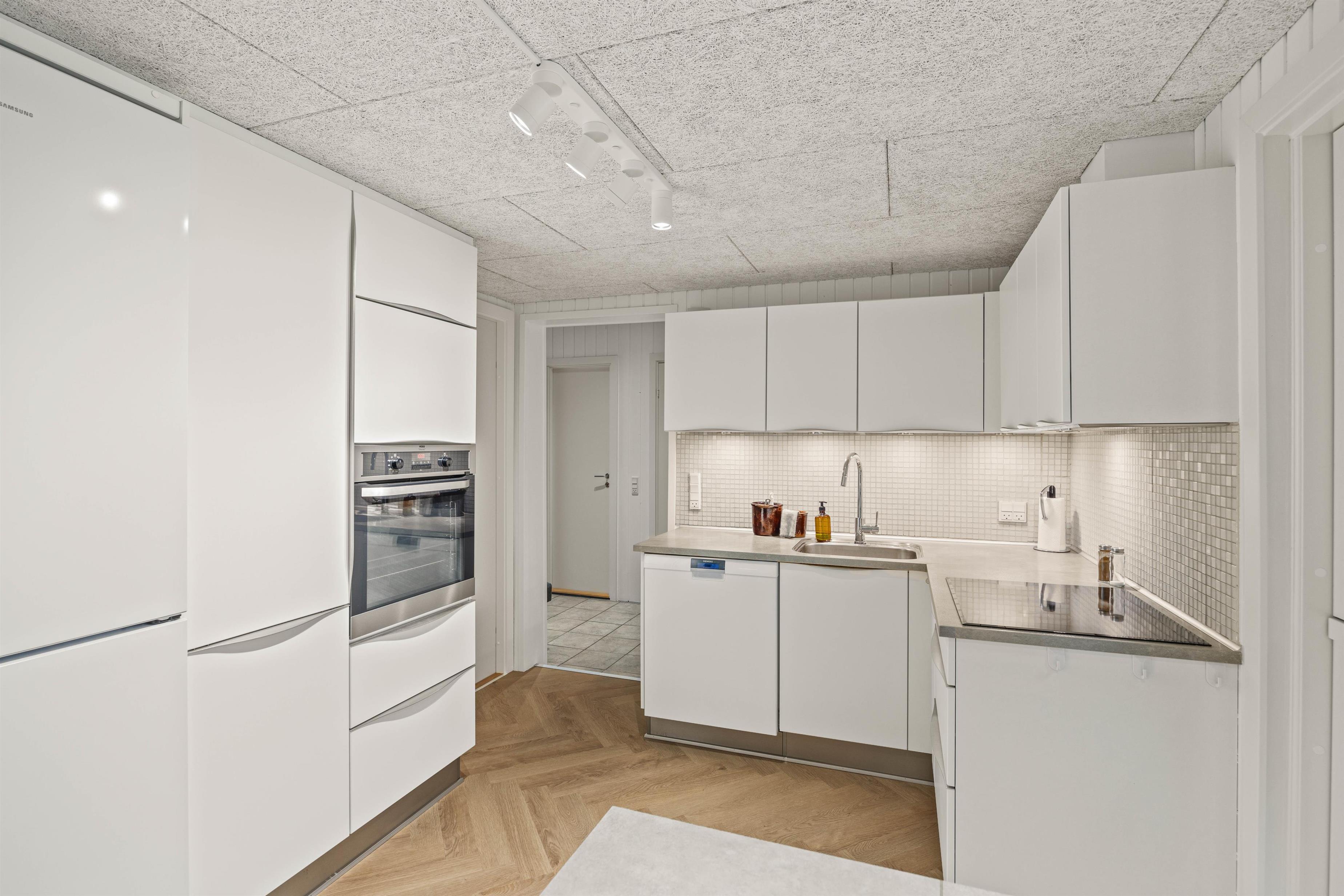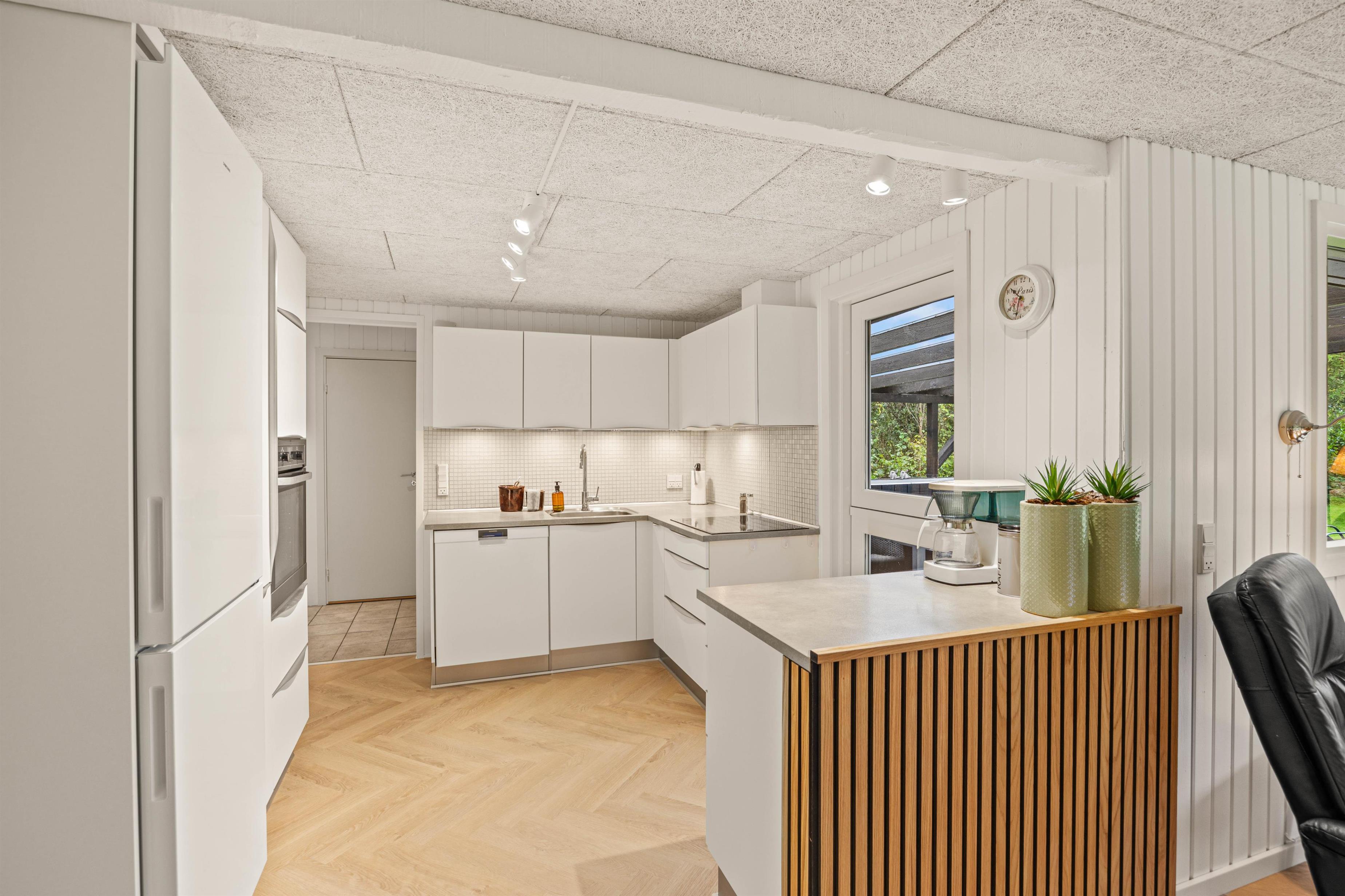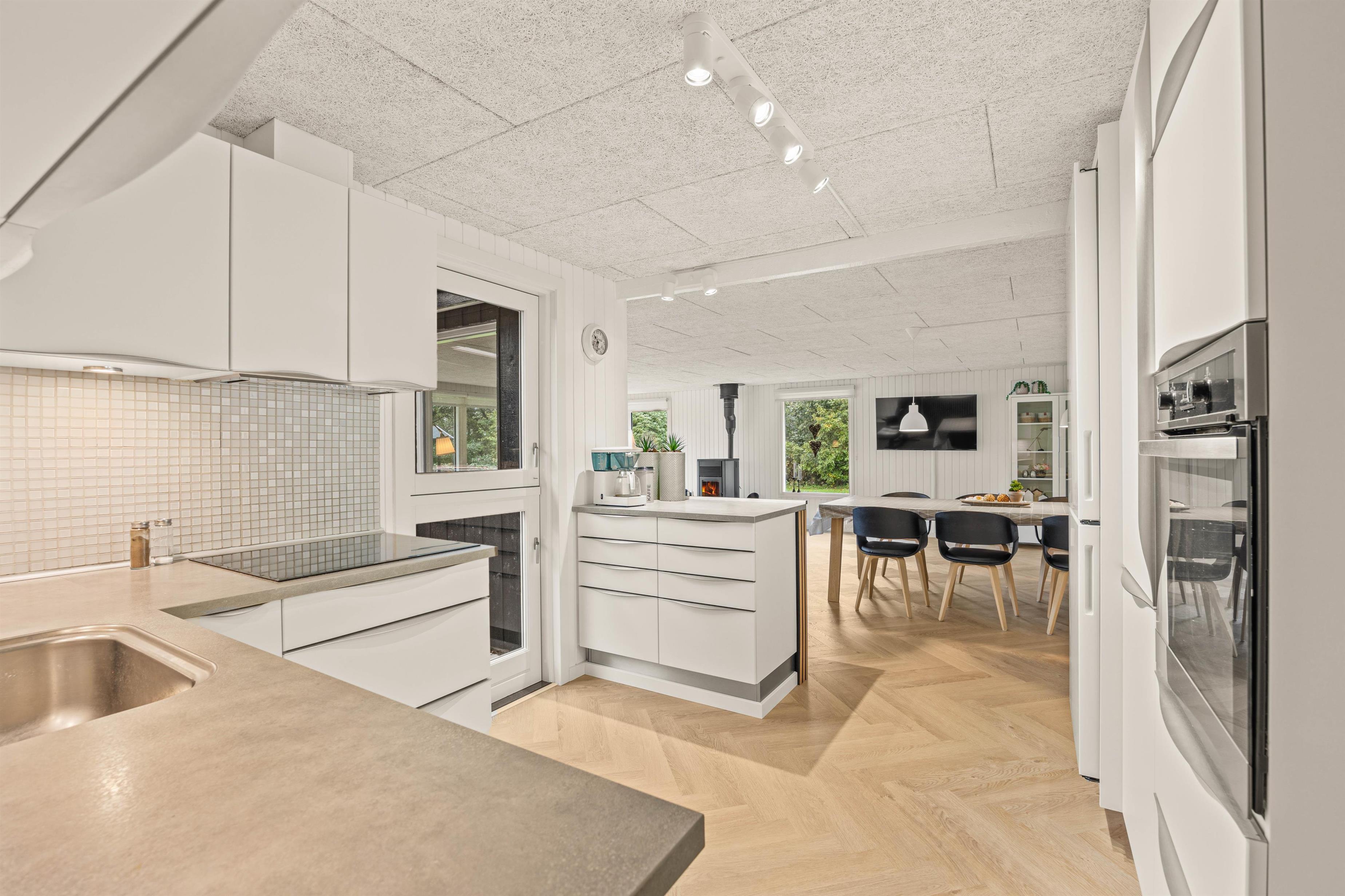 Når I træder indenfor, bliver I mødt af et veludstyret og komfortabelt miljø, der er skabt til at gøre opholdet så behageligt som muligt. Inde i sommerhuset finder I vaskemaskinen, så frisk tøj og håndklæder altid er lige ved hånden. Fortsætter I videre, åbner køkkenet sig op – her er det en fornøjelse at lave mad, og opvaskemaskinen sørger for, at oprydningen går hurtigt og ubesværet.