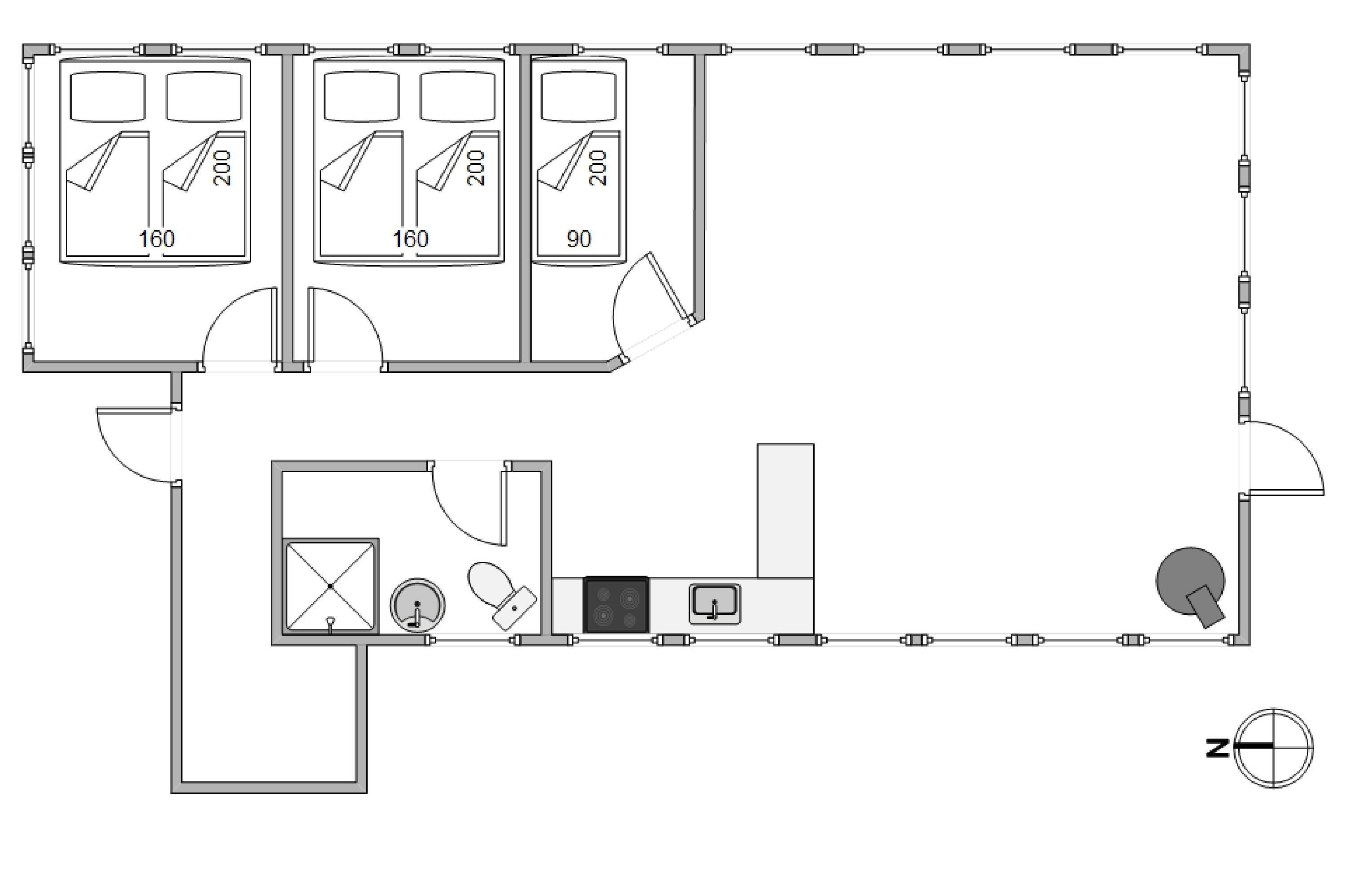 Det smukke, åbne køkken er fuldt udstyret, inklusive en praktisk opvaskemaskine, så I nemt kan tilberede jeres måltider uden at skulle bekymre jer om opvasken. I alt 3 soveværelser, udstyret med 2 dobbeltsenge og 1 enkeltseng, sikrer afslappende nætter og privatliv for alle gæster. Det lille badeværelse har gulvvarme og sikrer, at I ikke får kolde fødder, selv på køligere dage.