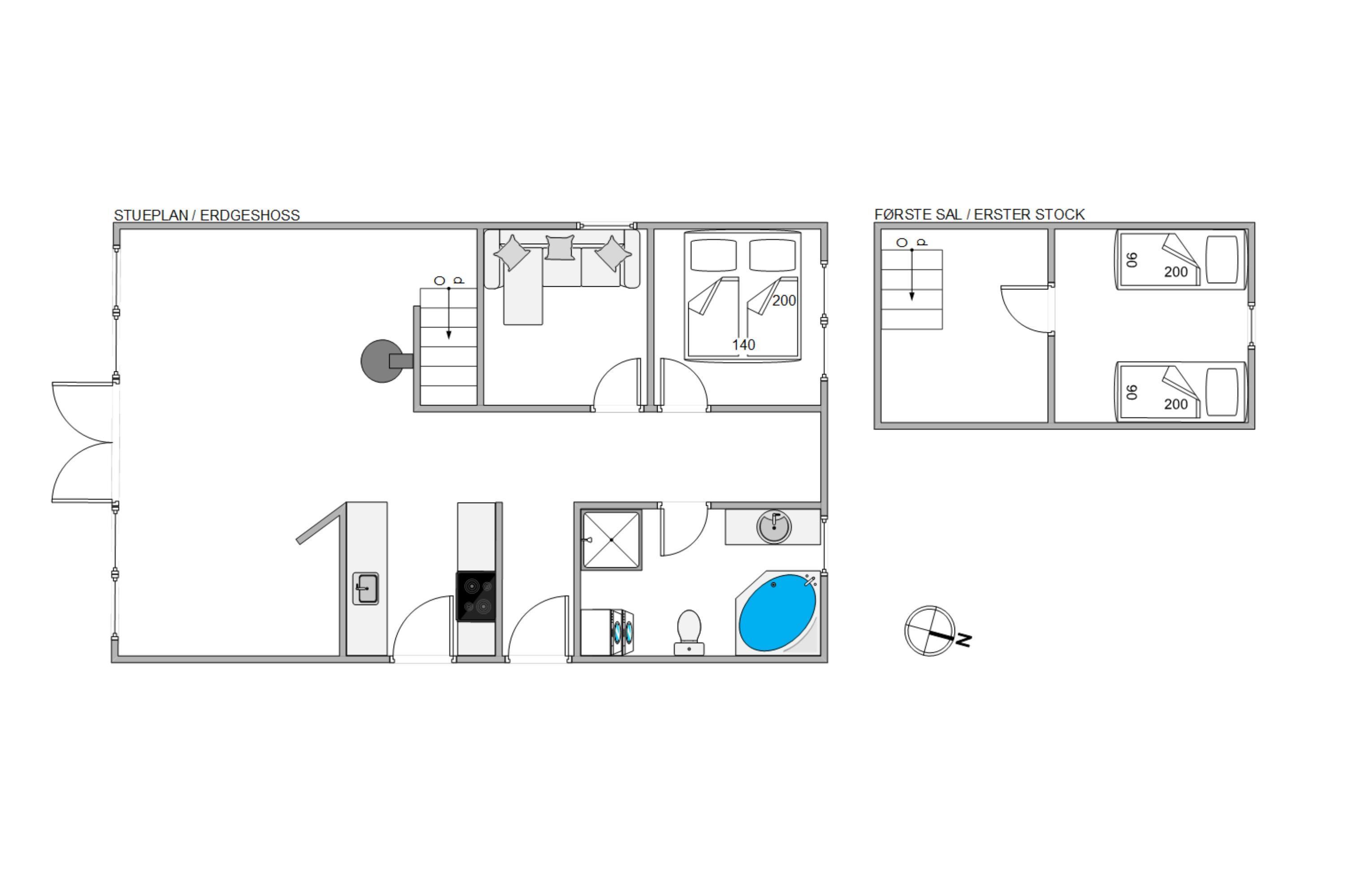Indenfor byder sommerhuset på et stilfuldt samtalekøkken, der åbner sig op mod spisestue og opholdsstue, hvilket skaber en hyggelig og social atmosfære for alle gæster. I opholdsstuen vil I finde en hyggelig brændeovn, som bliver et naturligt samlingspunkt, hvor man kan nyde varmen og en afslappende aften efter en dag fyldt med oplevelser.