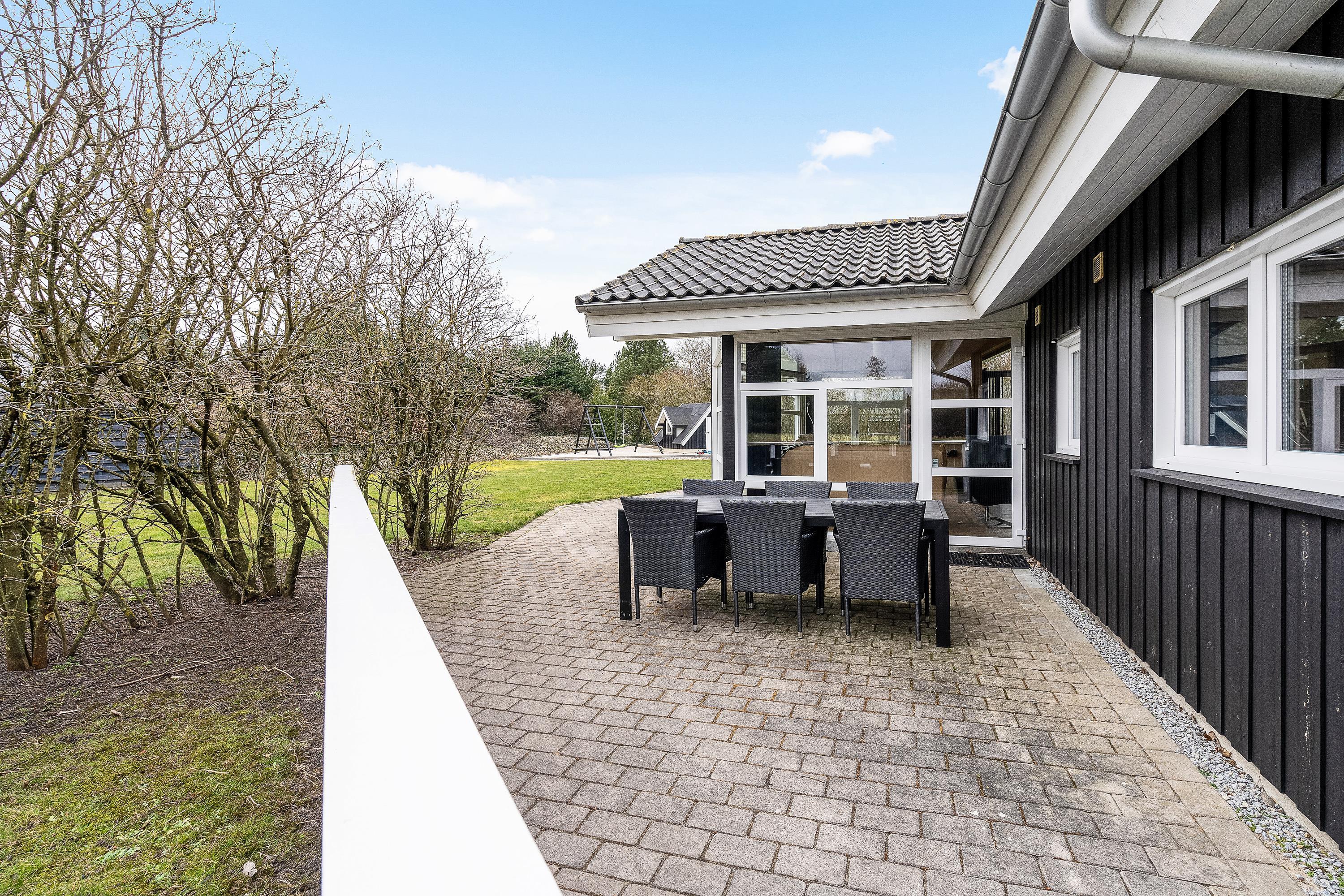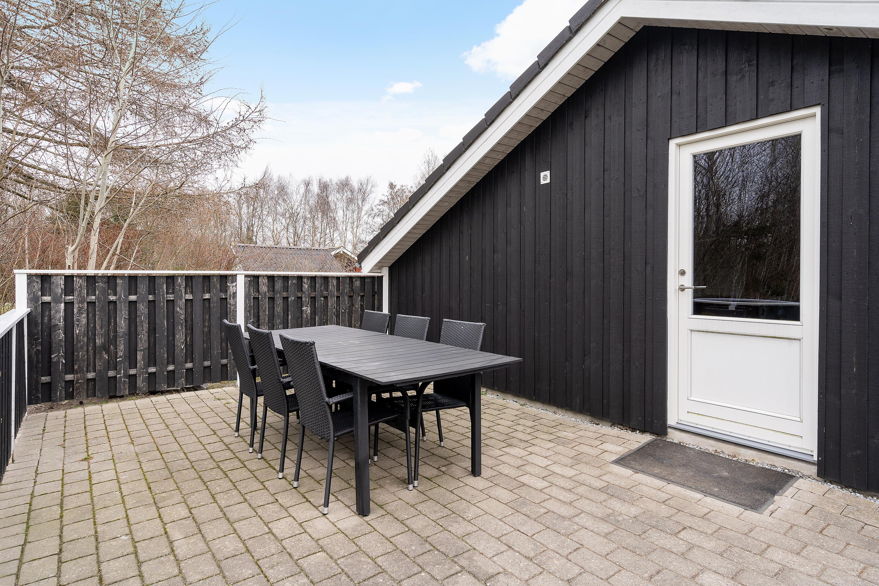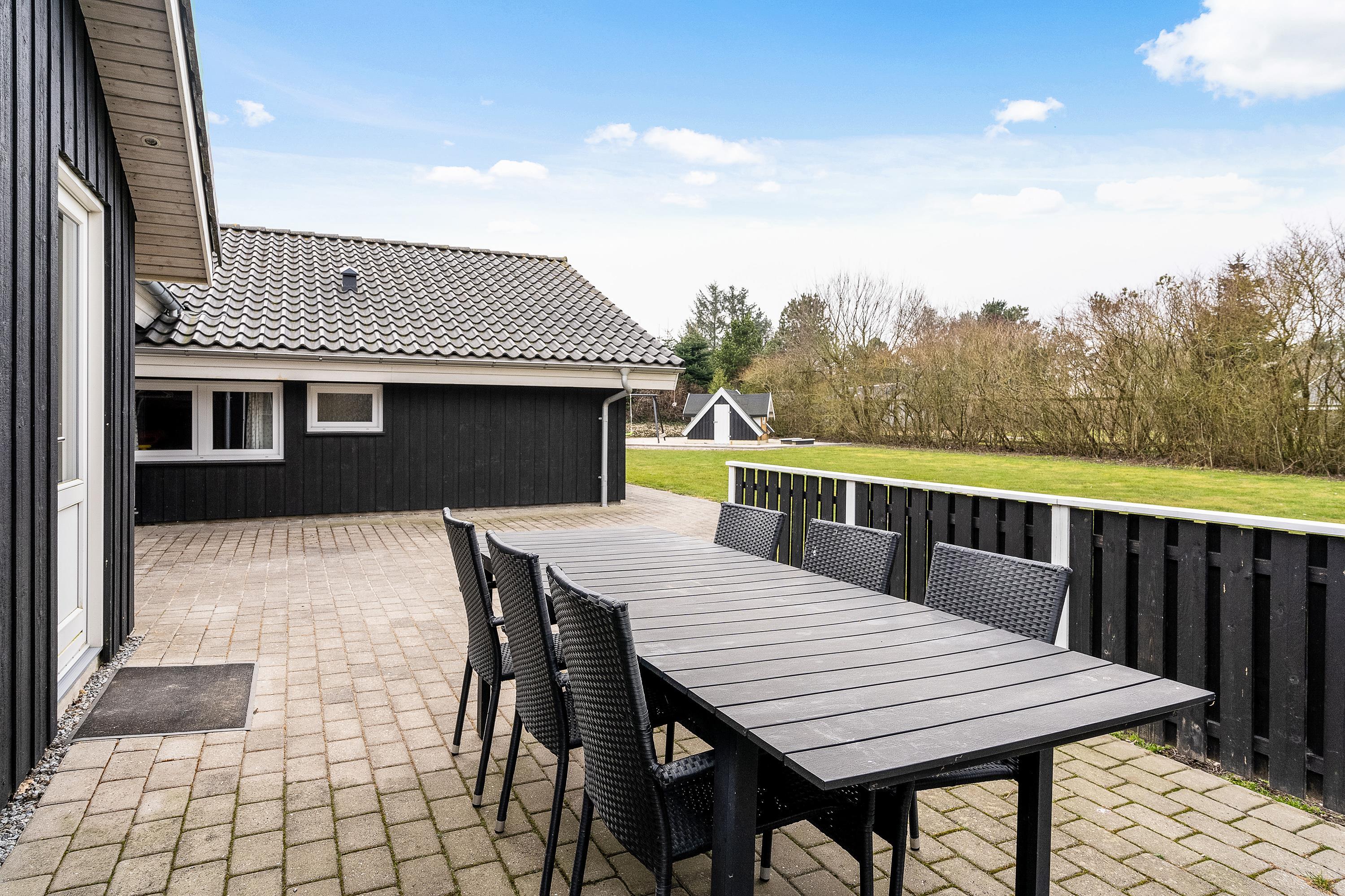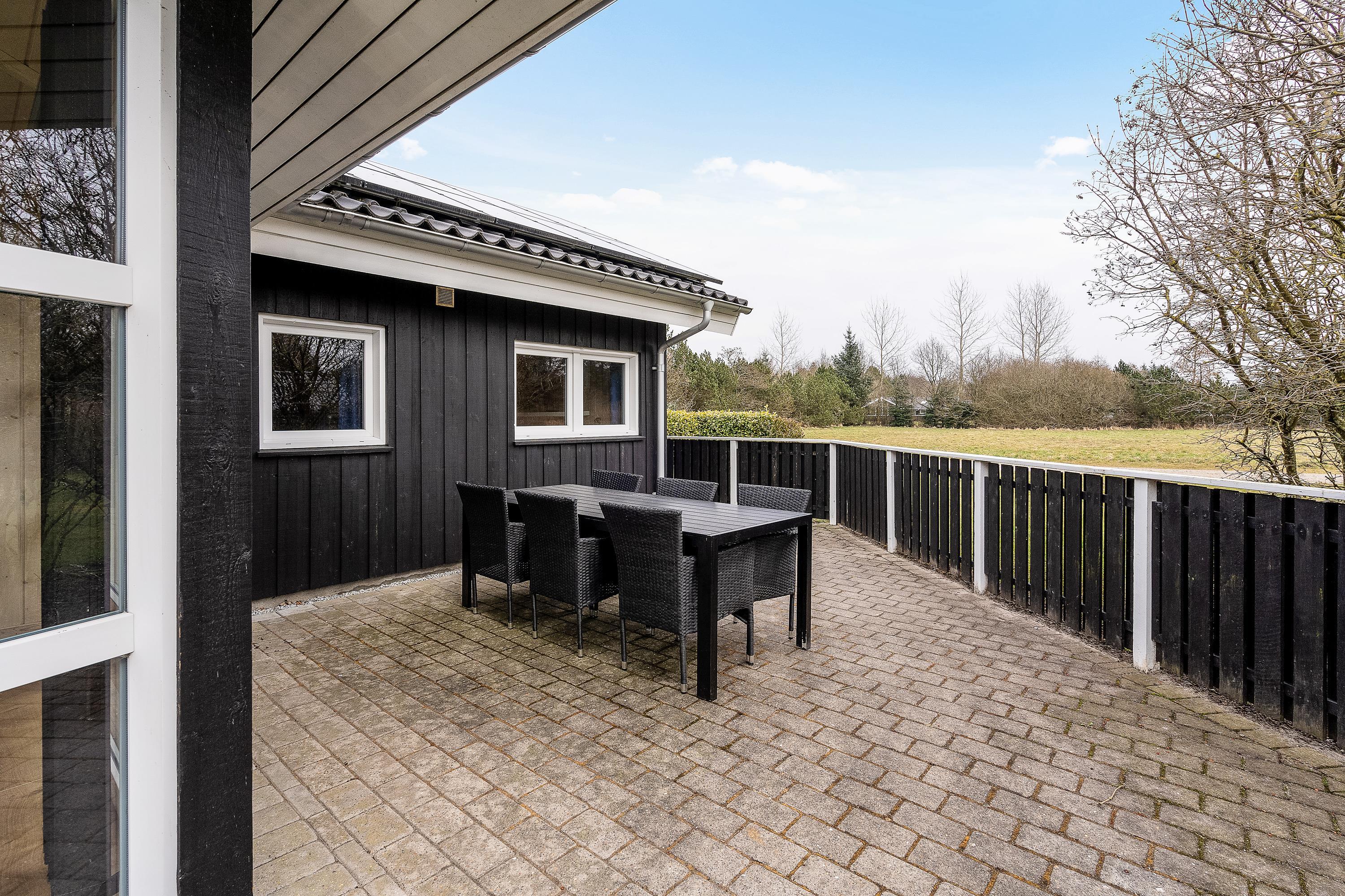 Fra stuen kan I træde ud på den store terrasse, som strækker sig hele vejen rundt om sommerhuset og tilbyder mange muligheder for at nyde det friske danske sommervejr. Fliserne rundt om huset gør det nemt at finde en solrig plet eller træde ind i skyggen for en behagelig pause.
