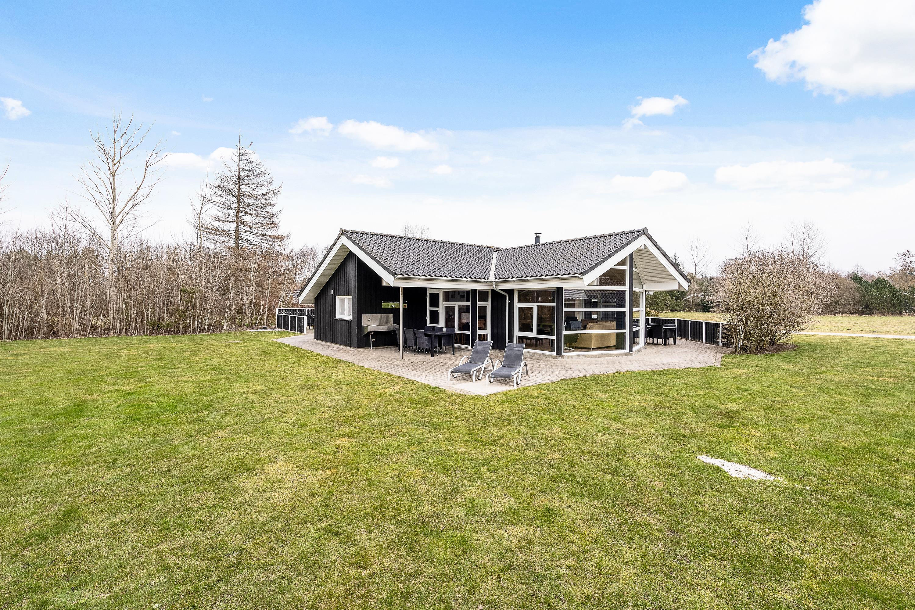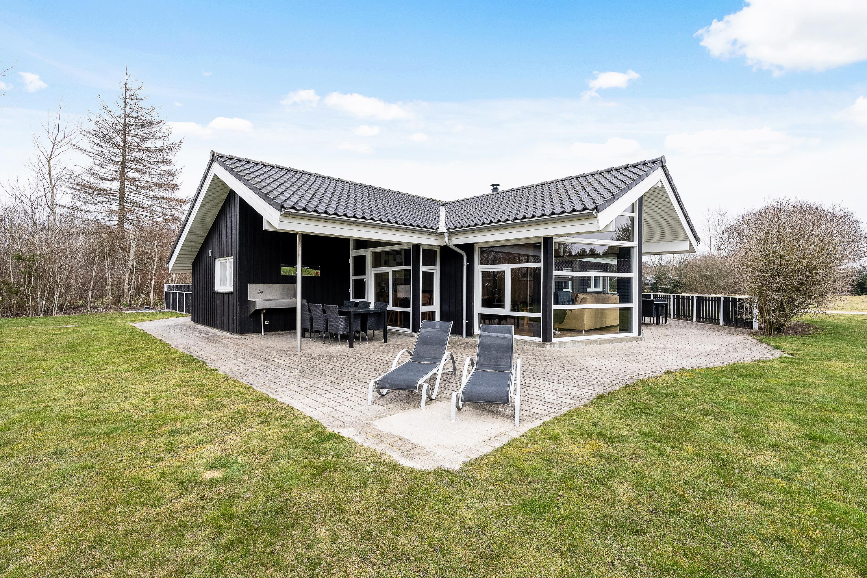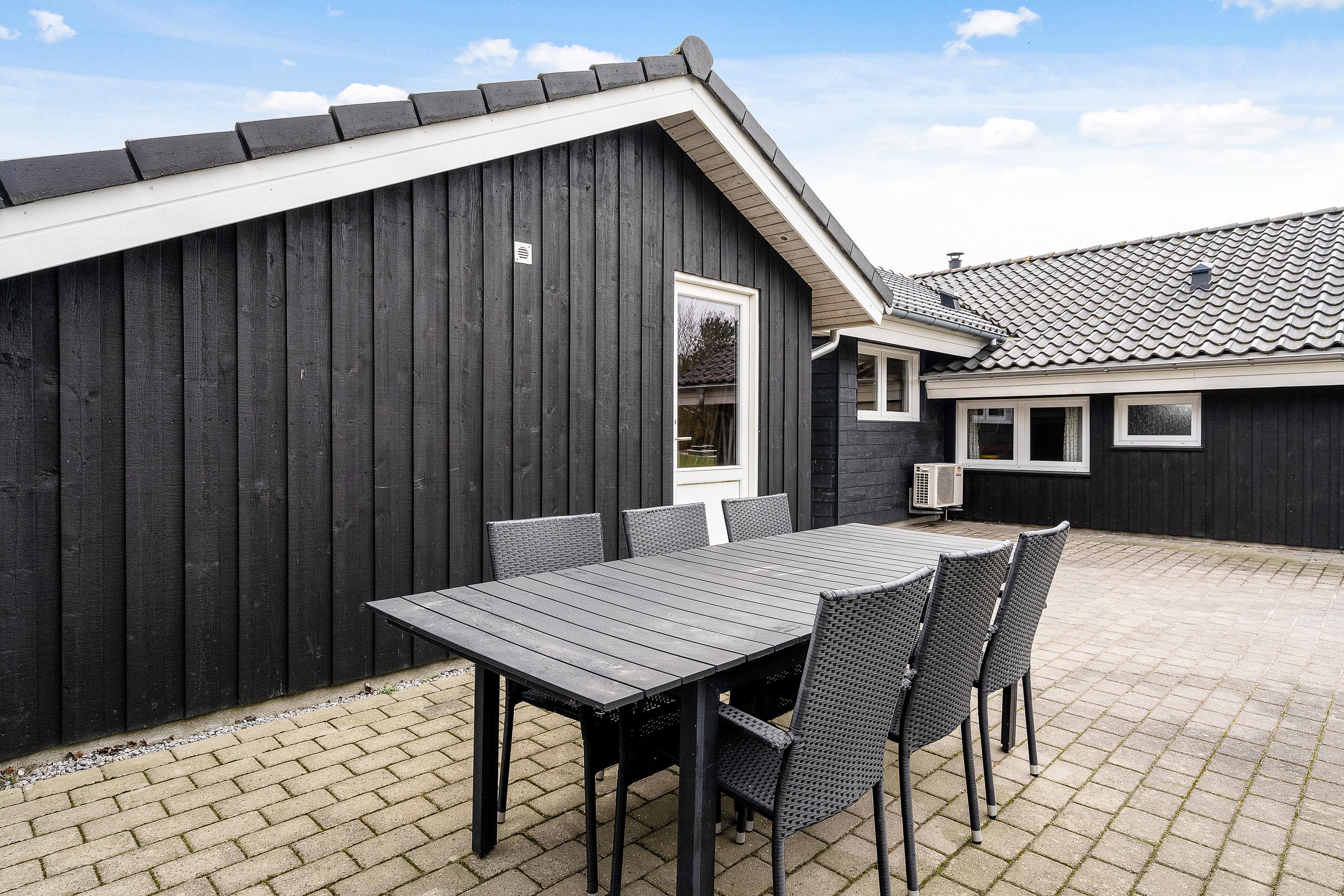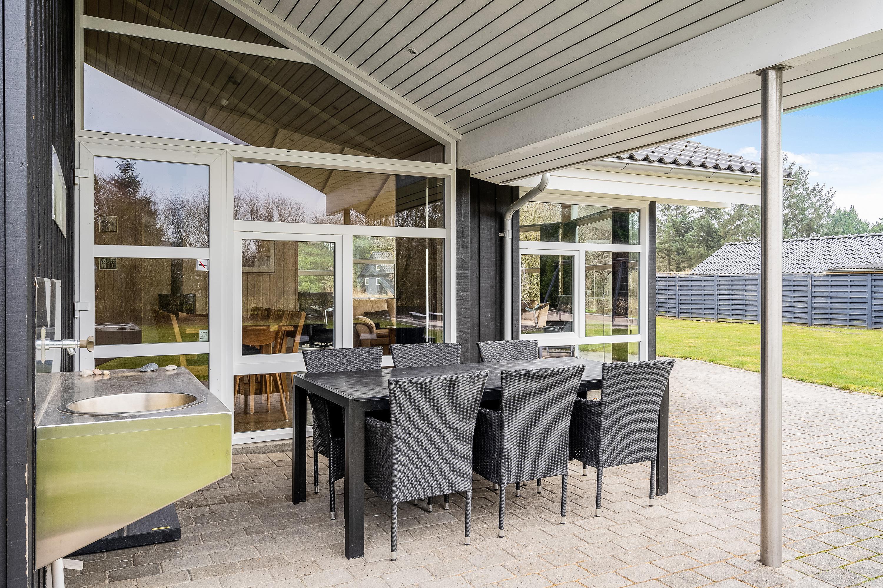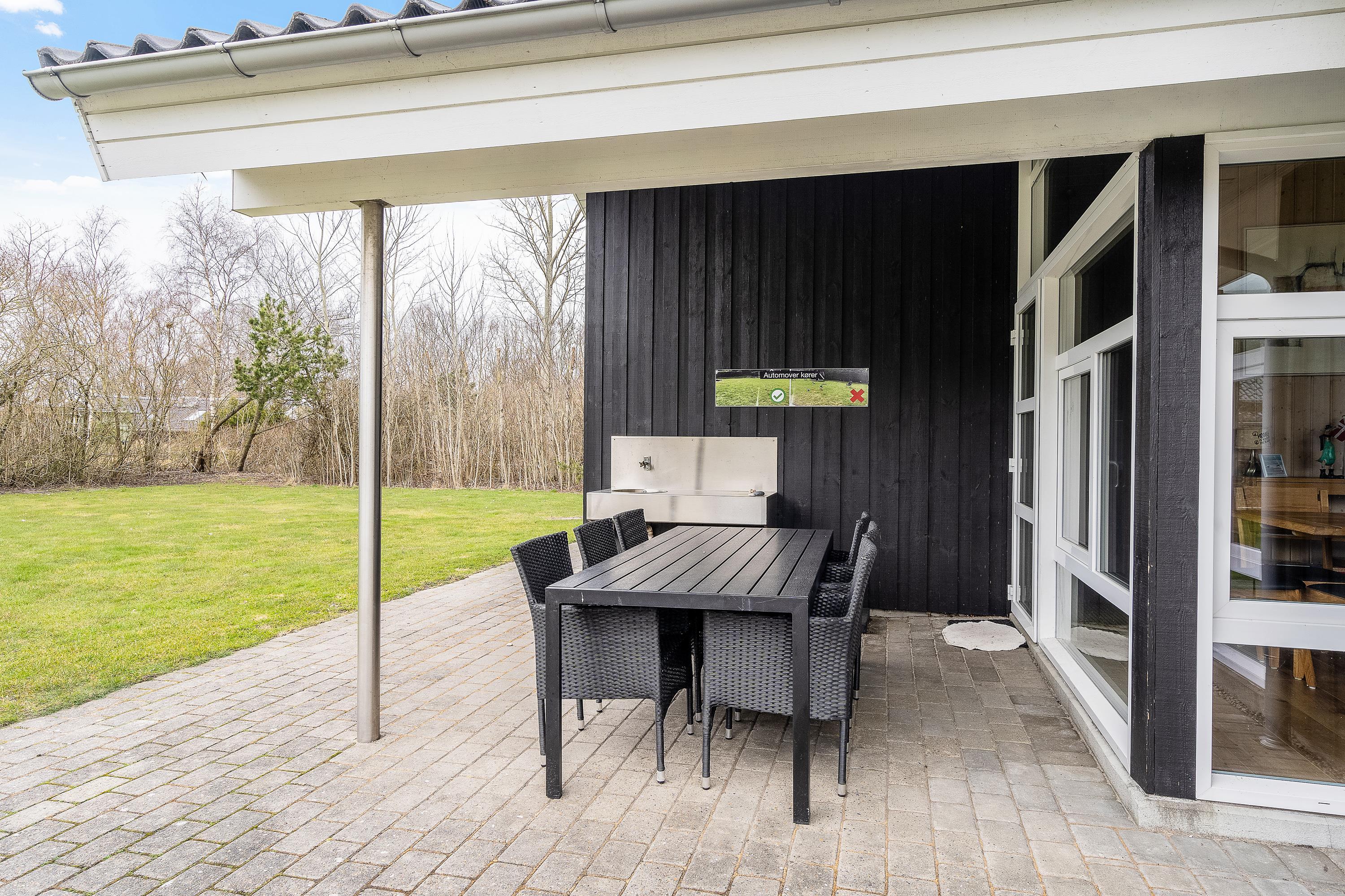 Fra stuen kan I træde ud på den store terrasse, som strækker sig hele vejen rundt om sommerhuset og tilbyder mange muligheder for at nyde det friske danske sommervejr. Fliserne rundt om huset gør det nemt at finde en solrig plet eller træde ind i skyggen for en behagelig pause.