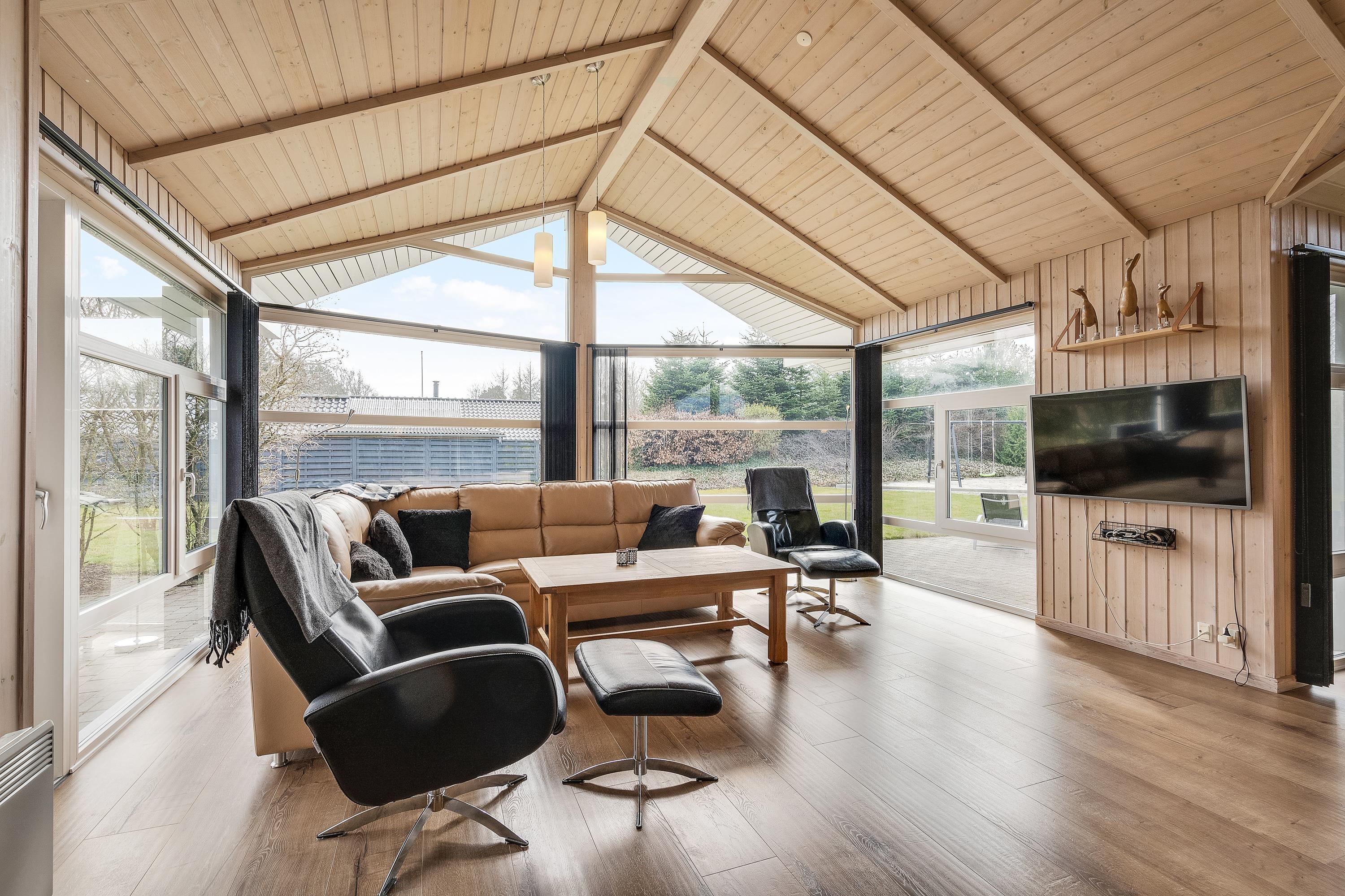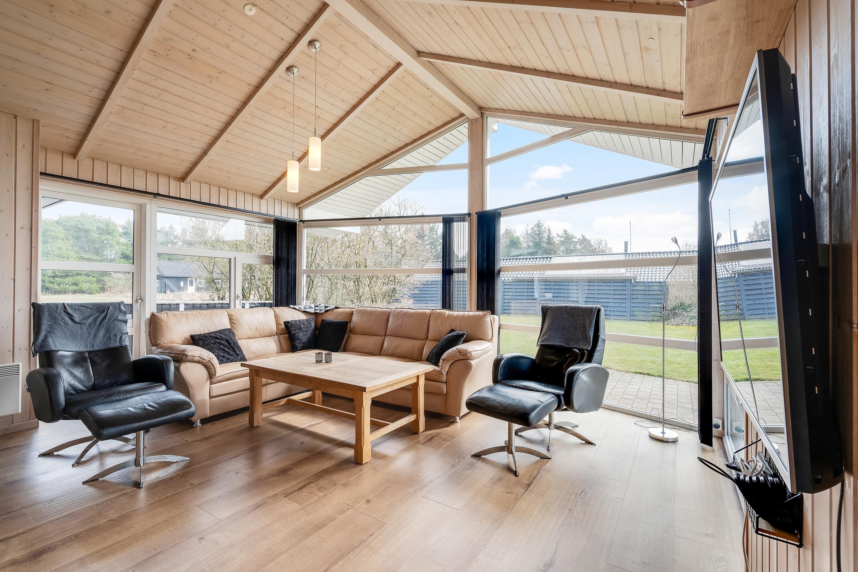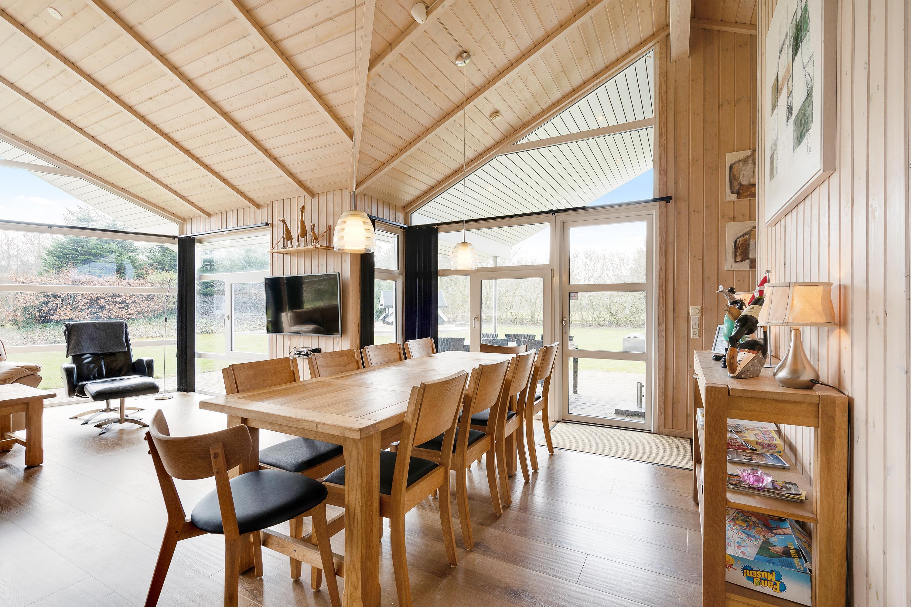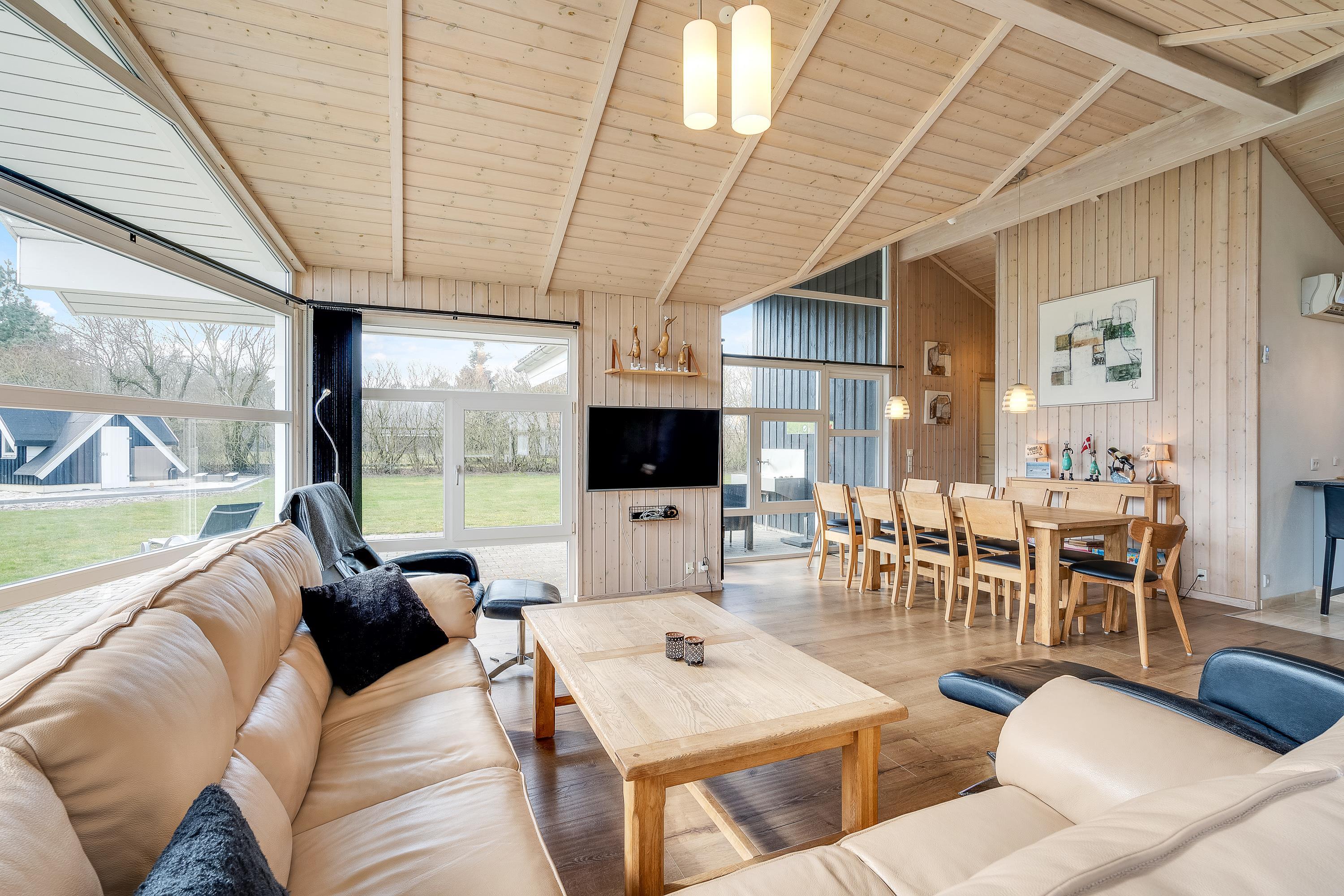 Den rummelige stue er et idéelt opholdssted for alle 10 gæster. Her kan I nyde hinandens selskab i fulde drag, selvom nogle kokkererer i køkkenet og andre slapper af foran fjernsynet. I opholdsstuen vil I opleve en fantastisk ferieatmosfære, der bliver skabt af det skønne lysfald fra de store vinduespartier.
