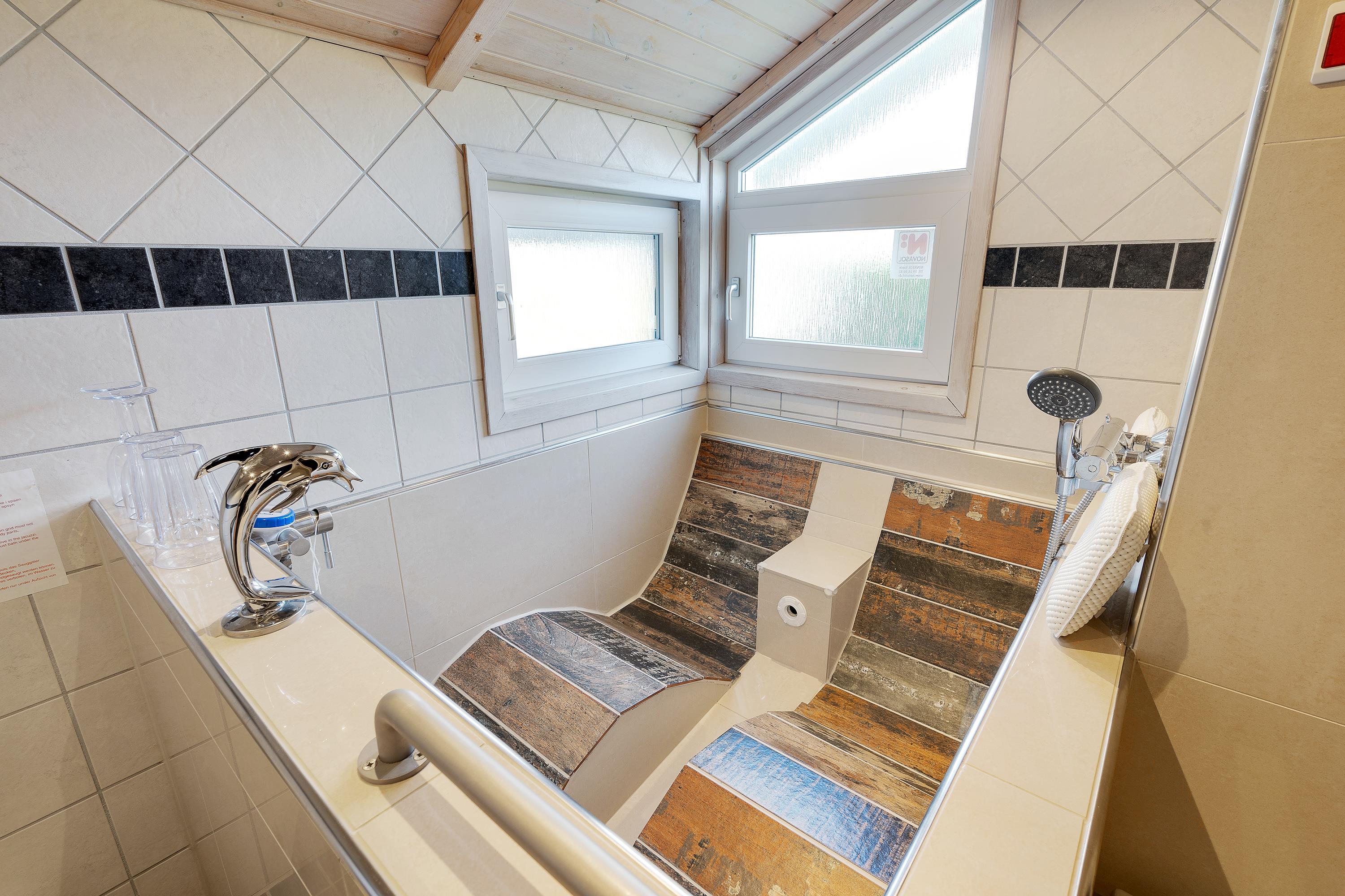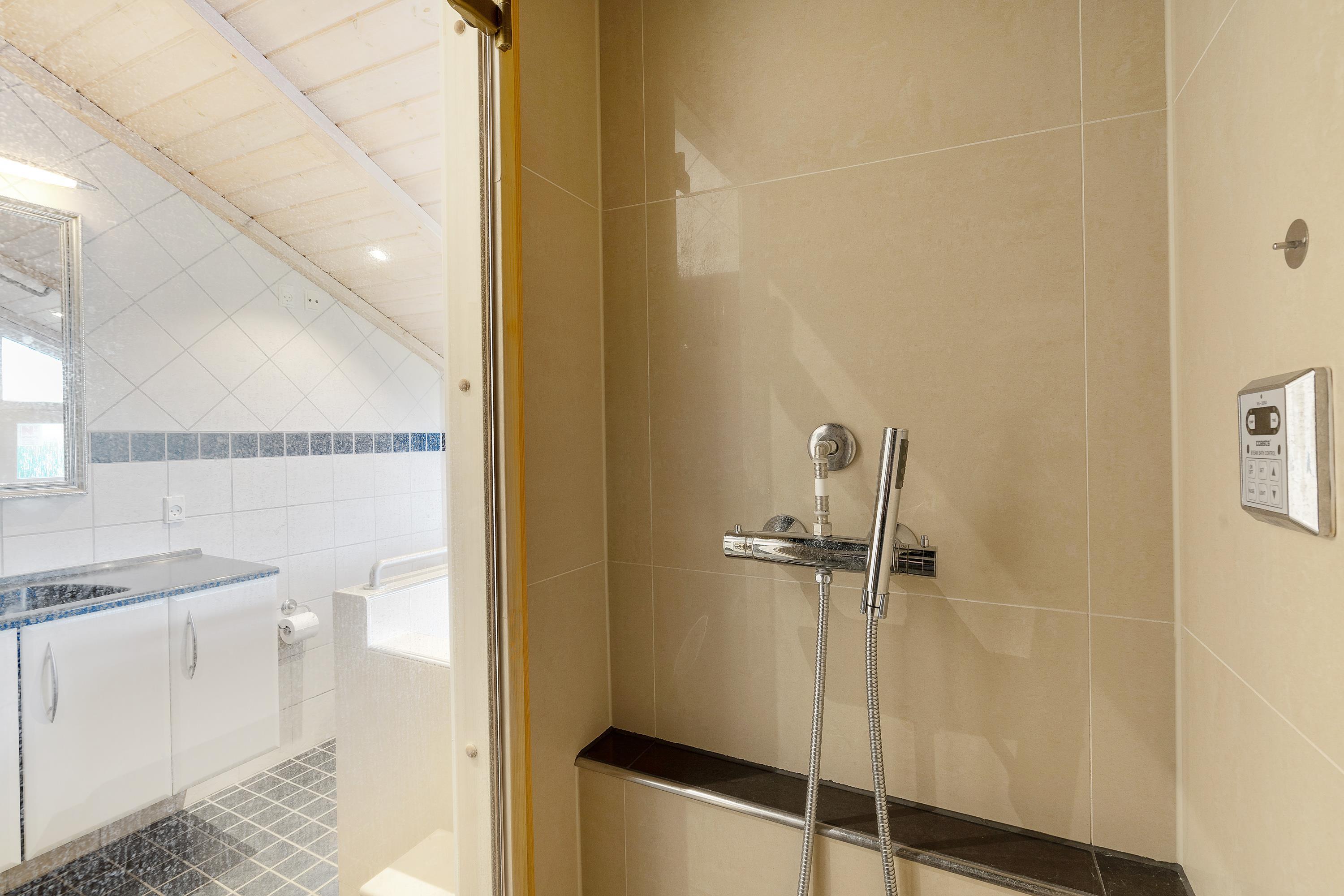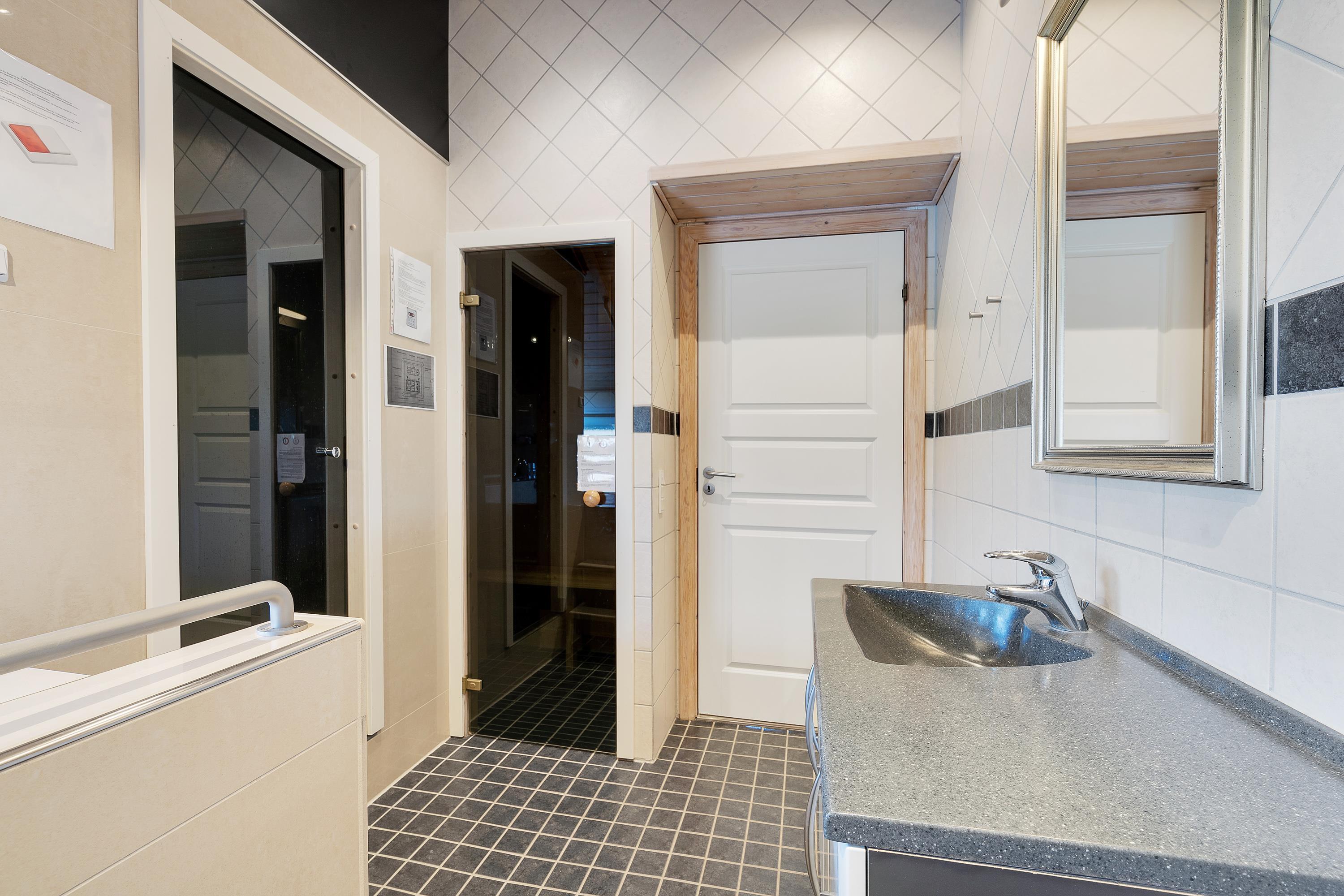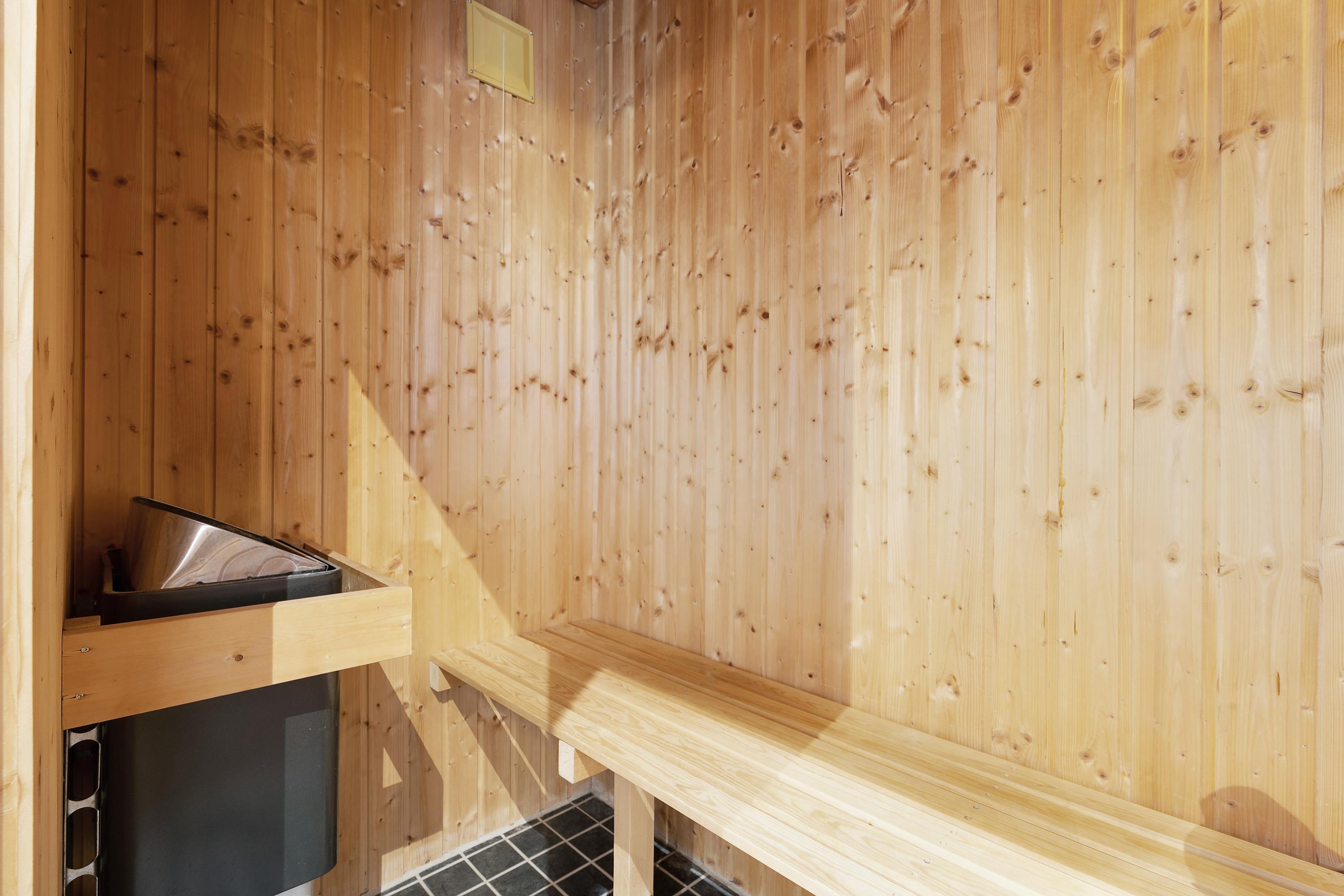 På det største badeværelse finder I både en sauna og et spabad, der inviterer til en afslappende wellnessaften i de rolige omgivelser.