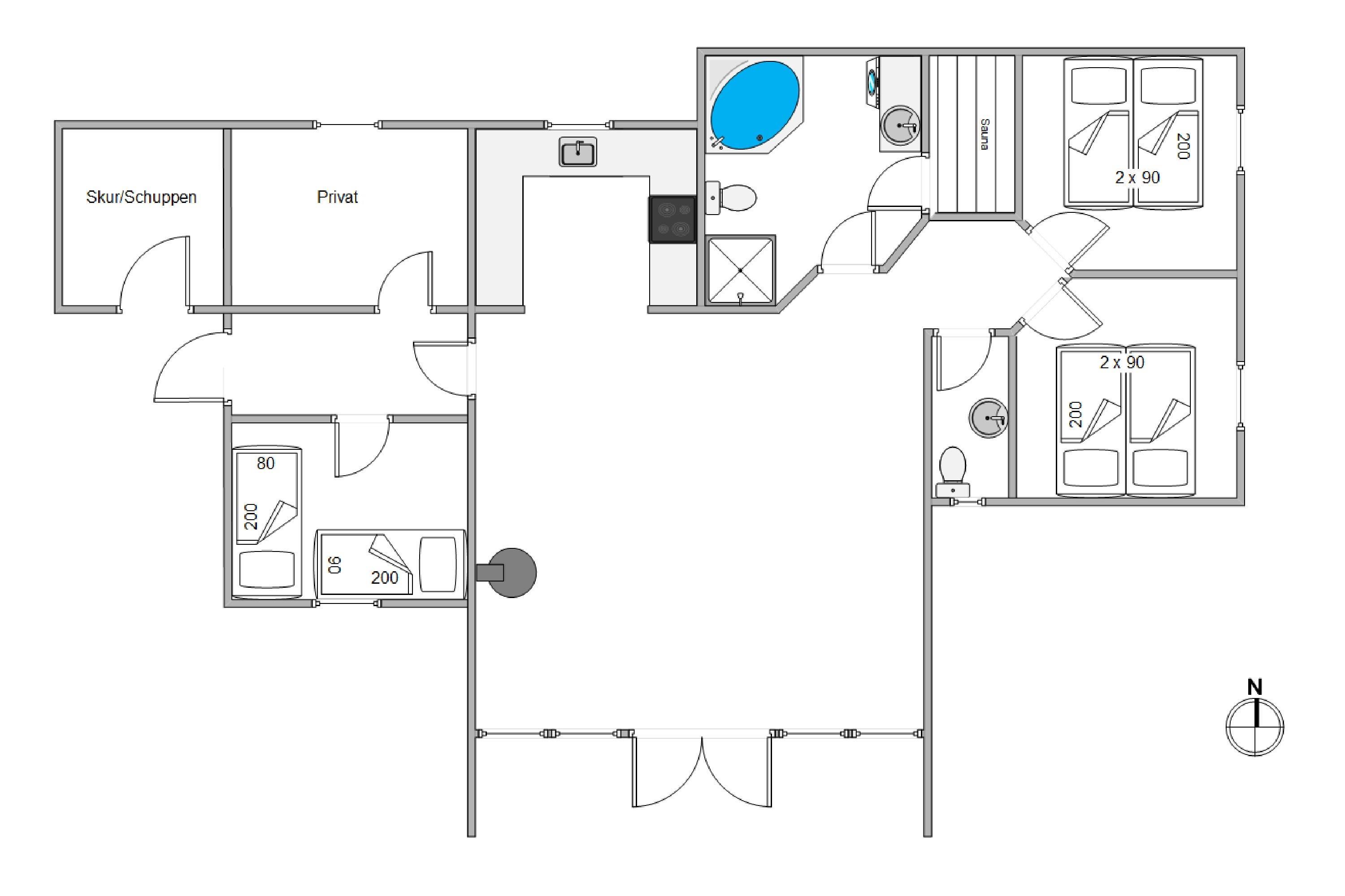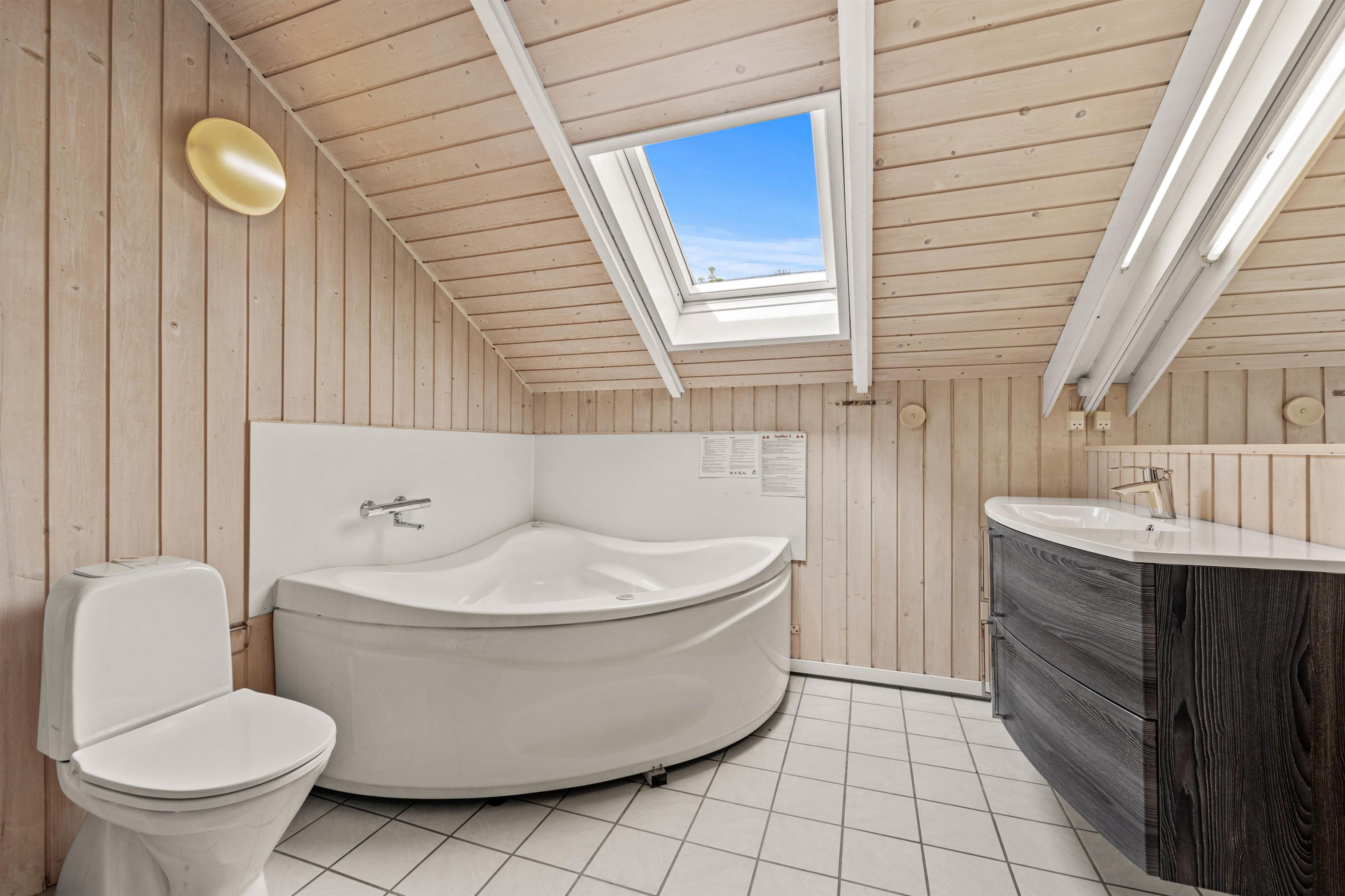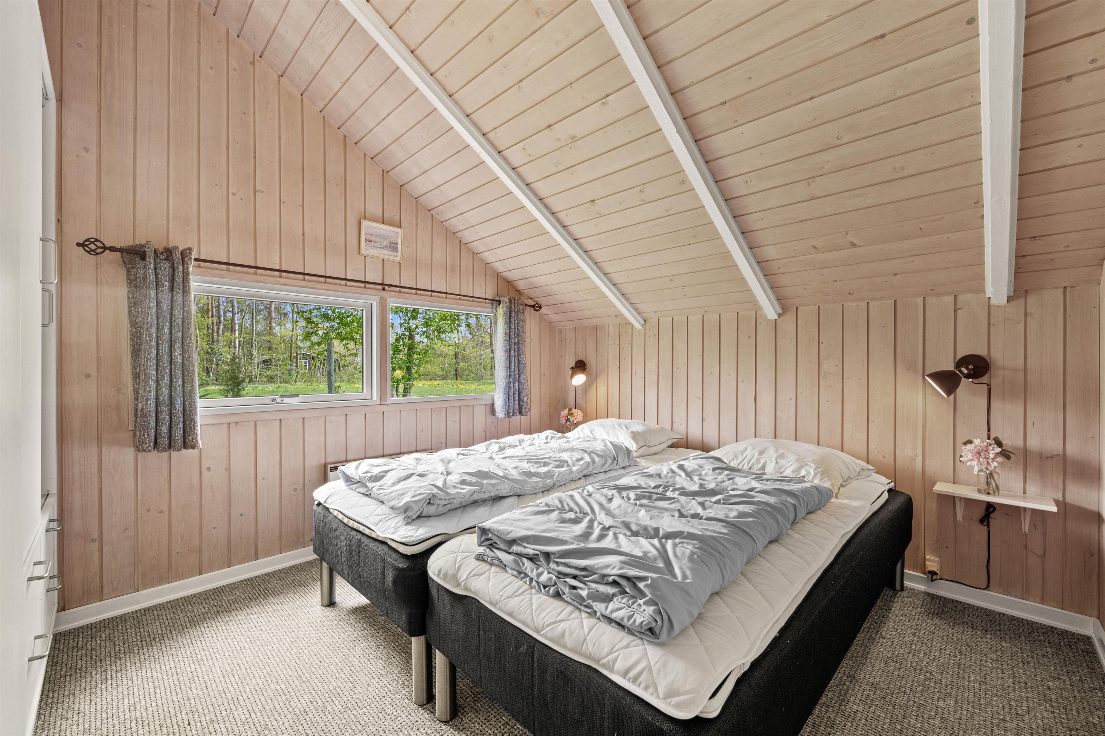På det store badeværelse kan I komme helt ned i gear og nyde ferien med spa og sauna. Sommerhuset har også et gæstetoilet, så I undgår kø om morgenen. Til aften kan I fordele jer på de 3 gode soveværelser. To af disset med dobbeltsenge, bestående af to sammensatte enkeltsenge 90x200, og det tredje med to adskilte enkeltsenge. Barneseng og højstol befinder sig allerede i feriehuset, ligesom her er en vaskemaskine, særligt praktisk med småbørn.