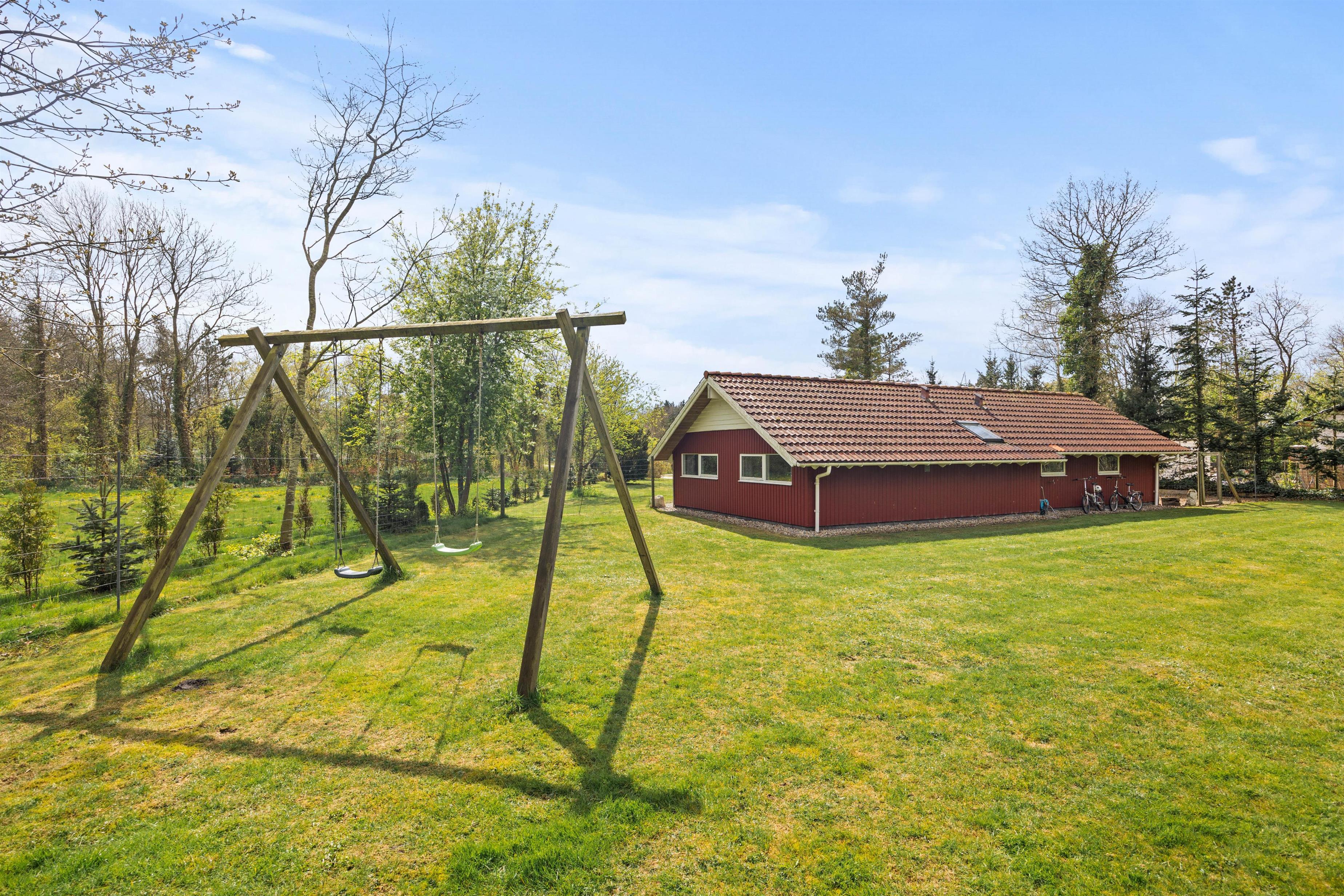 På bagsiden af feriehuset finder I blandt andet sandkasse og gynger. Også her er en del af haven indhegnet, så det er muligt at lade hunden snuse frit omkring.