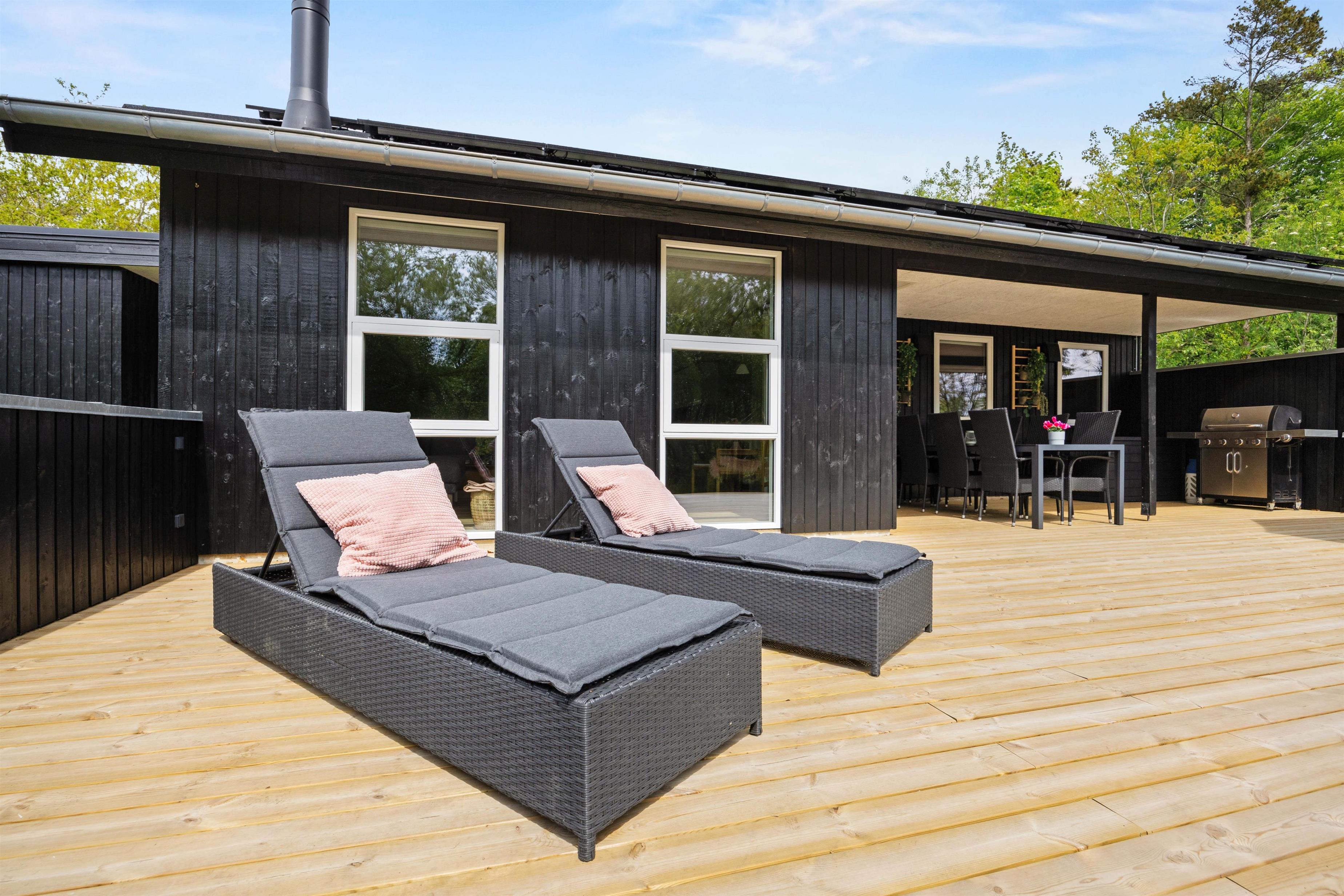 Den åbne terrasse er perfekt til solrige dage, hvor I kan nyde et måltid under åben himmel, mens den overdækkede terrasse giver skygge og ly på regnfulde dage, så I altid kan være udendørs uanset vejret.