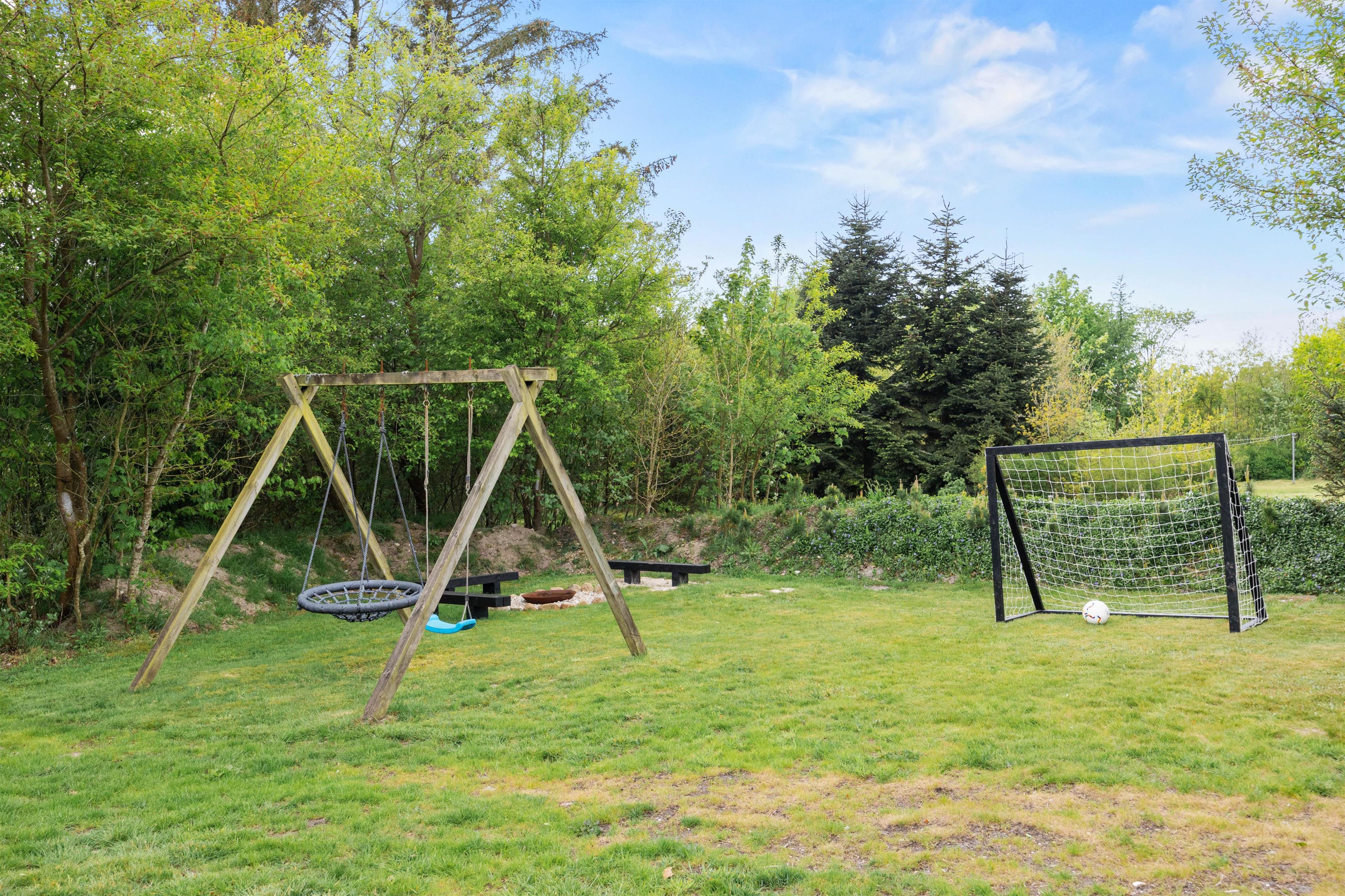 Der er desuden et bålsted, som indbyder til hyggelige aftener med snobrød og skumfiduser. For fodboldentusiaster er der fodboldmål i haven, og der er også forskellige havespil til rådighed, så I kan nyde sjove aktiviteter sammen.