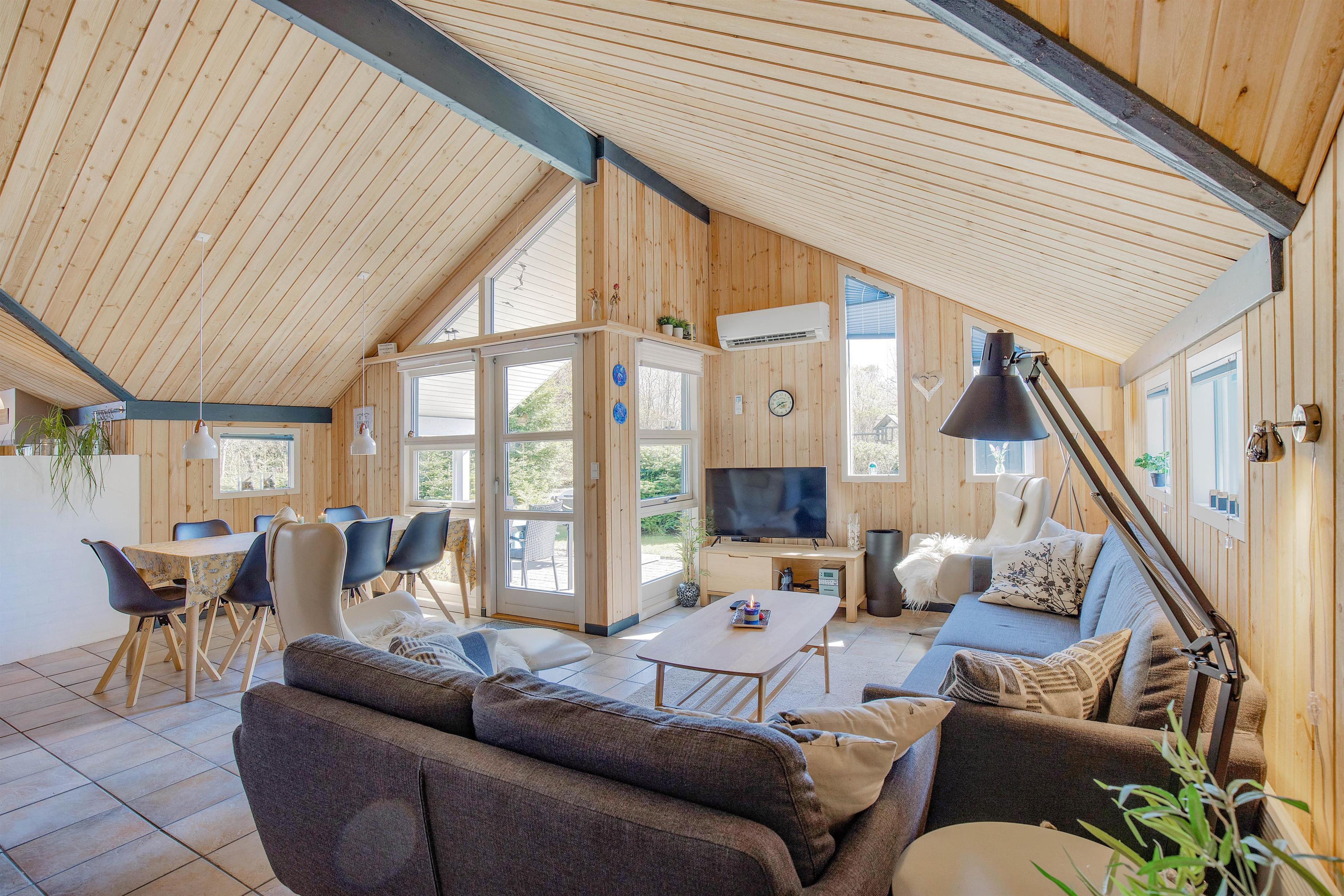 Den åbne planløsning danner det store samlingspunkt i feriehuset, hvor køkken, stue og spiseplads bliver forenet. Her er rammerne sat for mange hyggelige feriestunder med madlavning, spil og film – I kan endda streame familiens favoritfilm via Chromecasten.