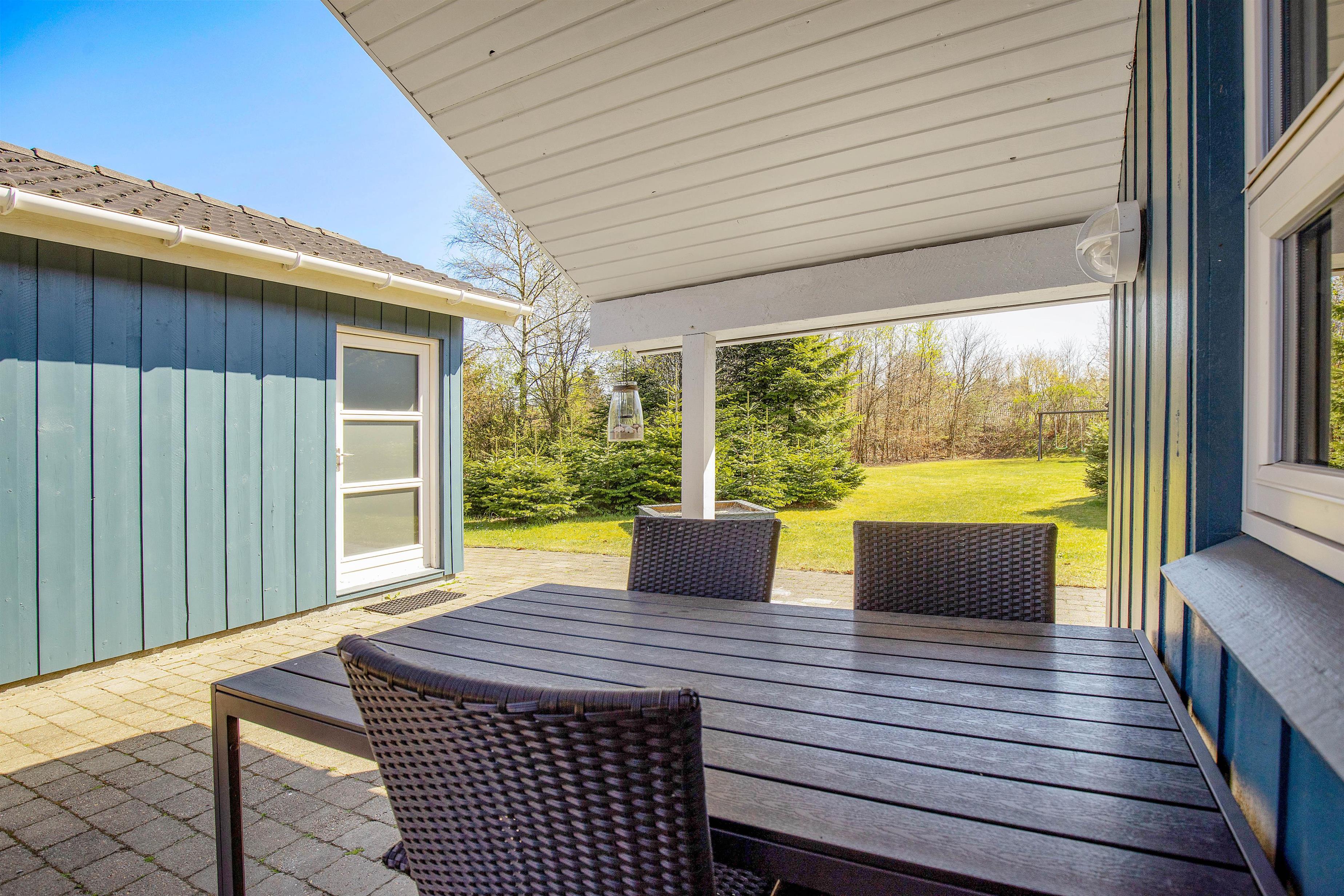 Til feriens yngste er der både en sandkasse og et gyngestativ i haven. Mens de leger i haven, kan de voksne slappe af på terrassen, hvor I har havemøbler og liggestole til rådighed, som I kan finde jer til rette i på et godt solspot. Om aftenen kan I alle samles på terrassen til en lækker middag, som I kan tilberede på feriehusets gasgrill.