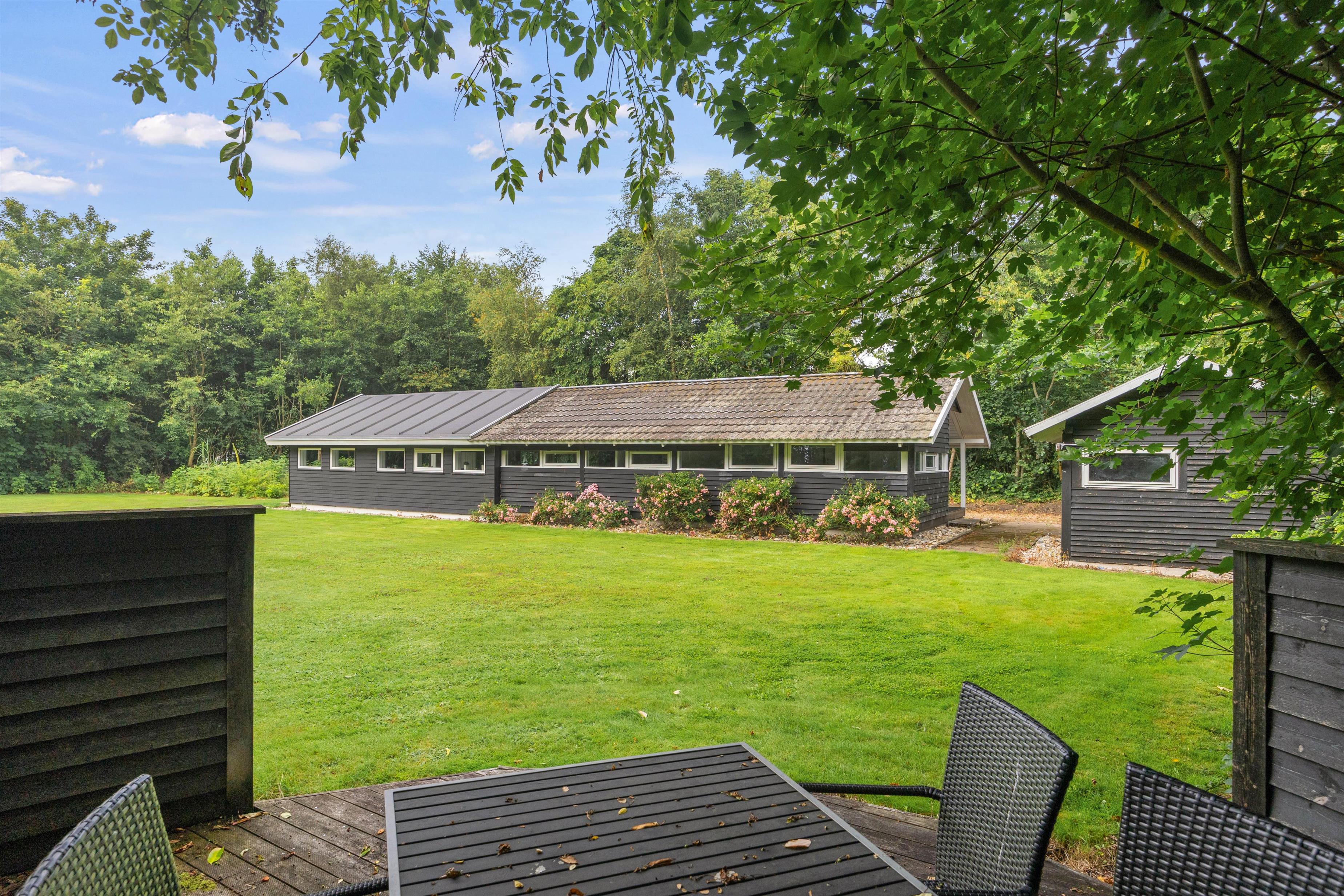 Udendørsarealerne skal selvfølgelig nydes på de lune sommerdage. Grunden er fint afskærmet af de store træer, og her kan I både spille kongespil eller dase i solen – havemøbler og liggestole står klar til jer. Skønt er her også en fin grøn græsplæne, der indbyder til aktiviteter for store som små.