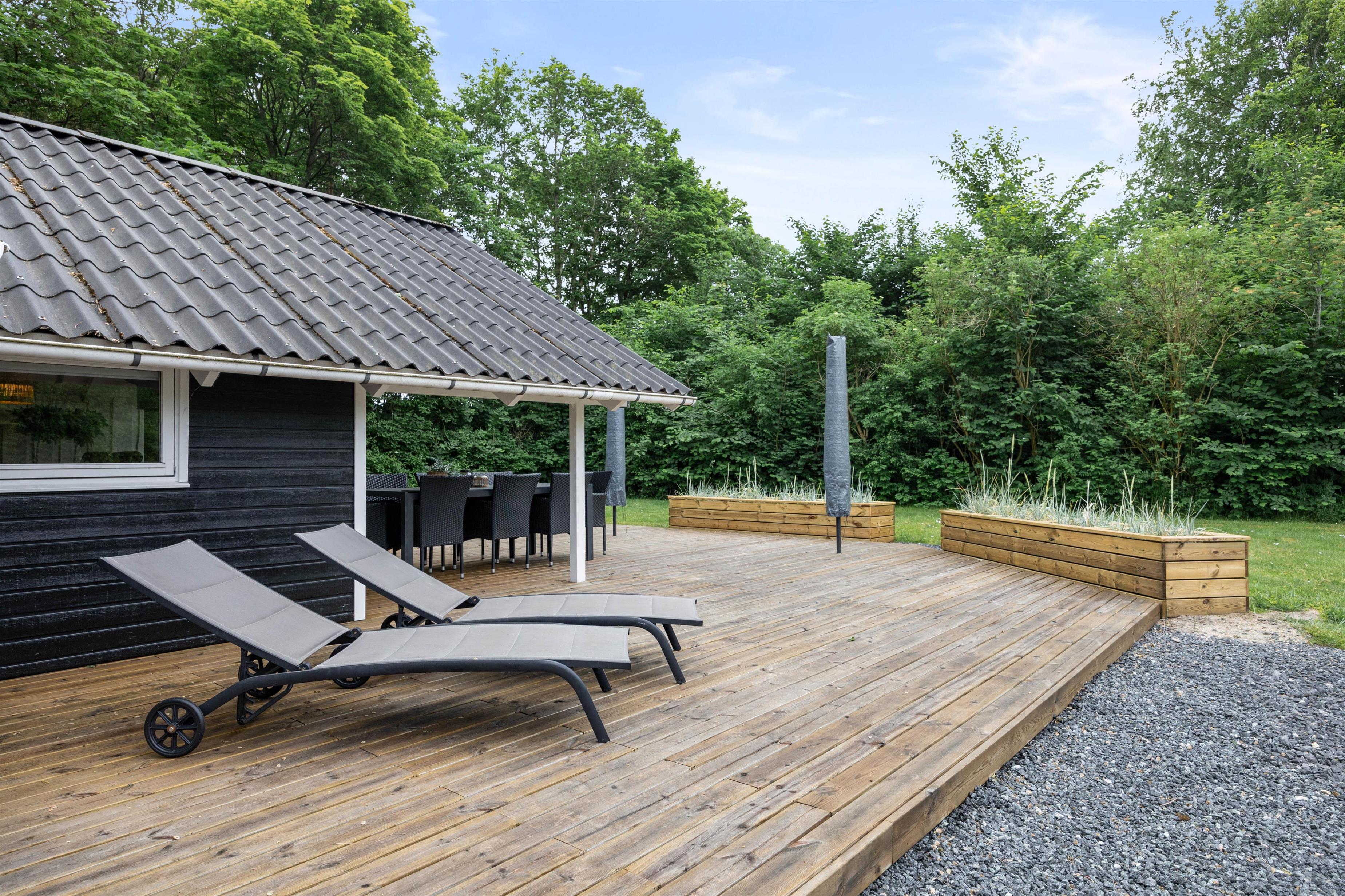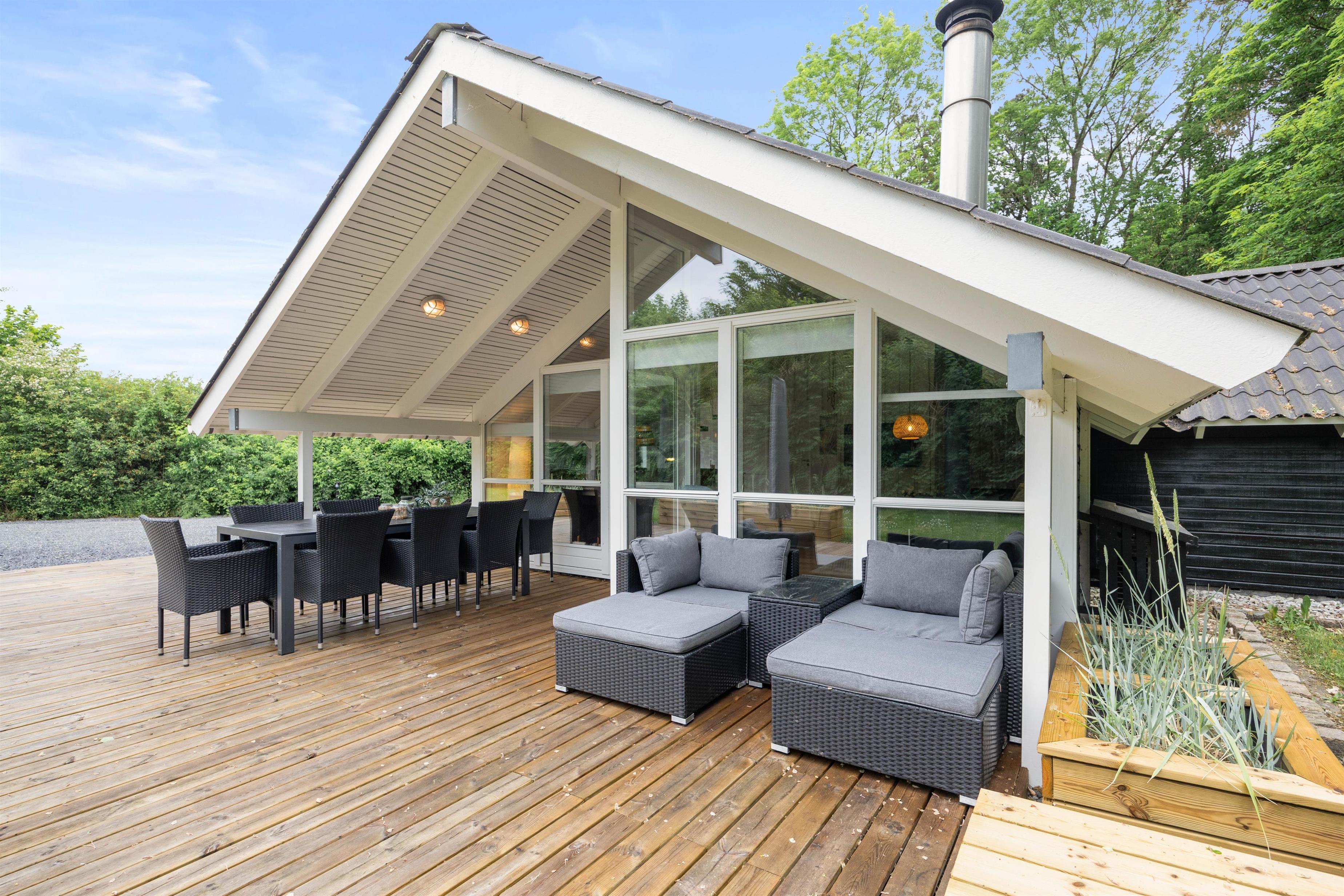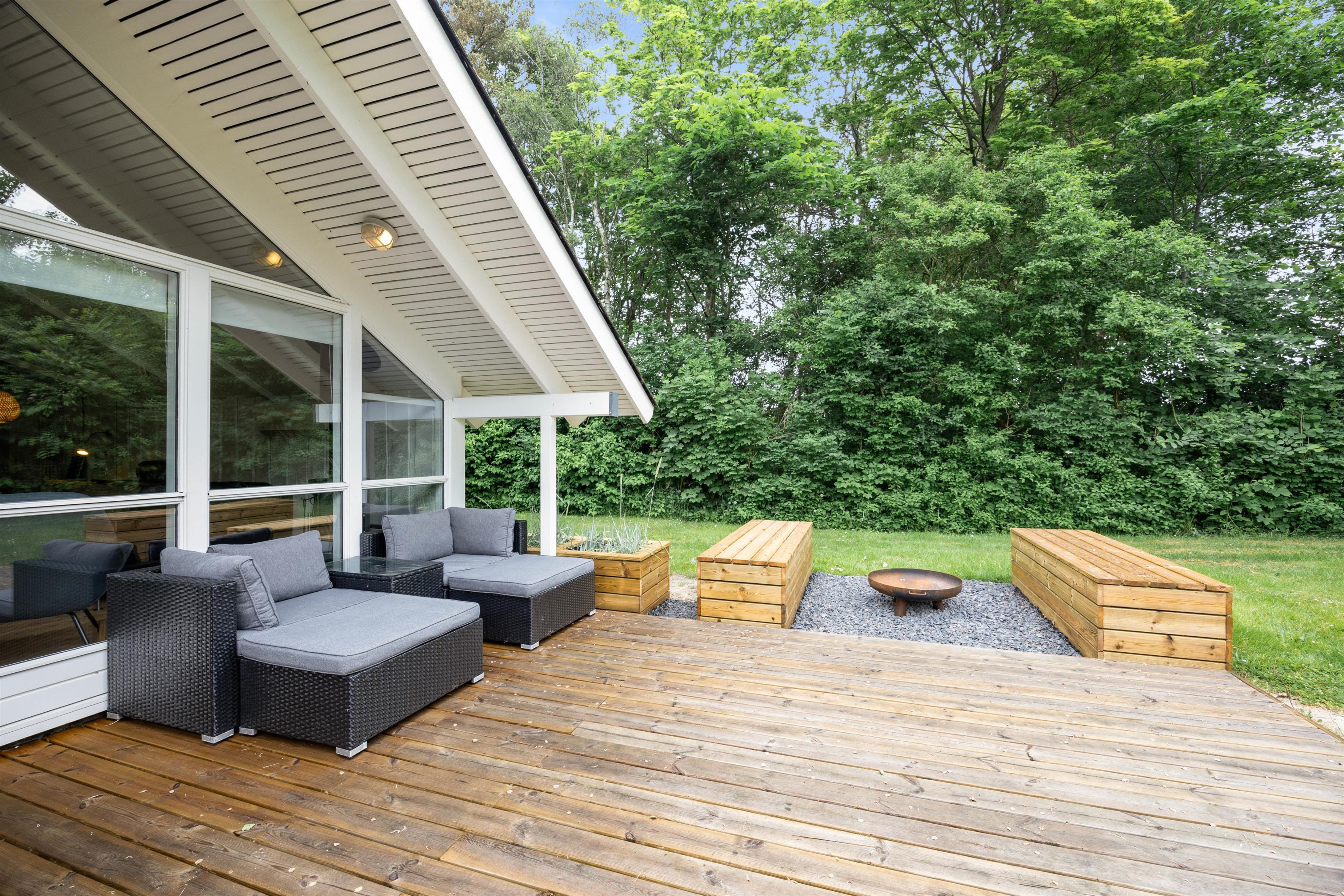 I haven er der alle muligheder for at nyde udelivet i fulde drag. Den store træterrasse byder på gode havemøbler og liggestole til de solrige dage - eller til stjernekiggeri en sen sommeraften. Parasol og overdækket terrasse giver mulighed for at nyde de varme sommerdage i behagelige temperaturer, mens sidstnævnte giver mulighed for at holde længere grillaftener både forår, sommer og efterår.