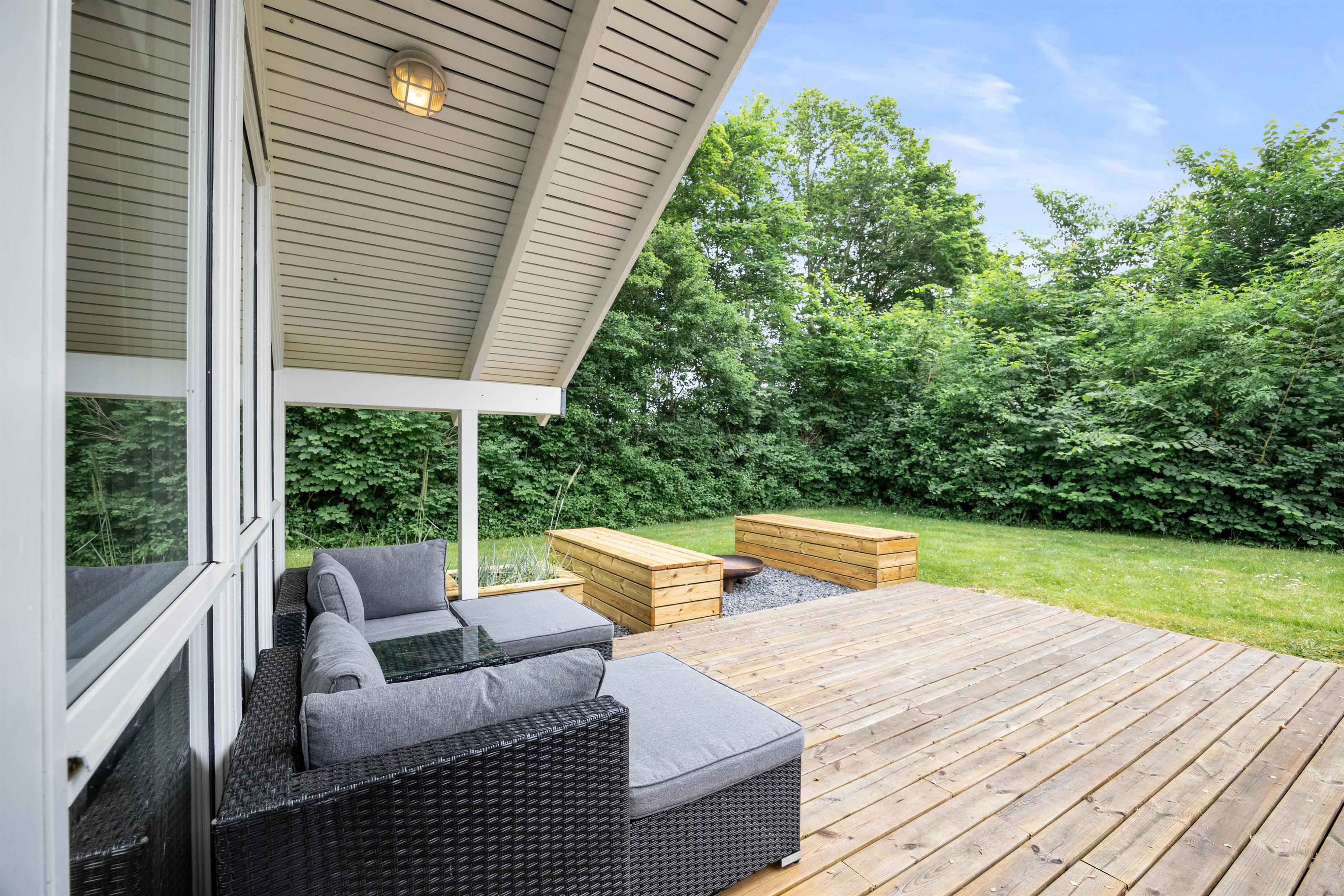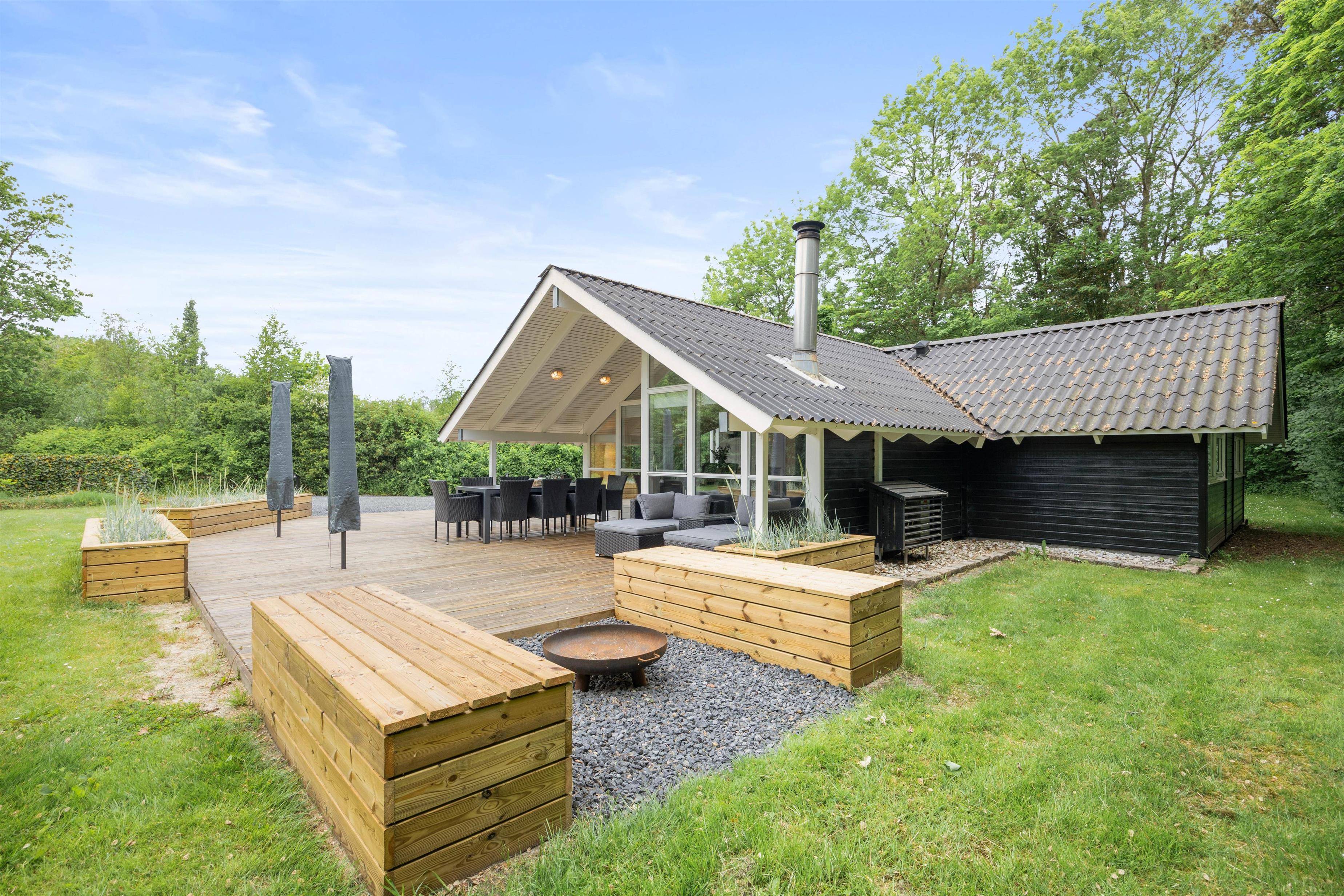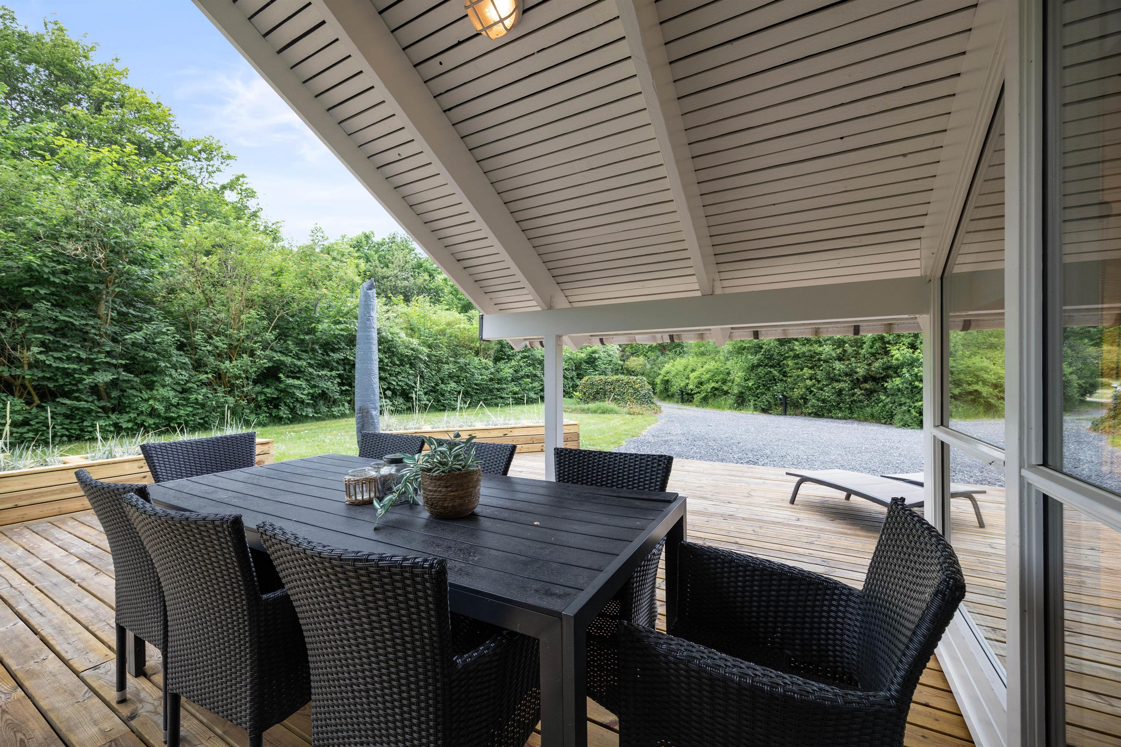 I haven er der alle muligheder for at nyde udelivet i fulde drag. Den store træterrasse byder på gode havemøbler og liggestole til de solrige dage - eller til stjernekiggeri en sen sommeraften. Parasol og overdækket terrasse giver mulighed for at nyde de varme sommerdage i behagelige temperaturer, mens sidstnævnte giver mulighed for at holde længere grillaftener både forår, sommer og efterår.