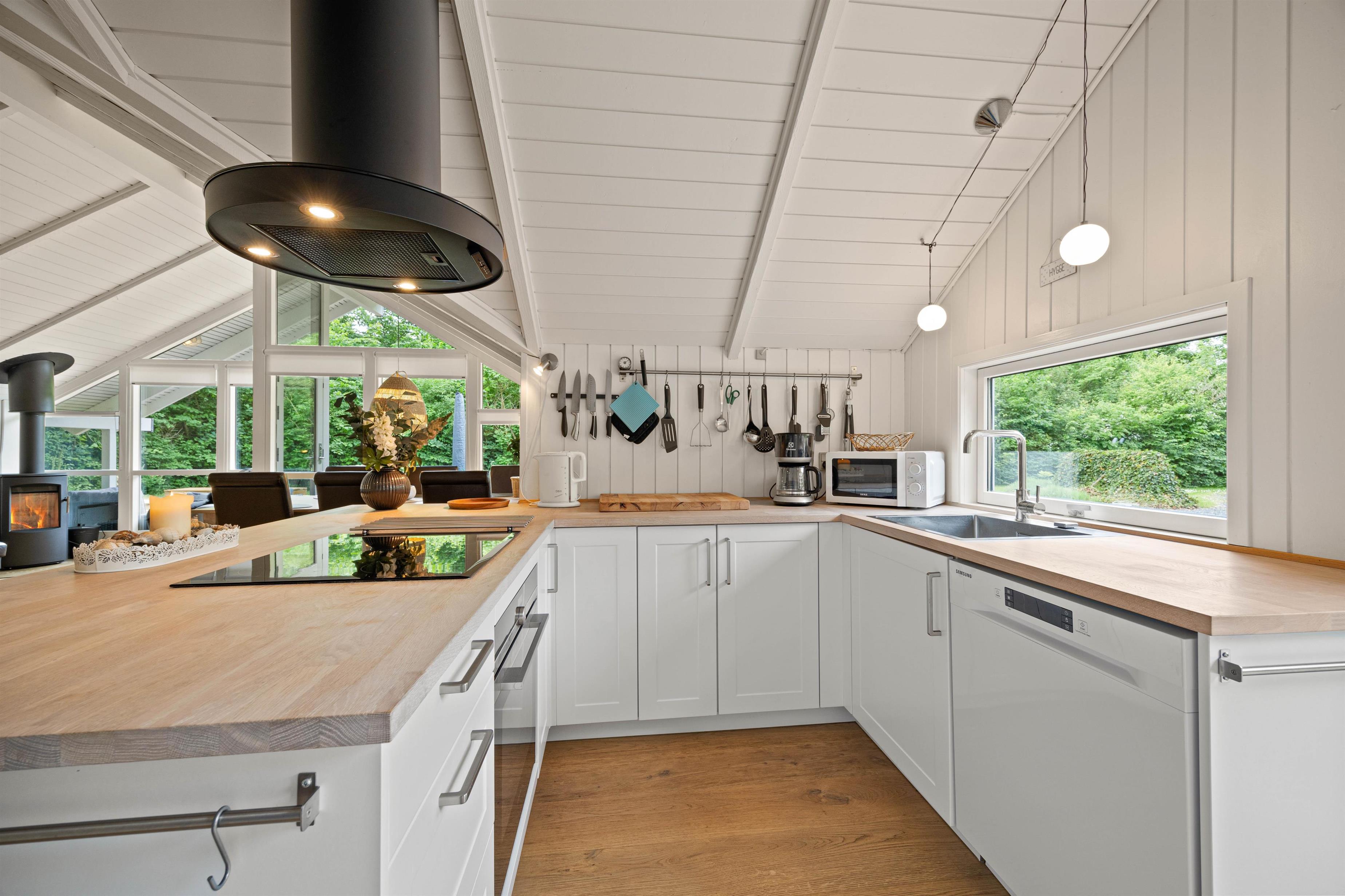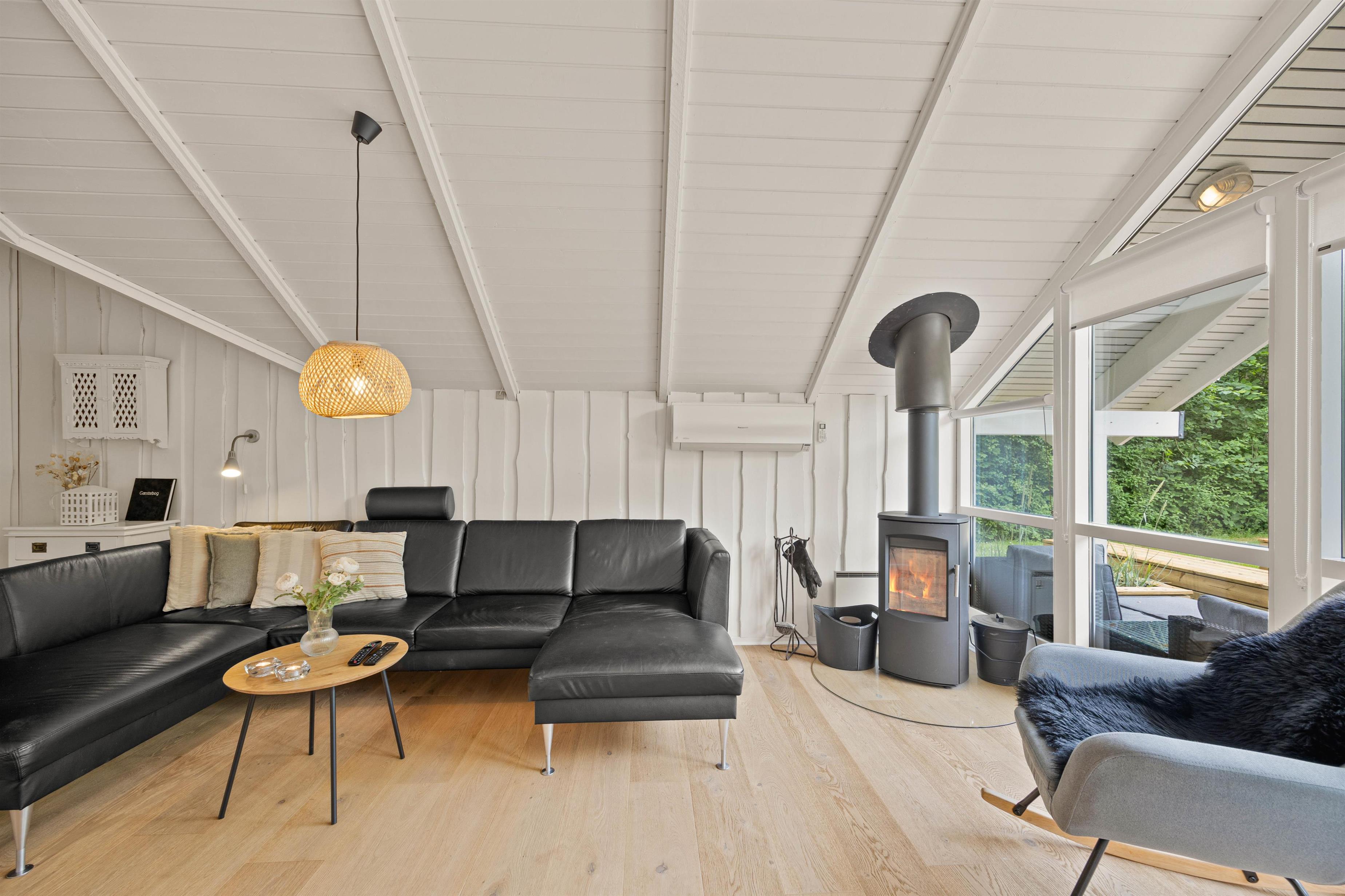 Når en aktiv feriedag går på hæld, kan I runde dagen af med brætspil eller slænge jer i sofaen og se en god film via Chromecast. Det store vinduesparti i stuen sørger for et lækkert lys samt en velgørende udsigt til de grønne omgivelser. Holder I ferie i den kolde sæson, kan I tænde op i brændeovnen, der spreder hygge og behagelig varme efter en rask gåtur i den friske vestjyske luft.