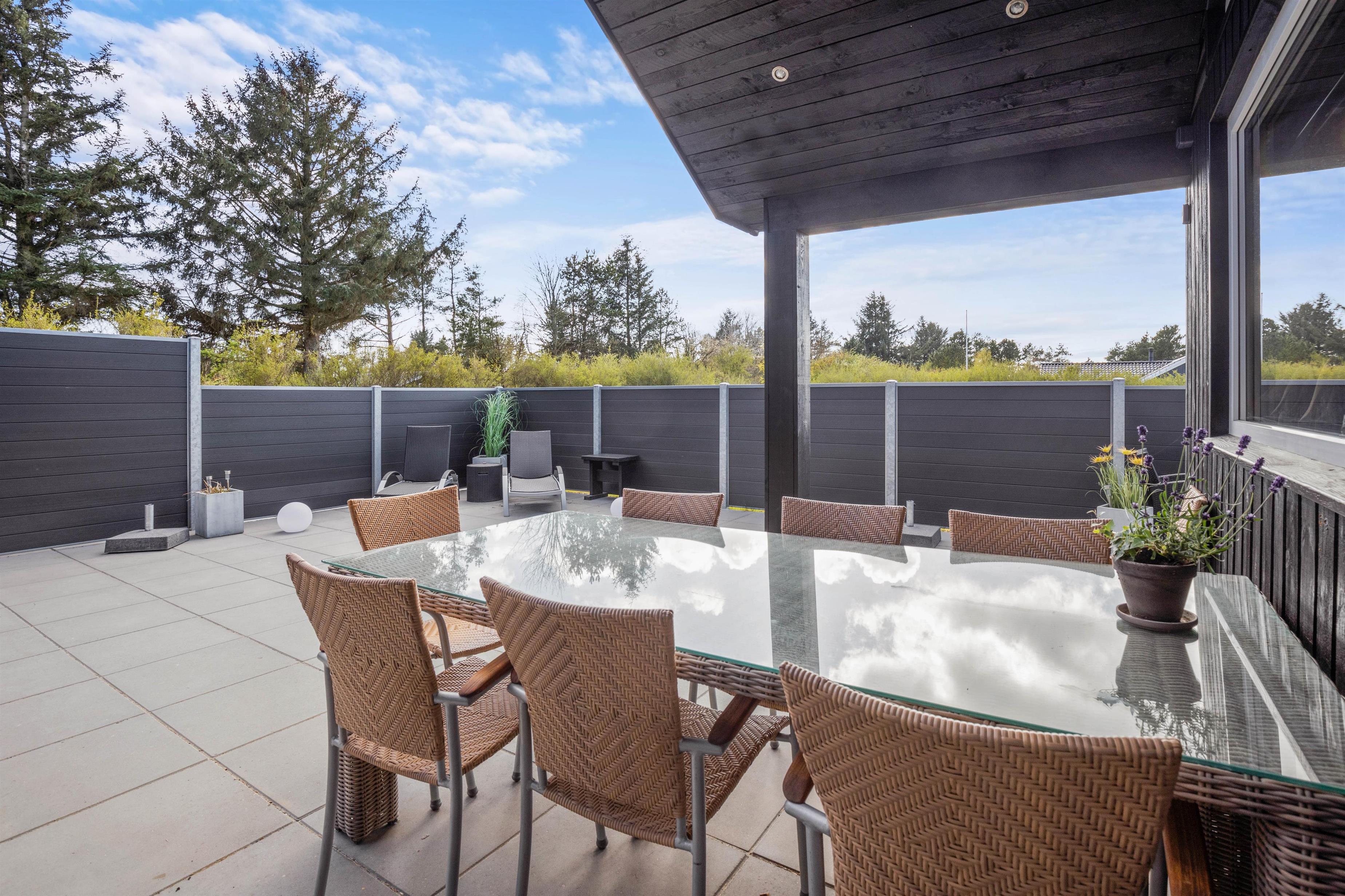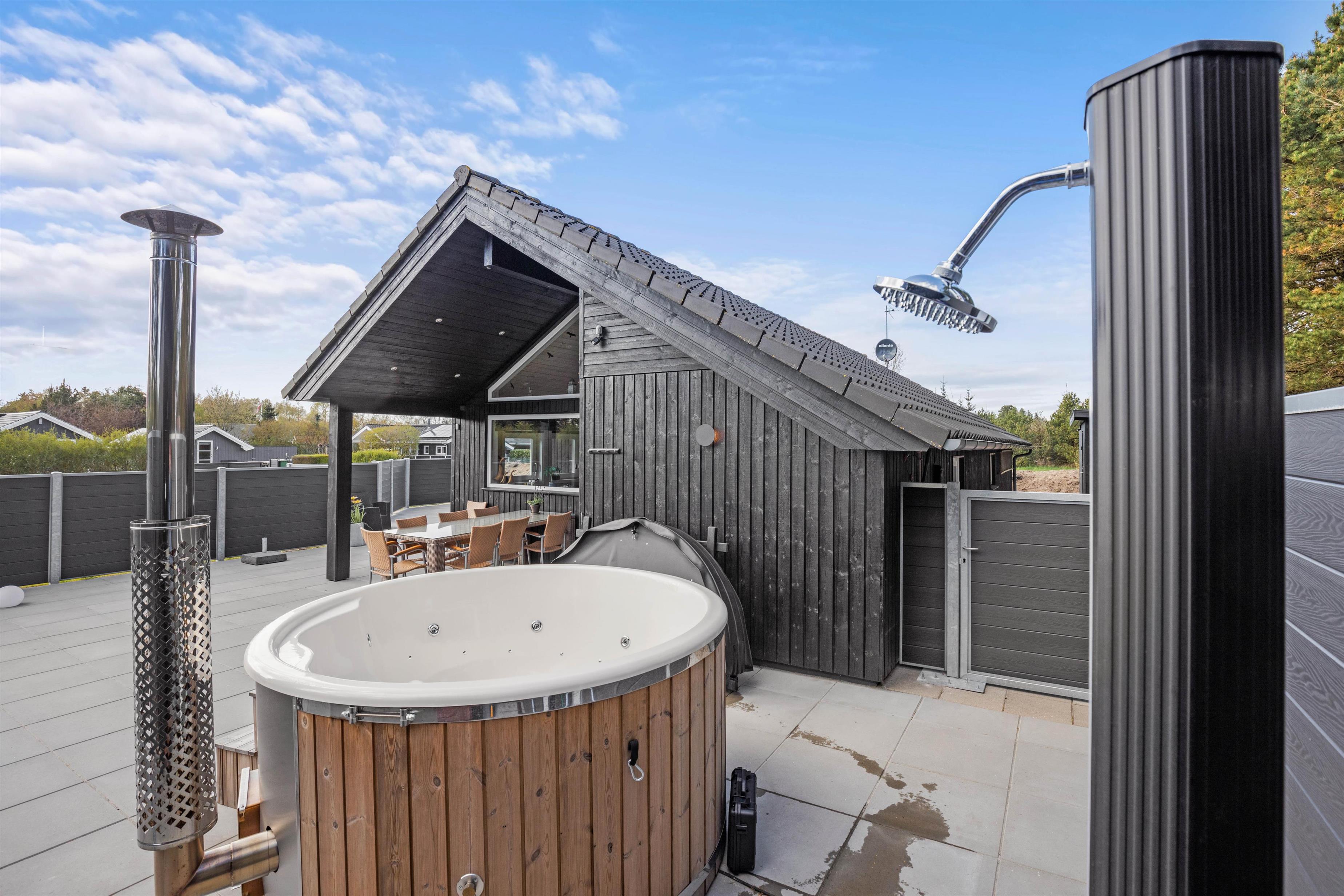 Har I været en tur ved Vesterhavet, kan I skylle jer under udebruseren, som er tilgængelig fra april til november, for at få det sidste sand af tæerne. På udeområdet har I også en terrasse, der er delvist overdækket og afskærmet, hvor I kan finde jer godt til rette i havemøbler og liggestole. Her har I desuden en gasgrill til rådighed, som I kan tilberede en lækker middag på som afslutning på feriedagen.