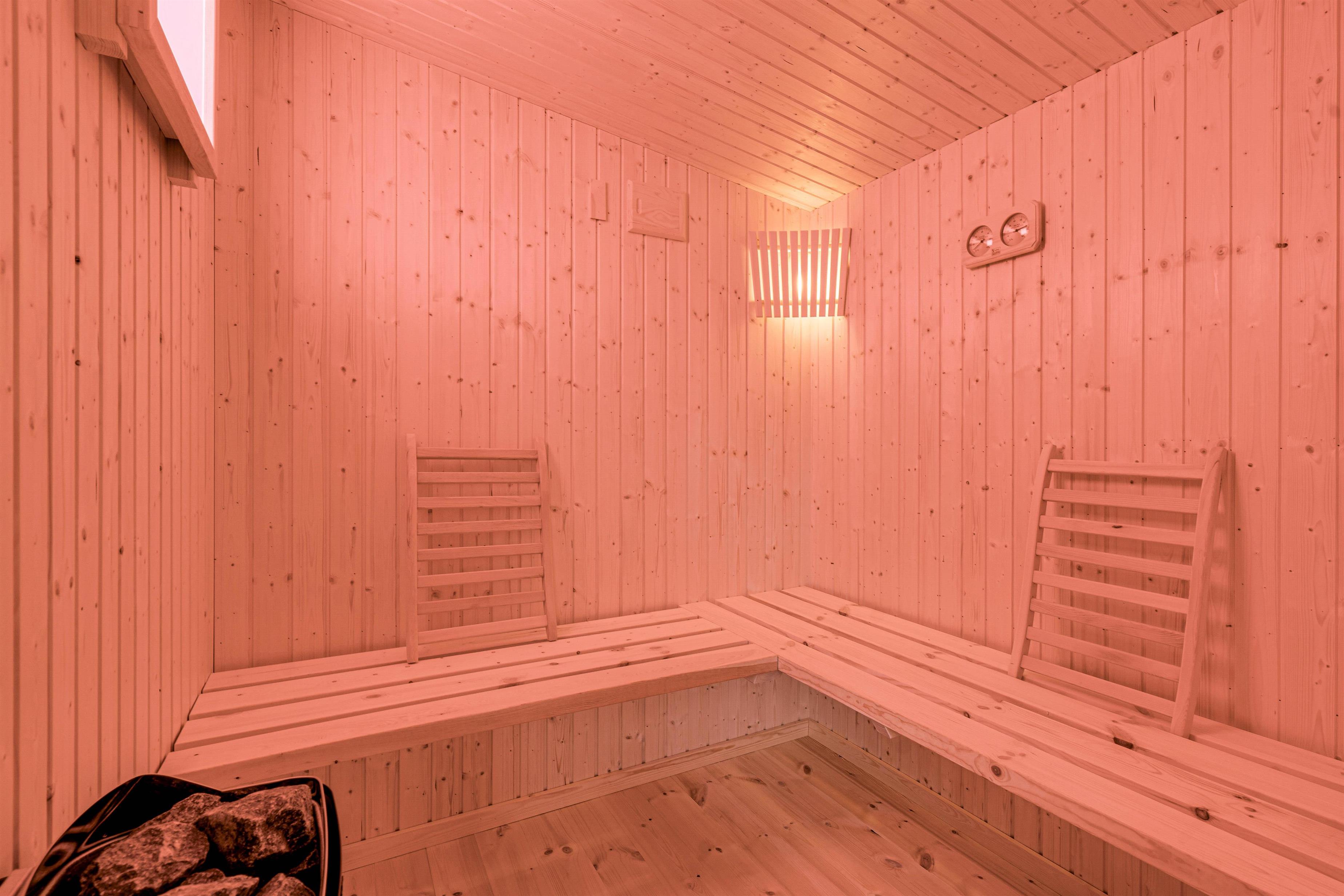 Derudover er der en saunahytte på sommerhusets udeområde, som også inviterer til masser af afslapning i løbet af jeres ferie. Her kan I slappe helt af i den dejlige varme fra både almindelig sauna med lysterapi og en særskilt infrarød kabine, hvilket også er skønt efter en frisk gåtur eller en dukkert i Vesterhavet.