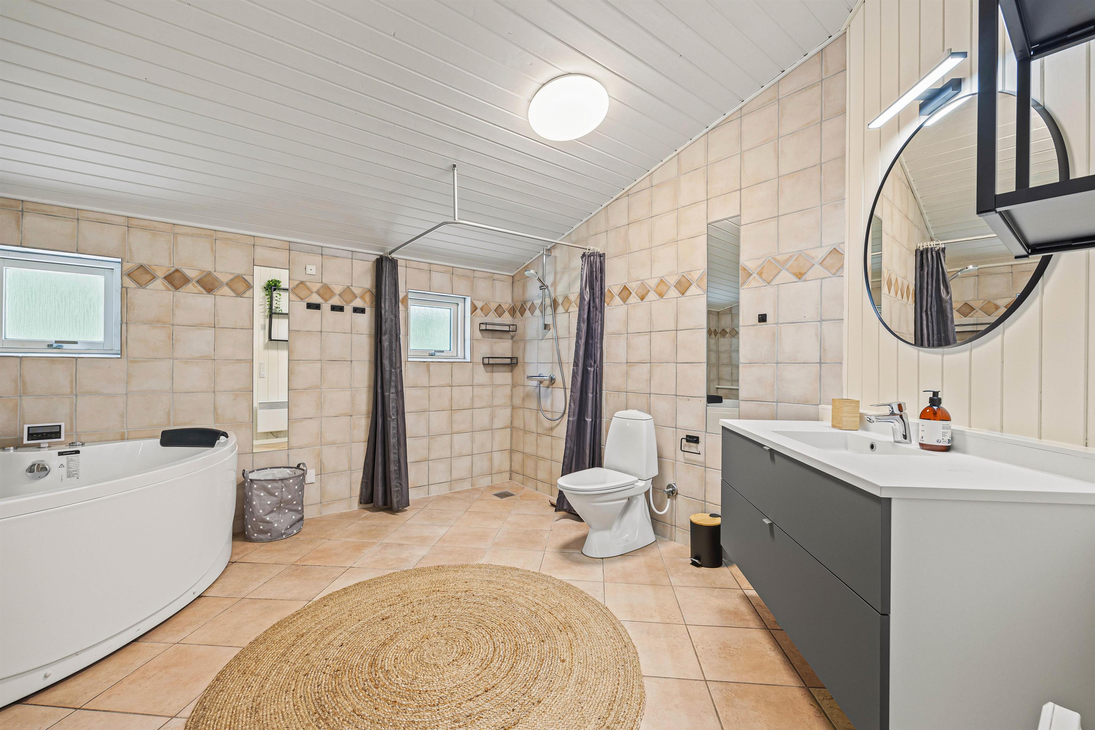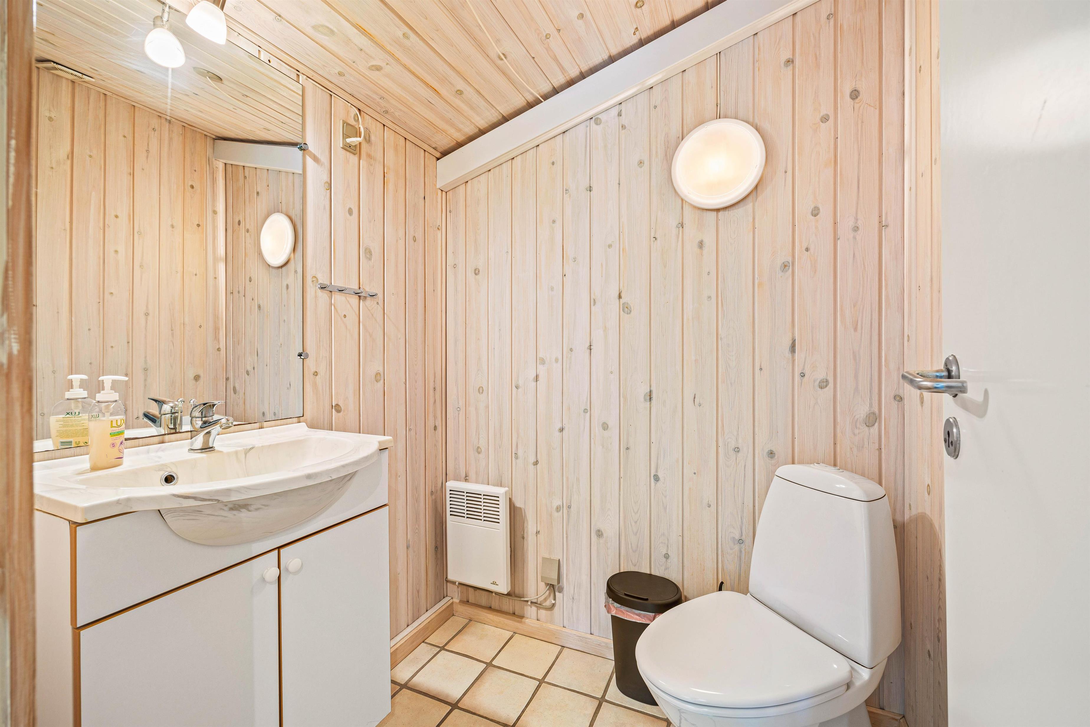 I huset er der et badeværelse udstyret med både sauna og tømmespa, som giver jer mulighed for at slappe af og forkæle jer selv efter en dag med eventyr i området. Der er også et ekstra toilet med vaskemaskine til rådighed, så I kan holde garderoben frisk og ren, uanset hvad jeres eventyr langs vestkysten bringer.