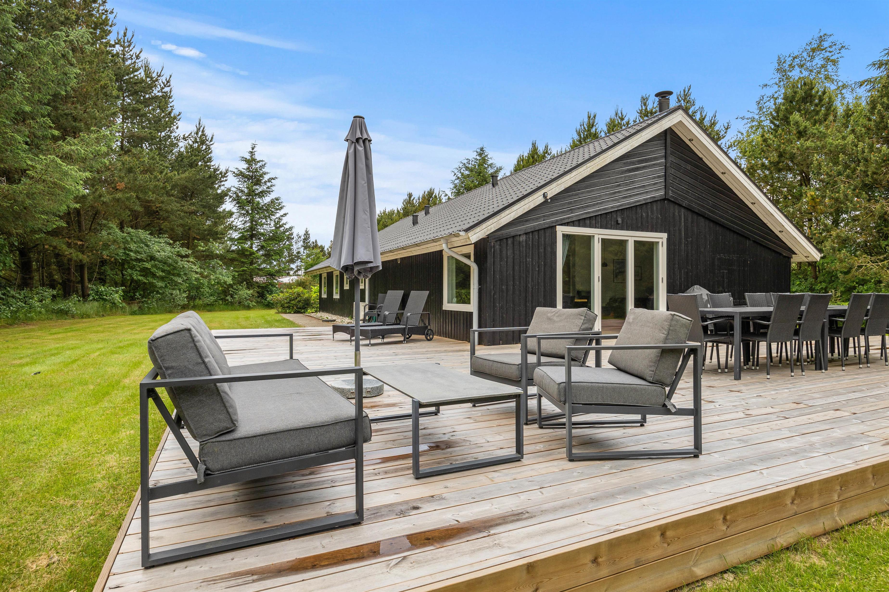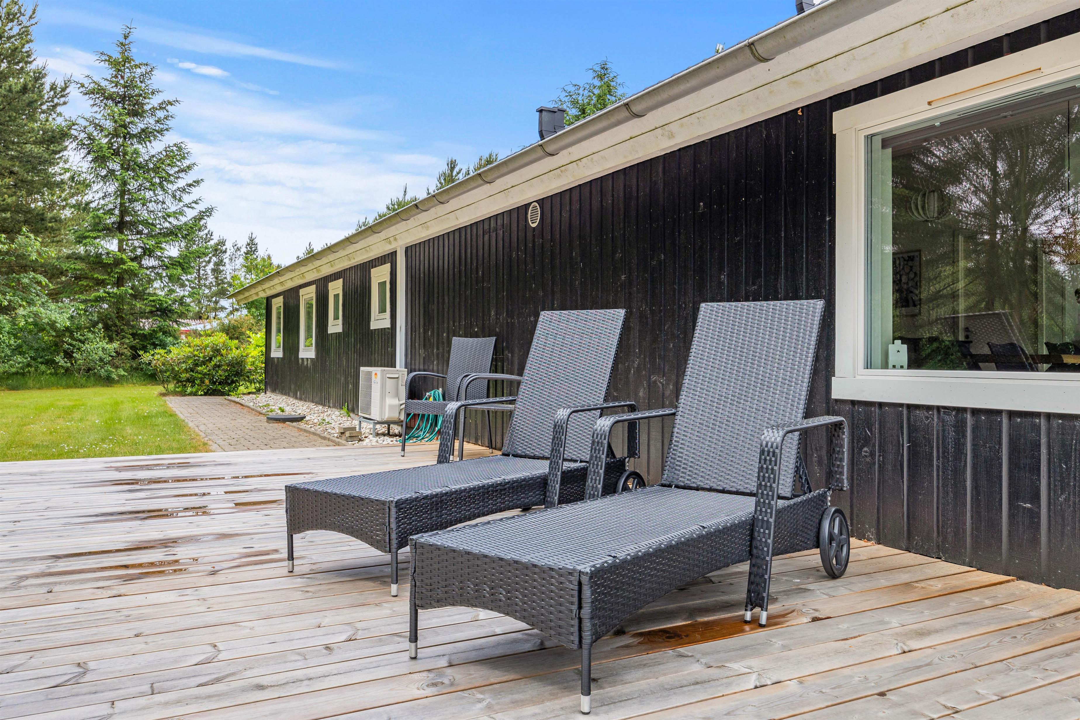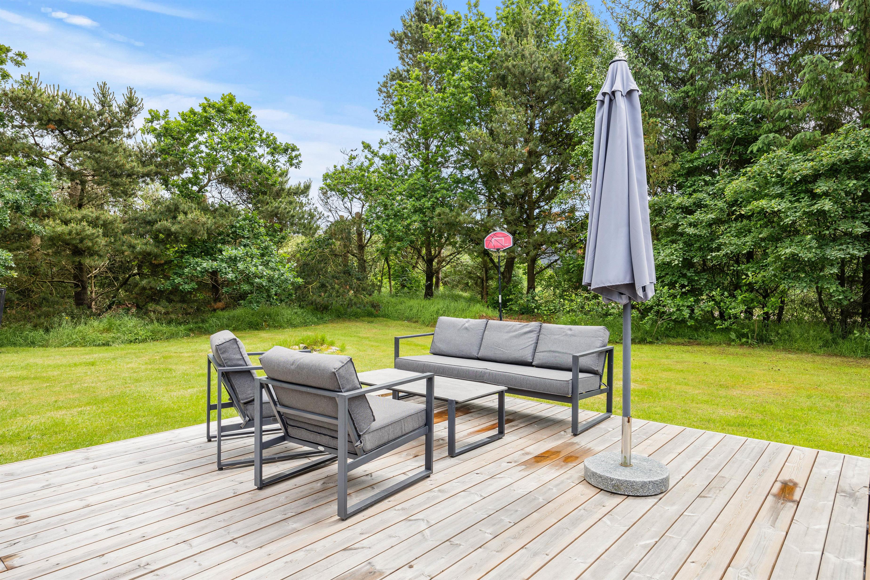På terrassen, der åbner sig ud mod det skønne udendørsområde, finder I alt, hvad I skal bruge til en dejlig ferie. Her står en grill og havemøbler klar til hyggelige måltider under åben himmel. Der er også solvogne og en parasol til rådighed, så I kan nyde solskinnet i fulde drag.