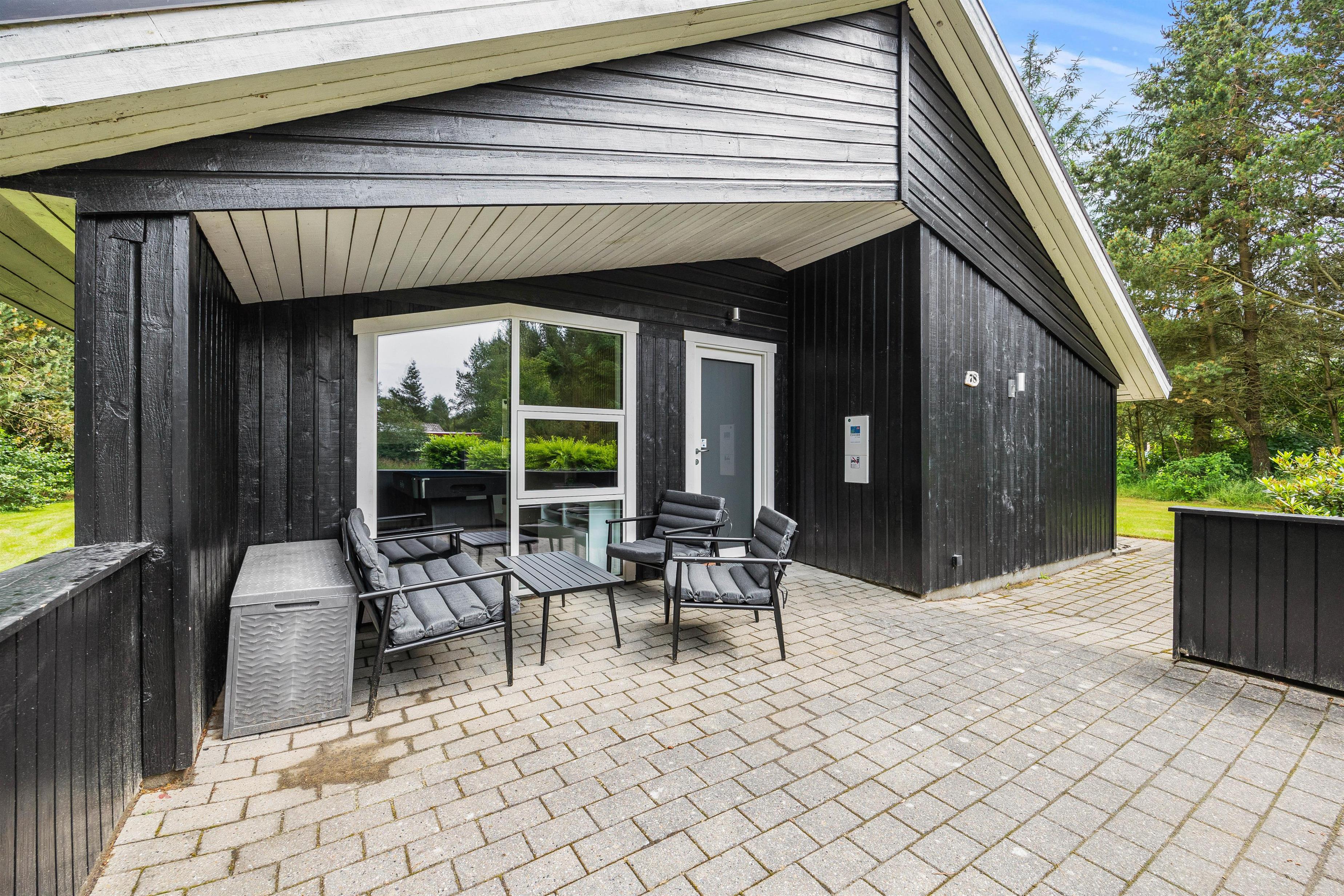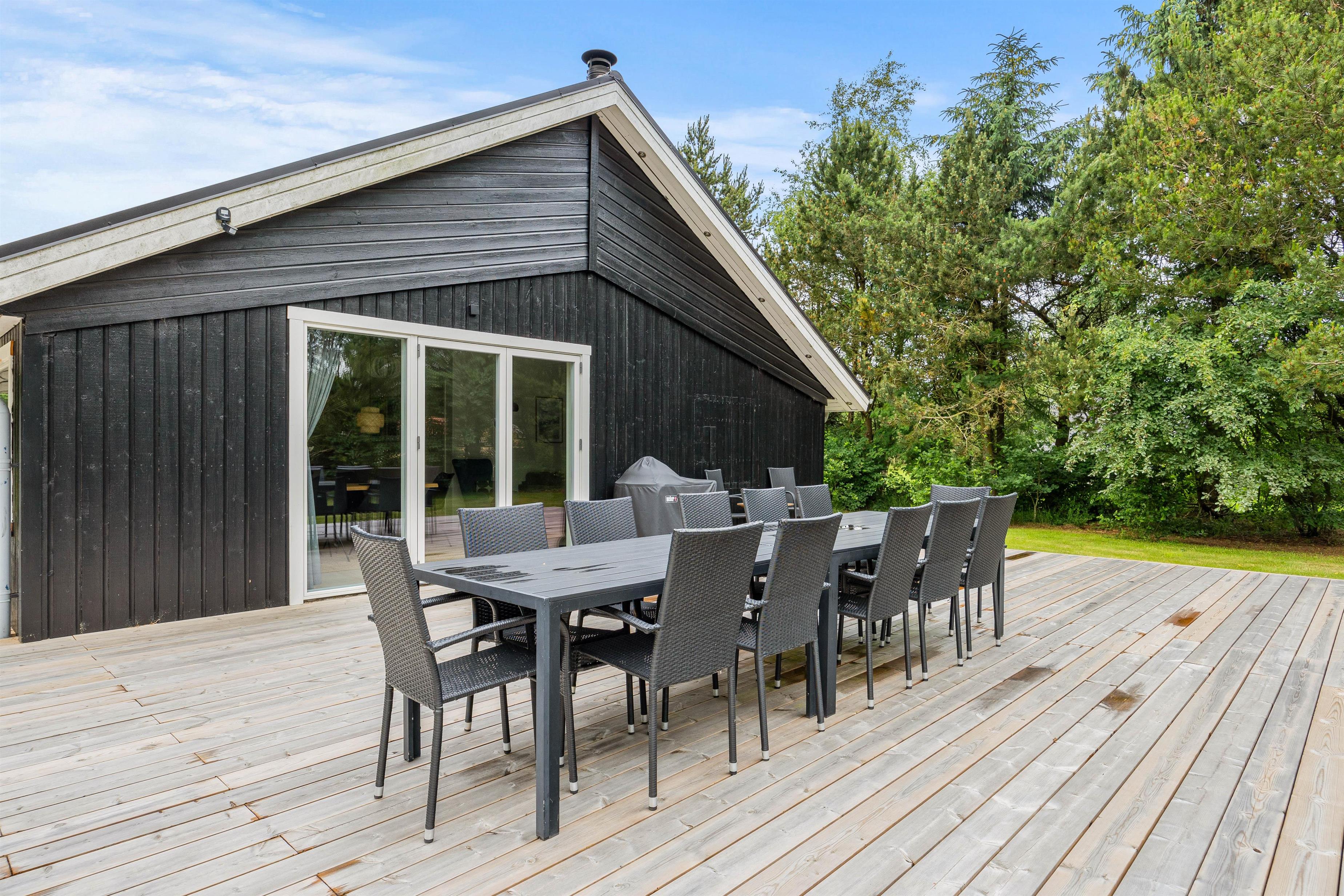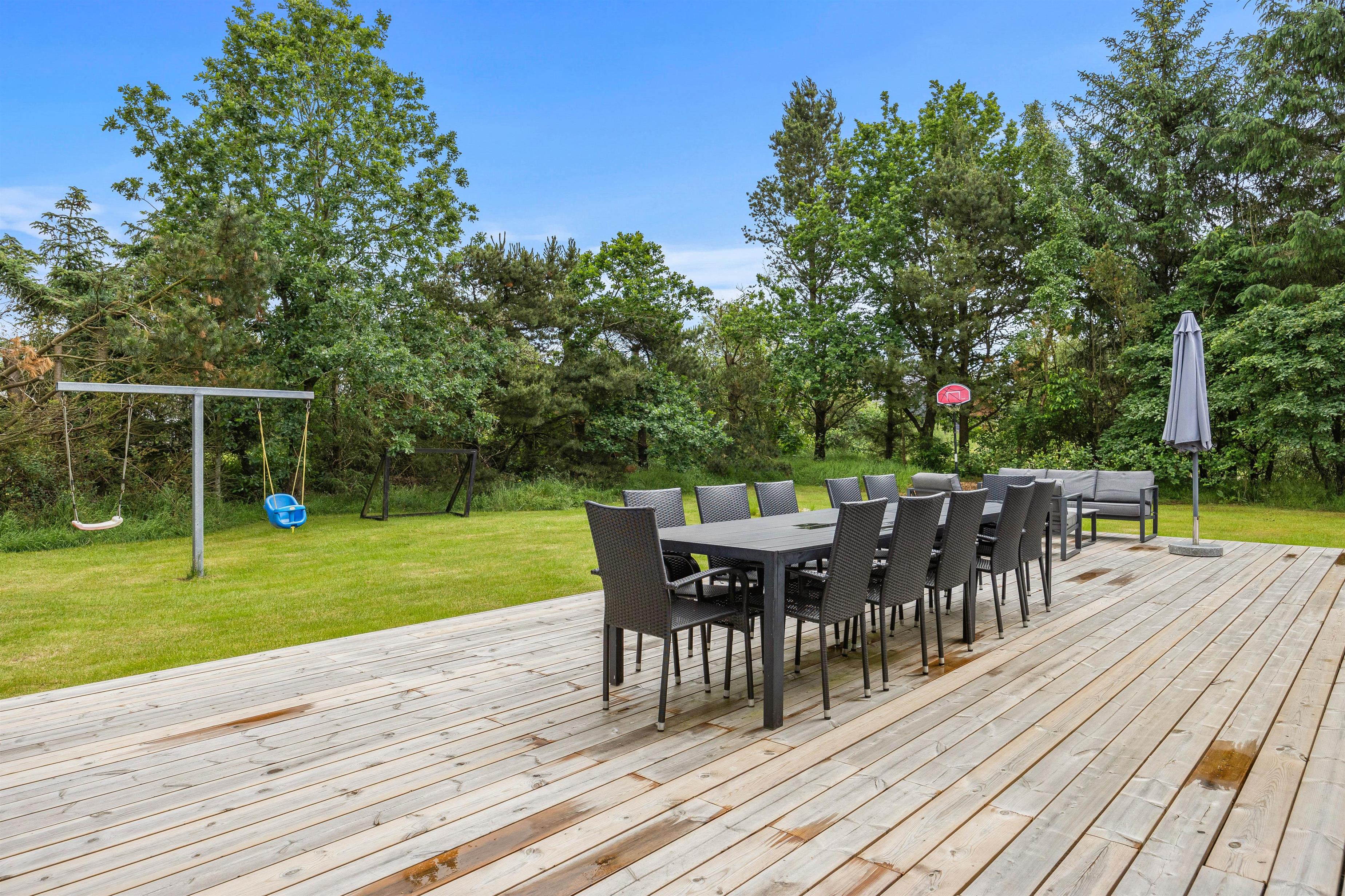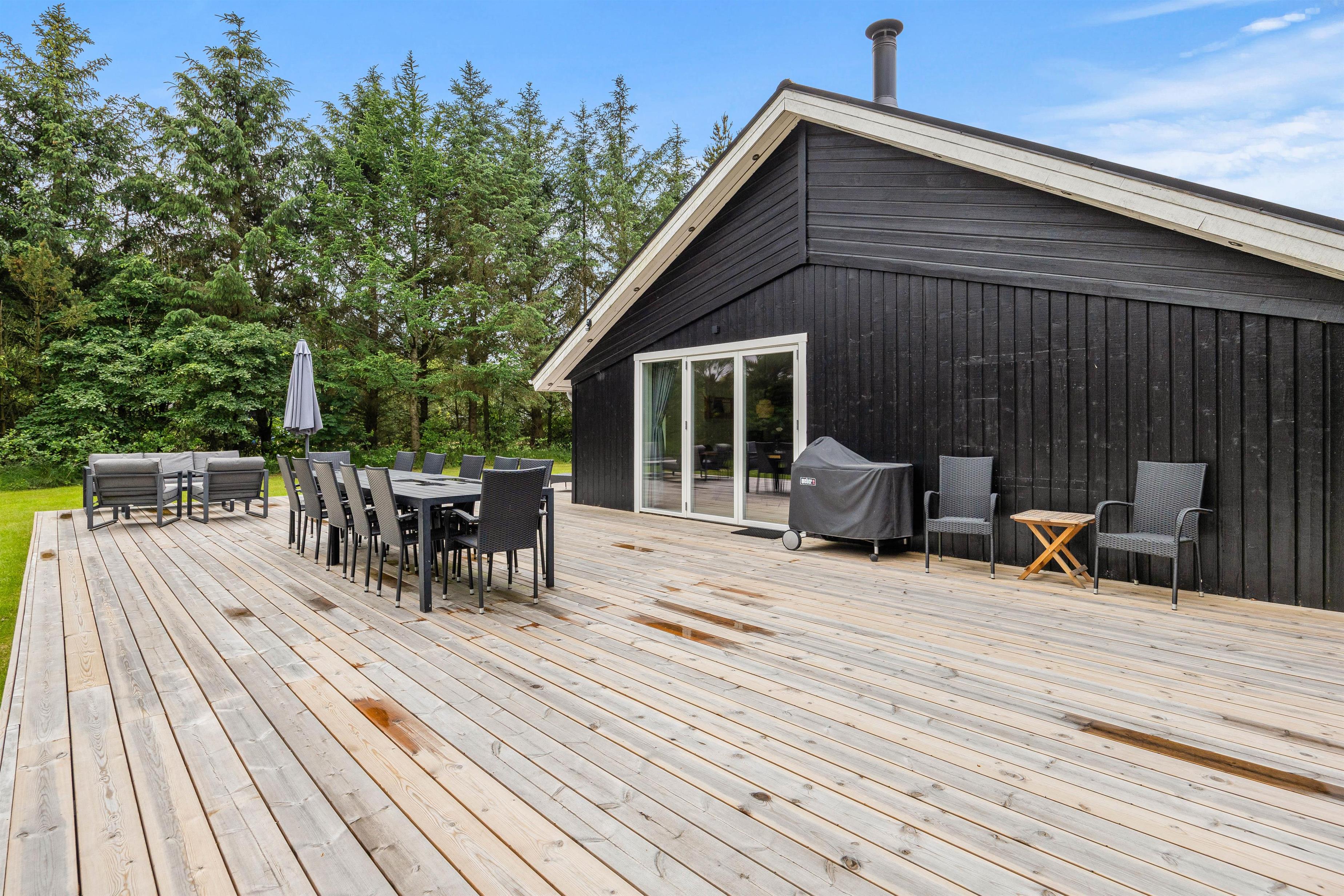 På terrassen, der åbner sig ud mod det skønne udendørsområde, finder I alt, hvad I skal bruge til en dejlig ferie. Her står en grill og havemøbler klar til hyggelige måltider under åben himmel. Der er også solvogne og en parasol til rådighed, så I kan nyde solskinnet i fulde drag.