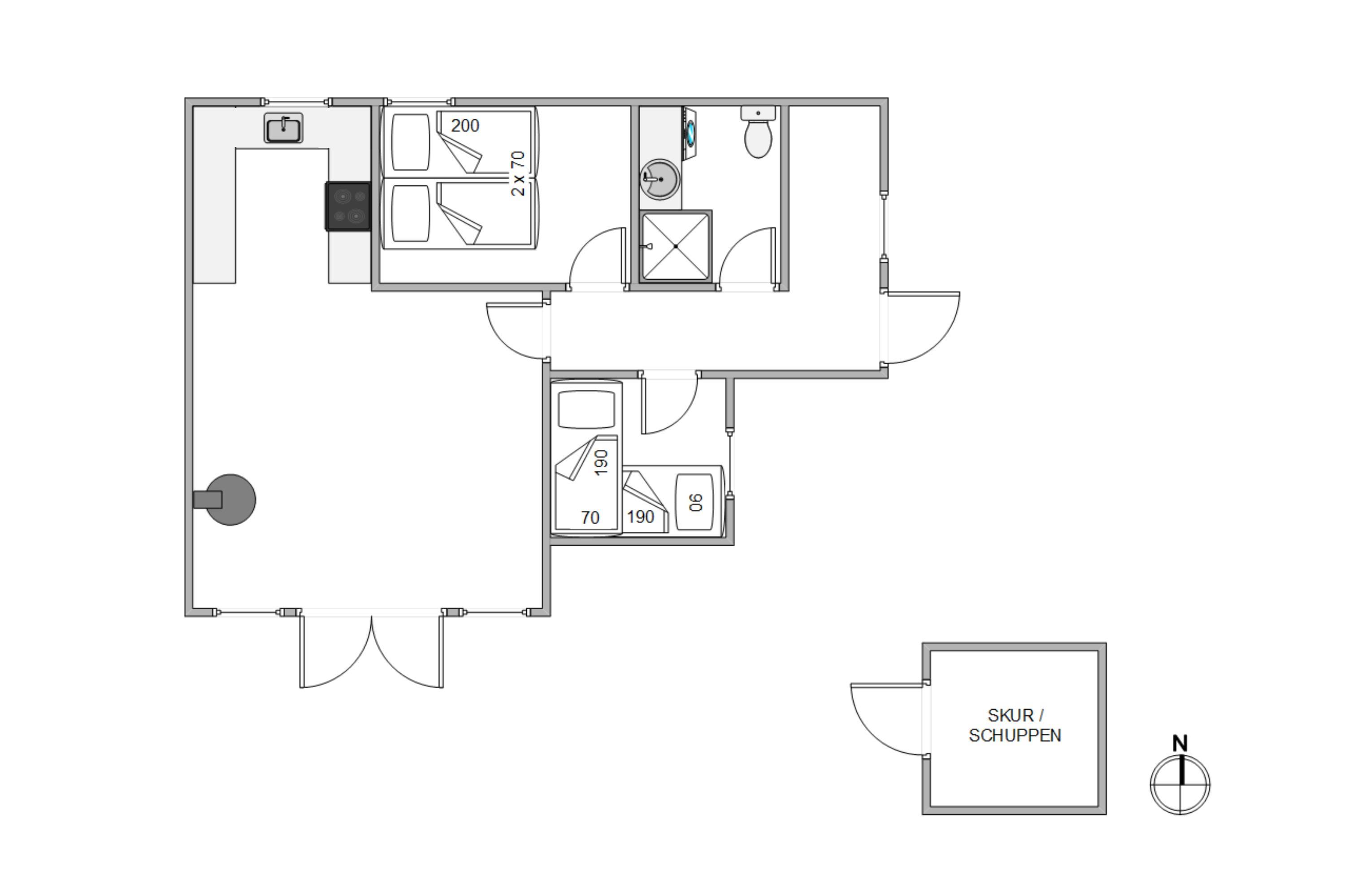 Indendørs er feriehuset indrettet med 2 soveværelser, hvoraf det ene er indrettet med en behagelig dobbeltseng og det andet soveværelse med en køjeseng, som helt sikker vil glæde børnene. Derudover er der også et fint og lyst badeværelse med vaskemaskine, så I altid har rent tøj til rådighed.