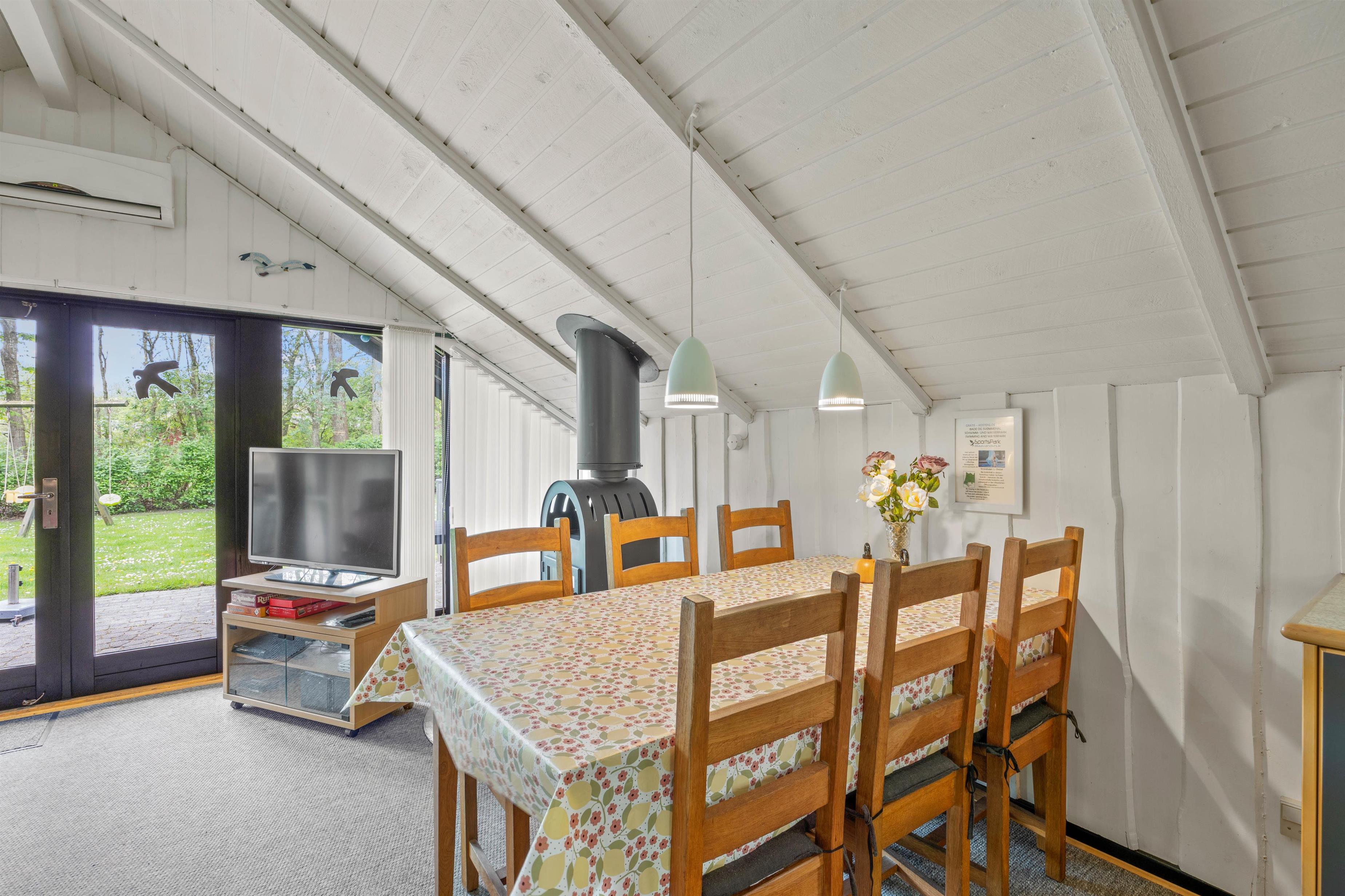Køkkenet er forbundet med stuen, hvor I også finder spisebordet, hvor I kan spille spil og planlægge næste dags aktiviteter. I køkkenet er der også plads til, at børnene kan være med til at lave mad. Om aftenen kan I samle jer i de behagelige møbler og tænde op i brændeovnen, så I kan nyde varmen herfra. I kan også opvarme sommerhuset med den energibesparende luft-til-luft varmepumpe.