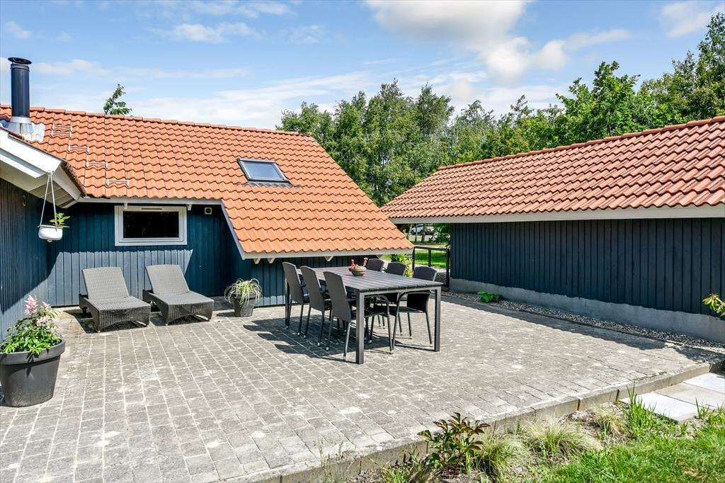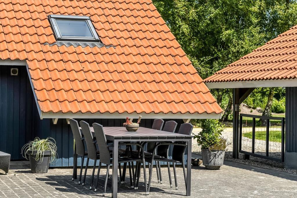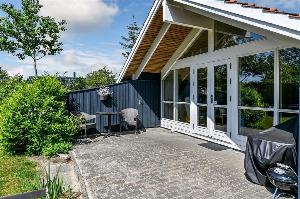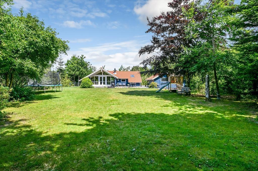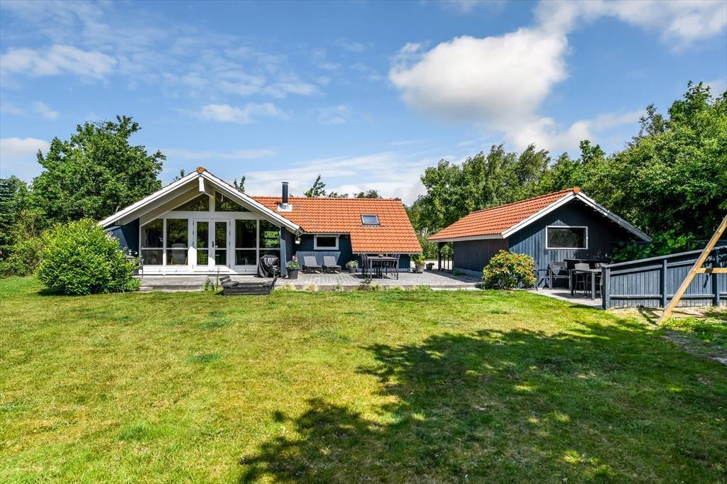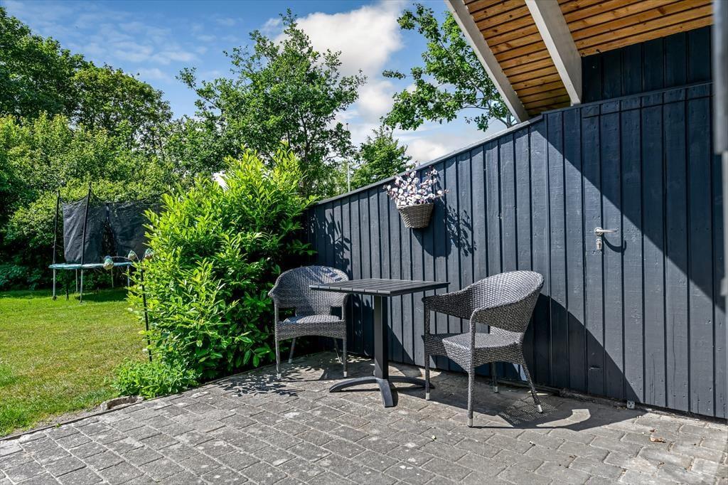 Udenfor åbner en fantastisk grund sig – omkranset af høje træer, som skaber en naturlig læ og en dejlig fornemmelse af fred og privatliv. Her er rigelig plads til boldspil, solbadning eller en stille stund med en god bog. Børnene vil elske det fine legetårn med gynger og rutsjebane, hvor feriens bedste lege hurtigt tager form. Terrassen snor sig omkring huset og har både åbne og overdækkede zoner, så du kan finde sol, skygge eller læ – alt efter vejr og humør. Start dagen med morgenkaffe i det fri, slap af i liggestolene midt på dagen, og saml hele familien til grillhygge, når mørket falder på. Uanset vejr og vind er der altid et godt spot på terrassen.