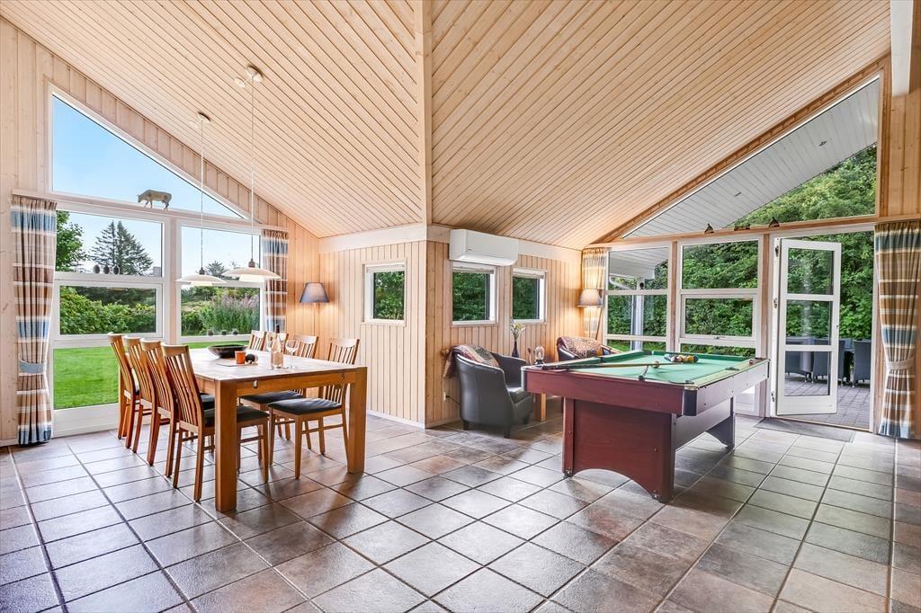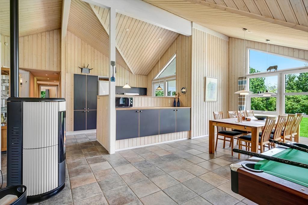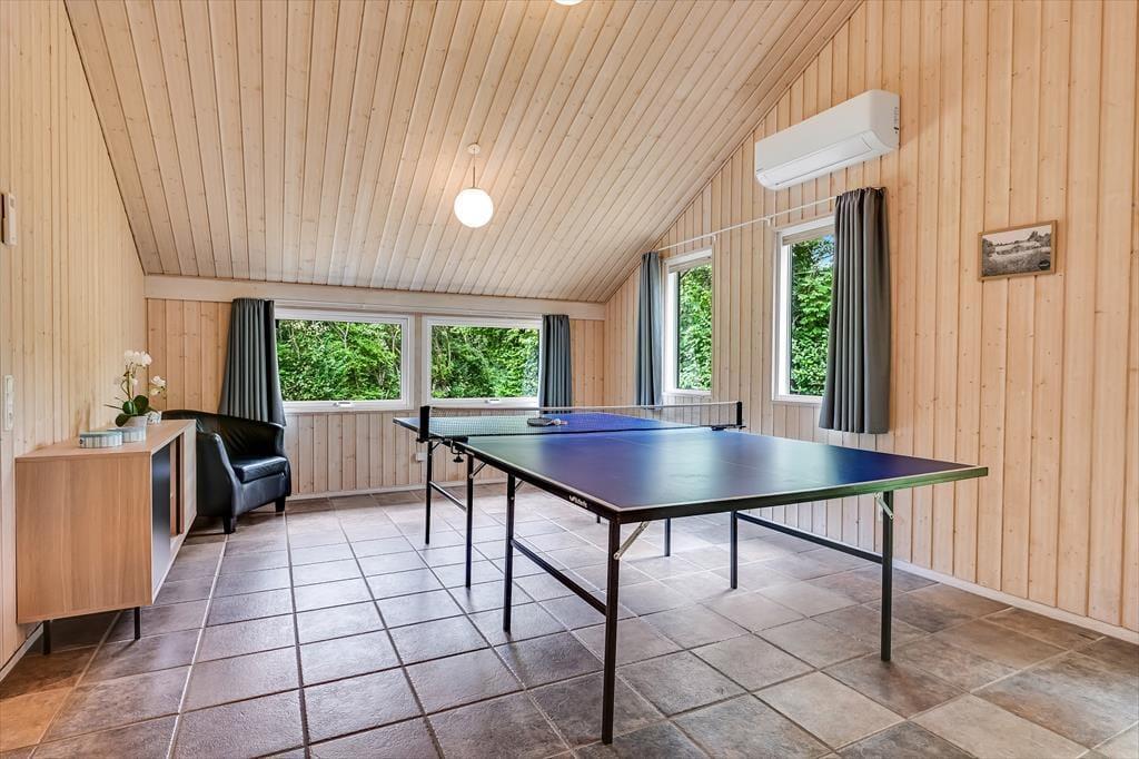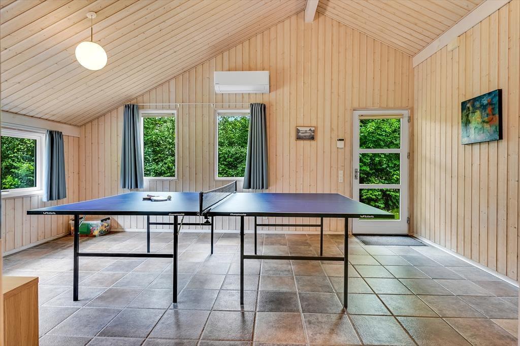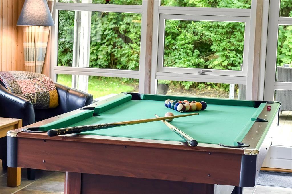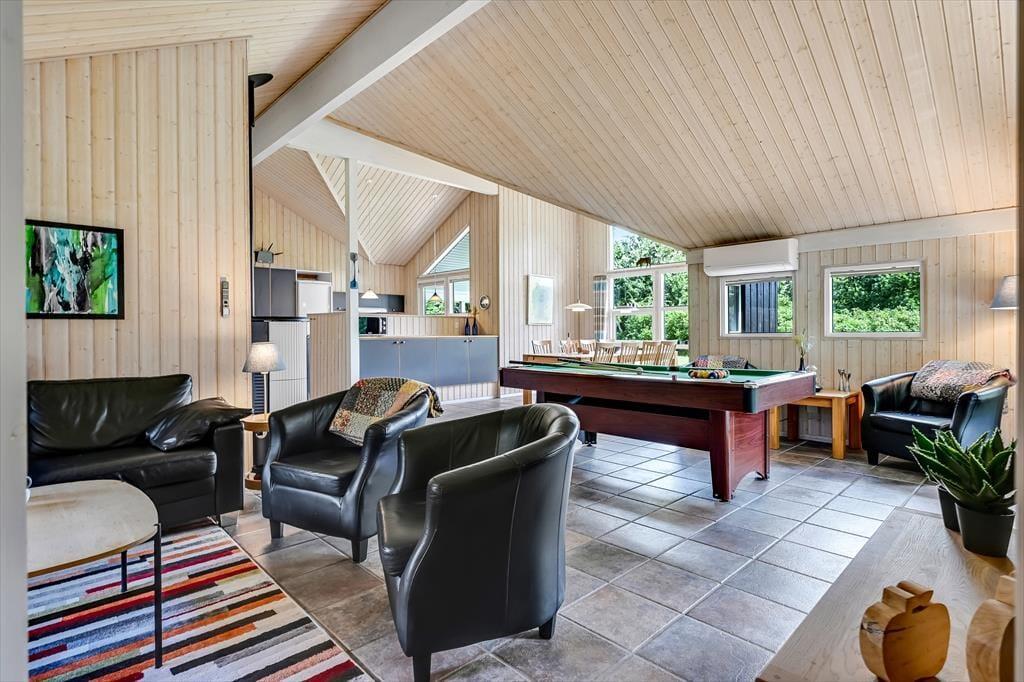 Indenfor mødes du af en varm og indbydende atmosfære, hvor både komfort og hygge er tænkt ind i indretningen. I det store opholdsrum er der højt til loftet og plads til at være sammen – uanset om du vil lave mad, spille spil eller bare slappe af. I stuen står et poolbord klar til venskabelige dyster, og i det tilstødende aktivitetsrum kan I tage et spil bordtennis, hvis konkurrencen skal tages til næste niveau. Når det er tid til afslapning, inviterer spaen og saunaen indenfor til ren selvforkælelse. Forestil dig at synke ned i det varme vand, mens roen sænker sig omkring dig – eller mærke varmen fra saunaen løsne kroppens sidste spændinger. To varmepumper og en pillebrændeovn sørger for, at du altid har en behagelig temperatur, og med to badeværelser er der gode faciliteter, selv når hele familien er samlet. Her er det nemt at finde ro – og samtidig være aktiv.