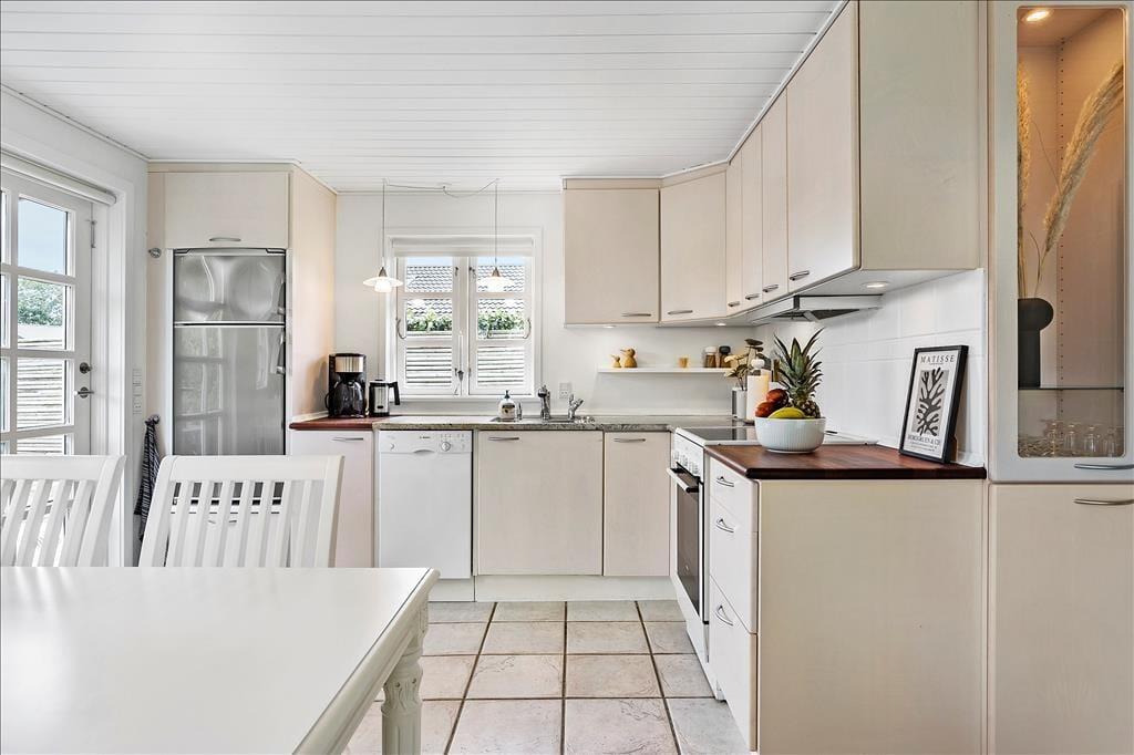 Det åbne køkken er fuldt udstyret og klar til at imødekomme dine kulinariske eventyr. Det åbne design skaber en naturlig forbindelse mellem madlavning og samvær, så du nemt kan være en del af samtalen med familie eller venner, mens du tilbereder lækker mad.