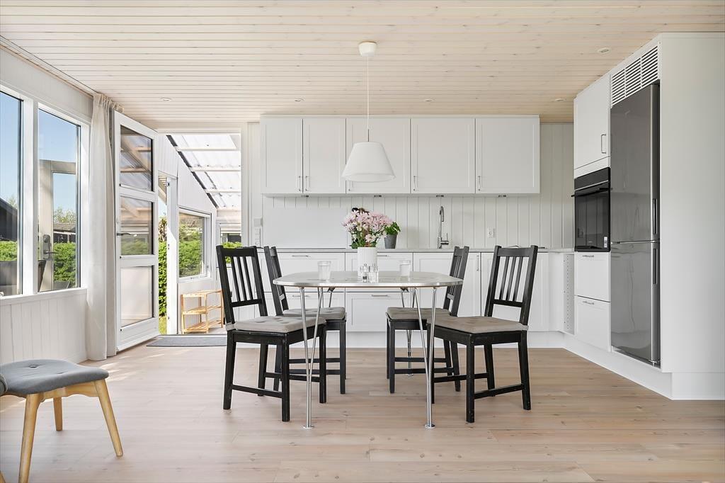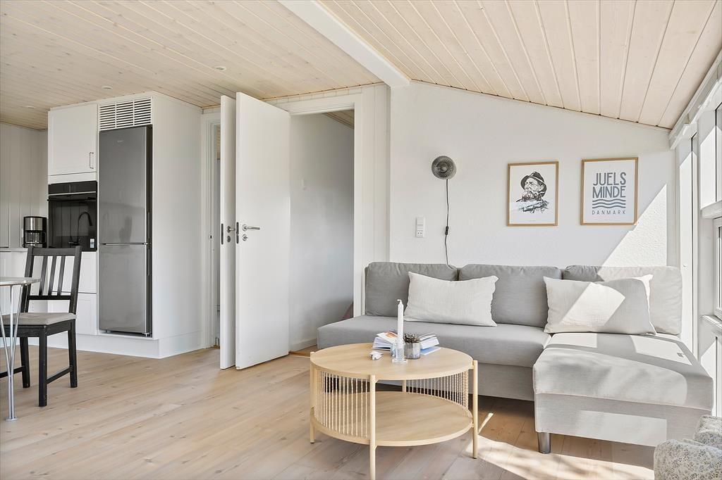 Sommerhuset fremstår lyst og venligt med en afslappet atmosfære, hvor du straks føler dig hjemme. Det åbne køkken indbyder til hyggelige stunder med fælles madlavning og gode samtaler – og med et vinkøleskab ved hånden kan du altid nyde et køligt glas vin i godt selskab. Rundt om spisebordet er der plads til nærvær – måske et spil, en god bog eller blot tid til at være sammen. Den hyggelige udestue forlænger opholdsrummet og giver jer endnu flere muligheder for afslapning, uanset vejret udenfor.