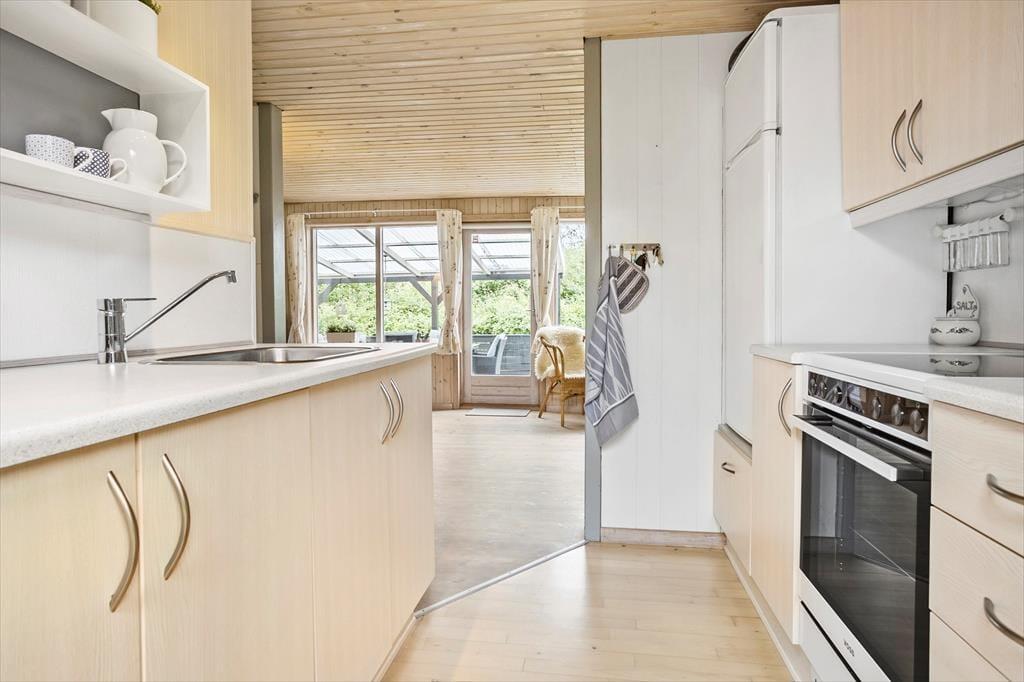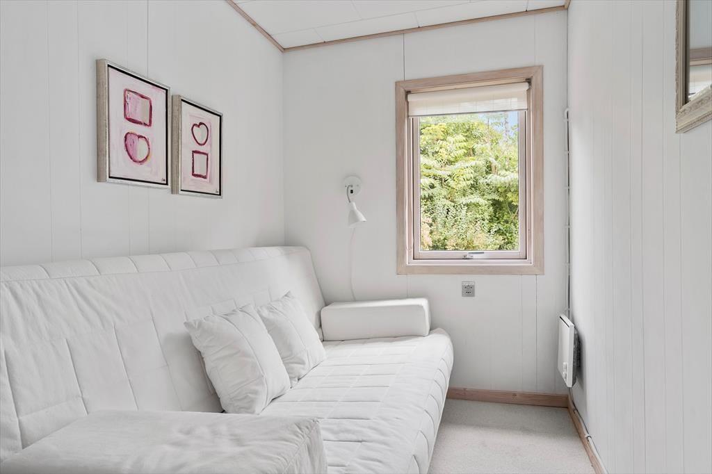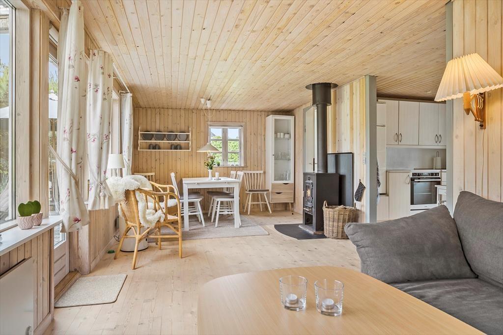 Dette er det ideelle sommerhus til at nyde hinandens selskab og lade feriestemningen indfinde sig. Sommerhuset er som et rigtigt sommerhus skal være med en afslappet og hyggeligt indretning. Husets indgang leder dig direkte ind i køkkenet som er i åben forbindelse med stuen. Stuen har et hyggeligt sofahjørne hvor også husets TV står. I stuen er der også brændeovn til de kolde aftener samt spiseplads. Huset har i alt 5 sovepladser fordelt på 2 værelser med dobbeltseng samt et værelse med en dobbelt sovesofa. Det ene soveværelse med dobbeltseng har adgang udefra. Derudover badeværelse med brus.