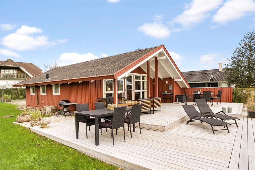 Med udgang fra stuen er en dejlig sydvendt træterrasse, der er delvist overdækket. Her er gode havemøbler samt loungemøbler og solstole, så der er rig mulighed for at samles til hygge på terrassen eller nyde solen i godt vejr. Der er en grill til rådighed, så om sommeren kan terrassen blive samlingspunktet for dagens måltider.
